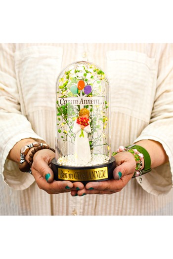 Kurdelesiyle şıklığı tamamlanmış, küçük boy elma cam fanus içerisinde tasarladığımız bu çok güzel teraryum; beyaz kum, kurutulmuş bitkiler, şoklanmış yosun, yapay güller, bir adet mantar ev, ikili kalp ve kız bebek objelerle kurgulanmıştır. Ev ve ofis ortamlarının tamamında sergilenebilir teraryumun içinde, kurutulmuş ve şoklanmış bitkiler bulunduğundan hava alması önemlidir. Açık olan kısmının kapatılmaması veya büfe vb. kapalı alanlara konulmaması gereklidir. Özellikle her ortamda yıllarca, zevkle izlenebilecek özel bir teraryumdur. Yaklaşık Ölçüleri: 20x20cm NOT: Teraryumlarda kullanılan camlar, üfleme cam işçiliğiyle üretildiğinden bazı detaylarda farklılıklar gözlenebilir. Örneğin, sap kısmı ve ağız bitiş noktalarının her biri kendine özgüdür.