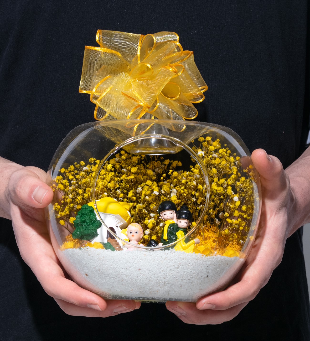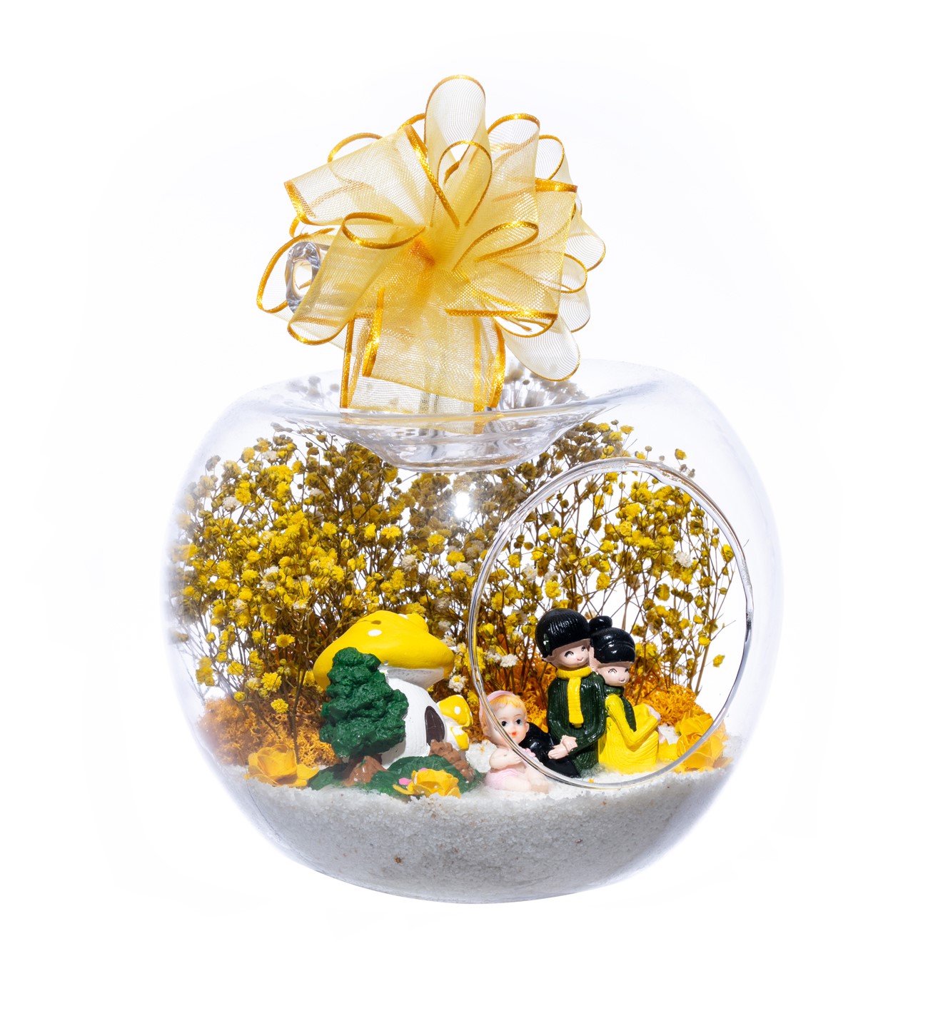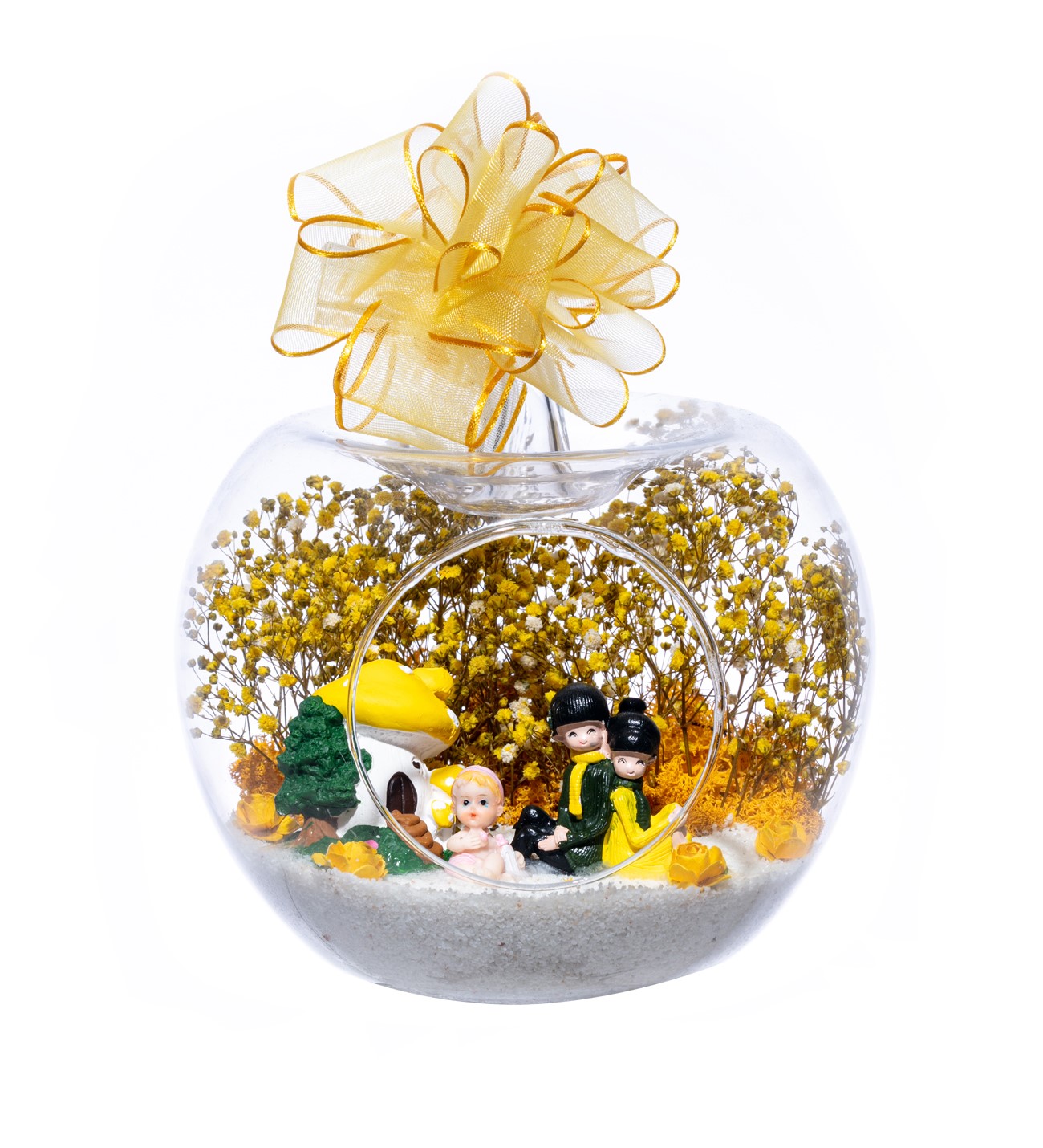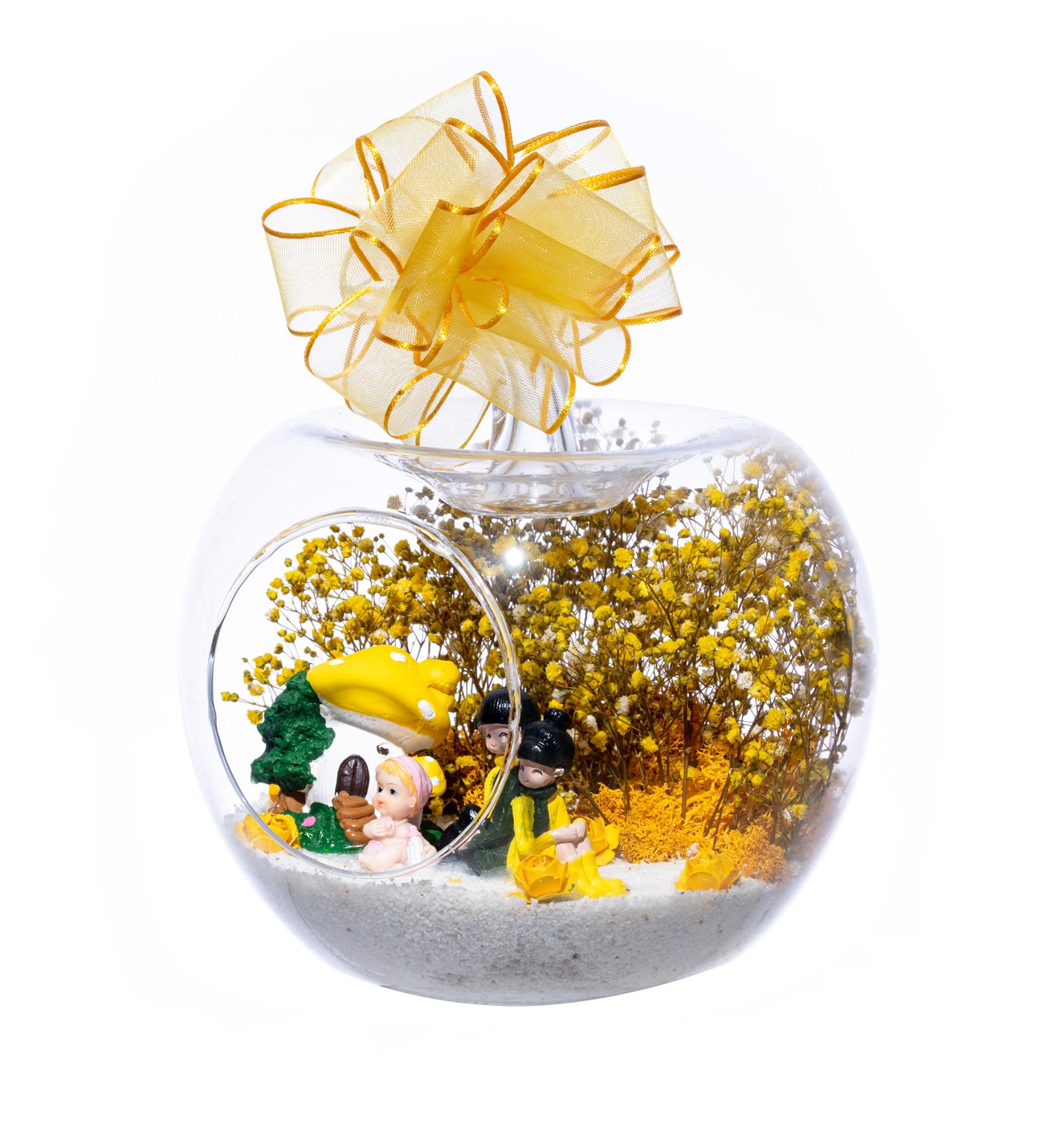 Üzerinde şık kurdelesiyle küçük boy elma cam fanus içerisinde tasarladığımız bu çok güzel teraryum; beyaz kum, şoklanmış yosunlar, kurutulmuş bitkiler, yapay güller, bir adet mantar ev, bir çift ebeveyni simgeleyen obje ve bir adet kız bebek obje kullanılarak tamamlanmıştır. Ev ve ofis ortamlarının tamamında sergilenebilir teraryumun içinde, kurutulmuş ve şoklanmış bitkiler bulunduğundan hava alması önemlidir. Açık olan kısmının kapatılmaması veya büfe vb. kapalı alanlara konulmaması gereklidir. Özellikle her ortamda yıllarca, zevkle izlenebilecek özel bir teraryumdur. Yaklaşık Ölçüleri: 20x20cm NOT: Teraryumlarda kullanılan camlar, üfleme cam işçiliğiyle üretildiğinden bazı detaylarda farklılıklar gözlenebilir. Örneğin, sap kısmı ve ağız bitiş noktalarının her biri kendine özgüdür.