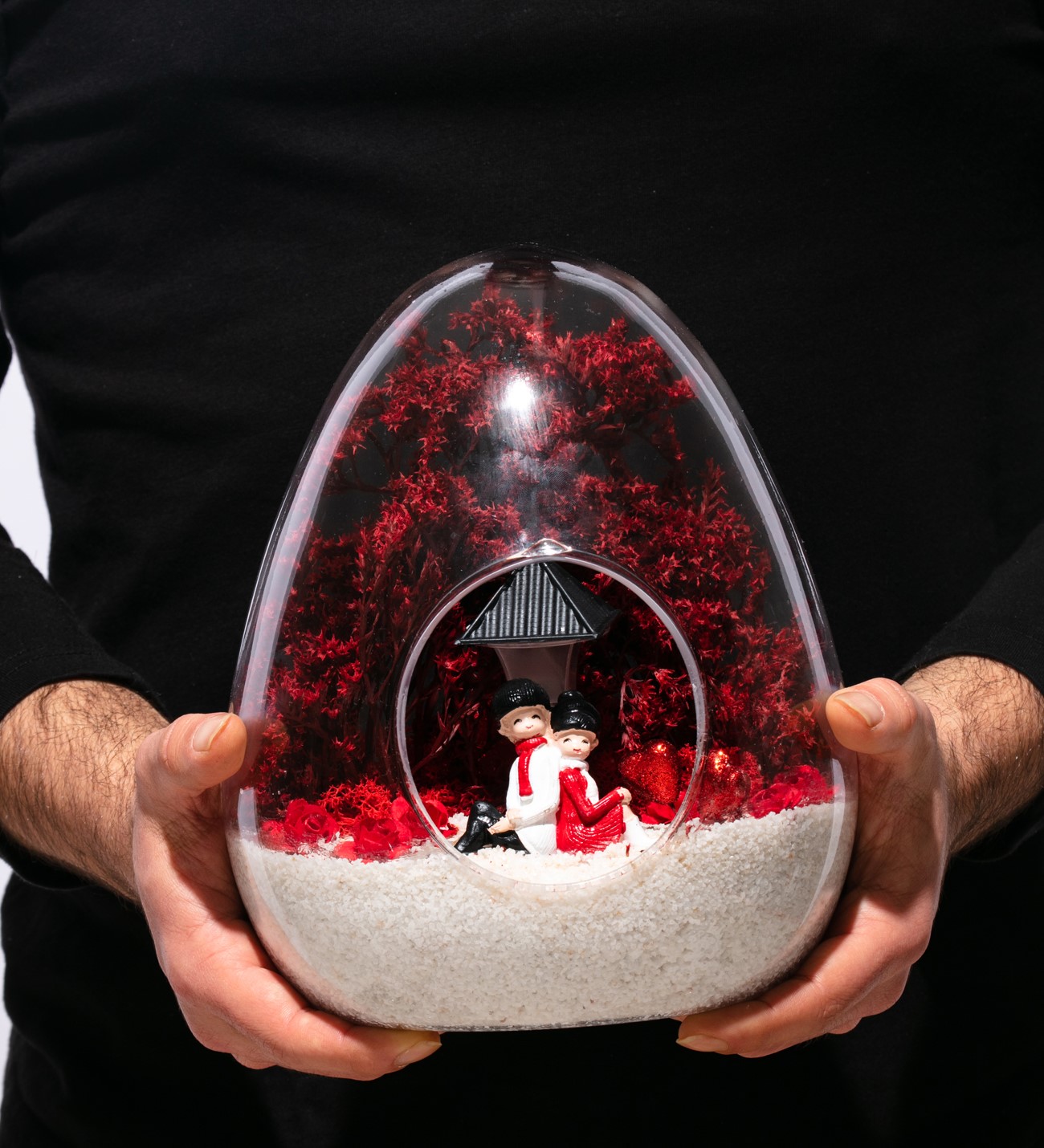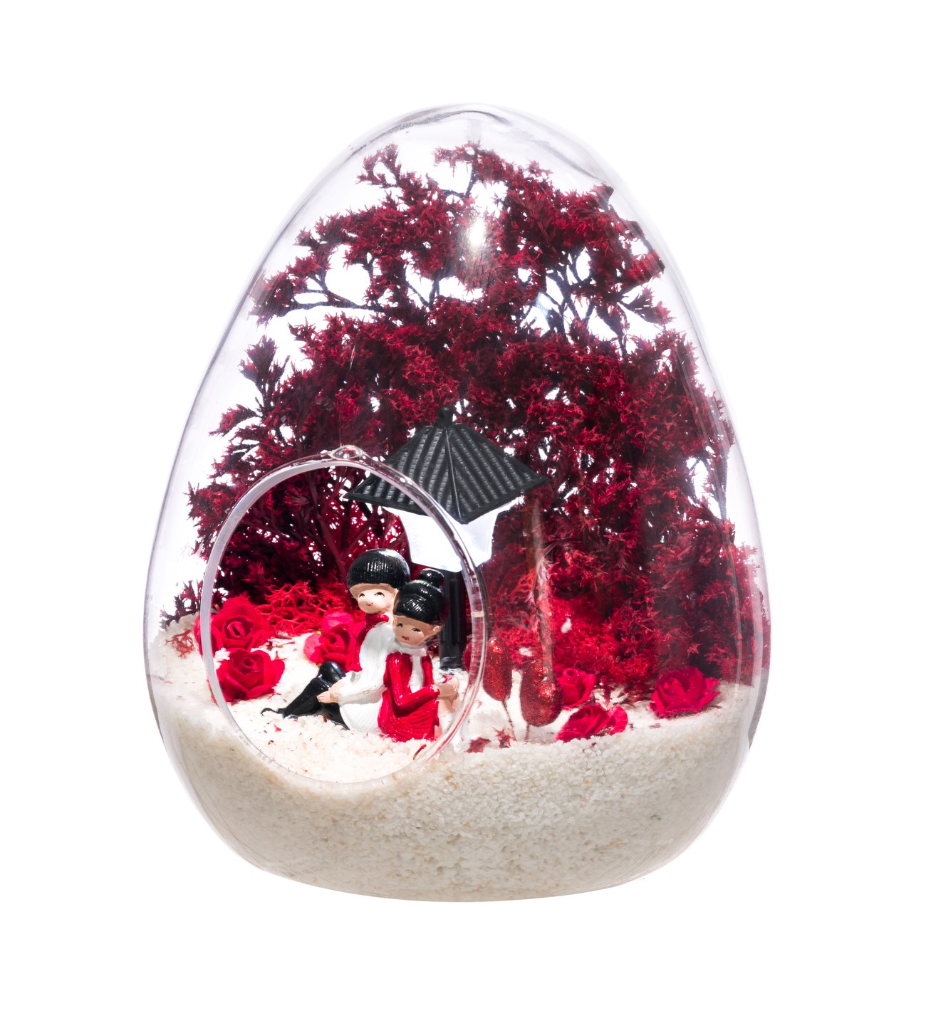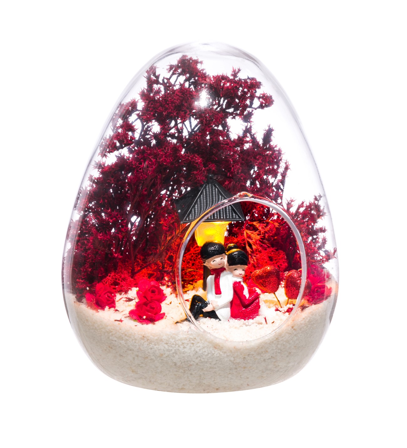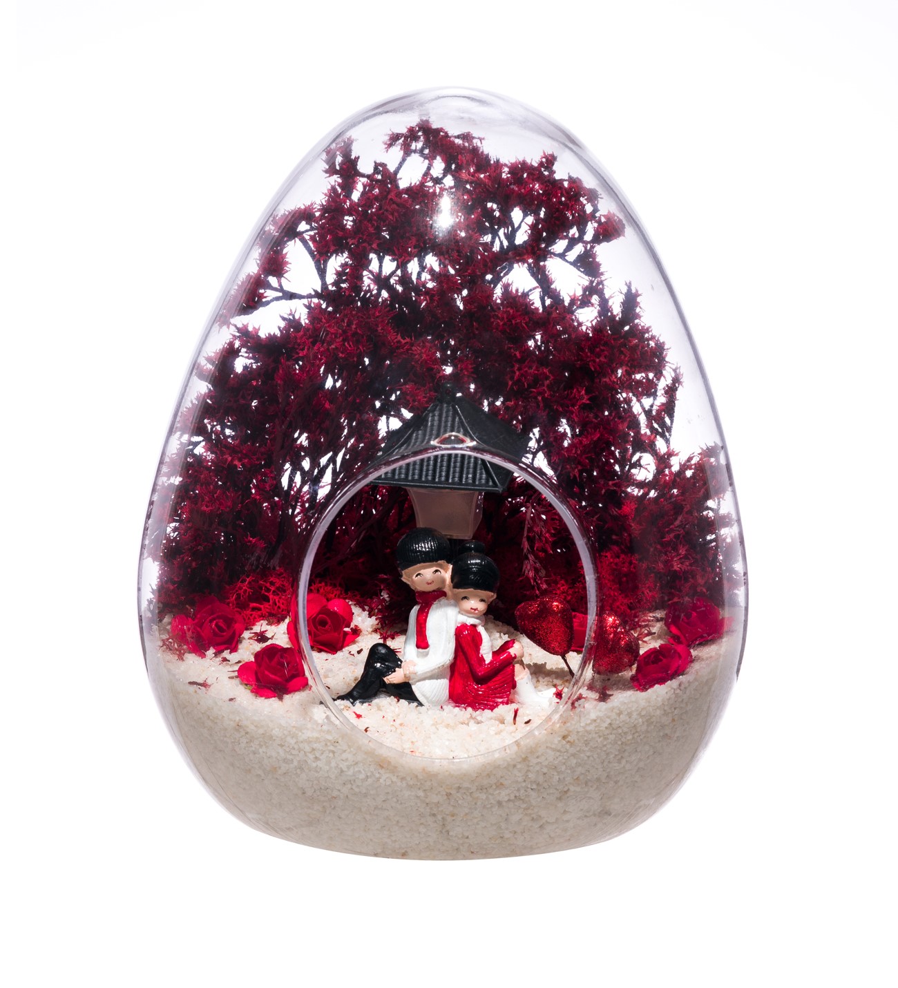 Küçük boy yumurta cam fanus içerisinde tasarladığımız bu güzel teraryum; beyaz kum, kurutulmuş bitkiler, şoklanmış yosunlar, yapay güller, iki adet simli kalp, bir adet ışığı iki farklı renkte yanan led sokak lambası görseli ve bir adet sırt sırta anın tadını çıkartan sevgilileri simgeleyen obje ile kurgulanmıştır. Ev ve ofis ortamlarının tamamında sergilenebilir teraryumun içinde, kurutulmuş ve şoklanmış bitkiler bulunduğundan hava alması önemlidir. Açık olan kısmının kapatılmaması veya büfe vb. kapalı alanlara konulmaması gereklidir. Özellikle her ortamda yıllarca, zevkle izlenebilecek özel bir teraryumdur. Yaklaşık Ölçüleri: 18x22cm NOT: Teraryumlarda kullanılan camlar, üfleme cam işçiliğiyle üretildiğinden bazı detaylarda farklılıklar gözlenebilir. Örneğin, yumurta şekli ve ağız bitiş noktalarının her biri kendine özgüdür.