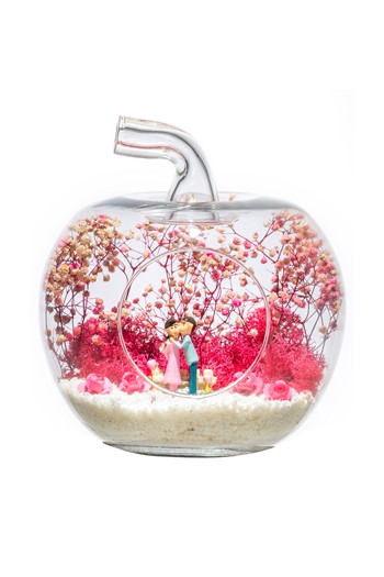 Küçük boy yumurta cam fanus içerisinde tasarladığımız bu güzel teraryum; beyaz kum, kurutulmuş bitkiler, şoklanmış yosunlar, yapay güller, bir adet ışığı iki farklı renkte yanan led sokak lambası görseli ve bir adet sırt sırta anın tadını çıkartan sevgilileri simgeleyen obje ile kurgulanmıştır. Ev ve ofis ortamlarının tamamında sergilenebilir teraryumun içinde, kurutulmuş ve şoklanmış bitkiler bulunduğundan hava alması önemlidir. Açık olan kısmının kapatılmaması veya büfe vb. kapalı alanlara konulmaması gereklidir. Özellikle her ortamda yıllarca, zevkle izlenebilecek özel bir teraryumdur. Yaklaşık Ölçüleri: 18x22cm NOT: Teraryumlarda kullanılan camlar, üfleme cam işçiliğiyle üretildiğinden bazı detaylarda farklılıklar gözlenebilir. Örneğin, yumurta şekli ve ağız bitiş noktalarının her biri kendine özgüdür.