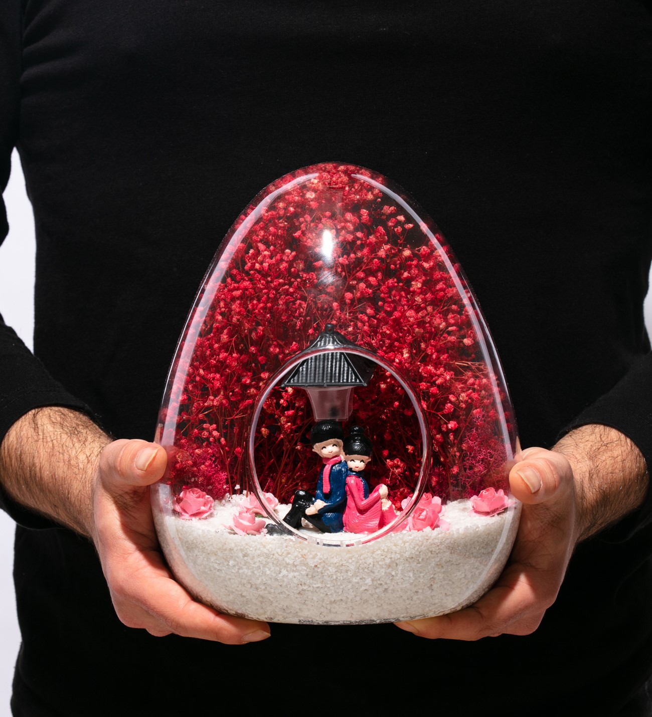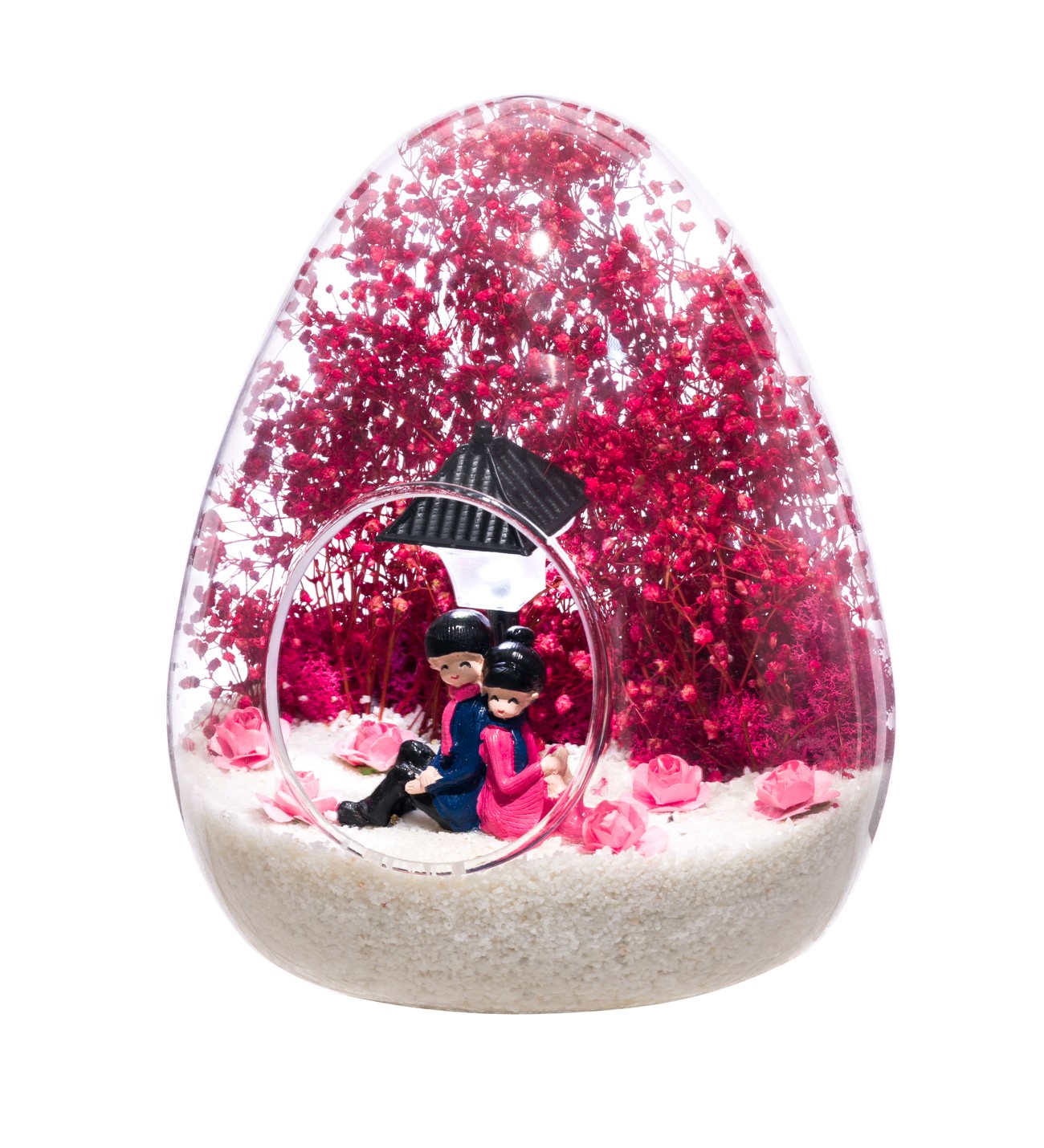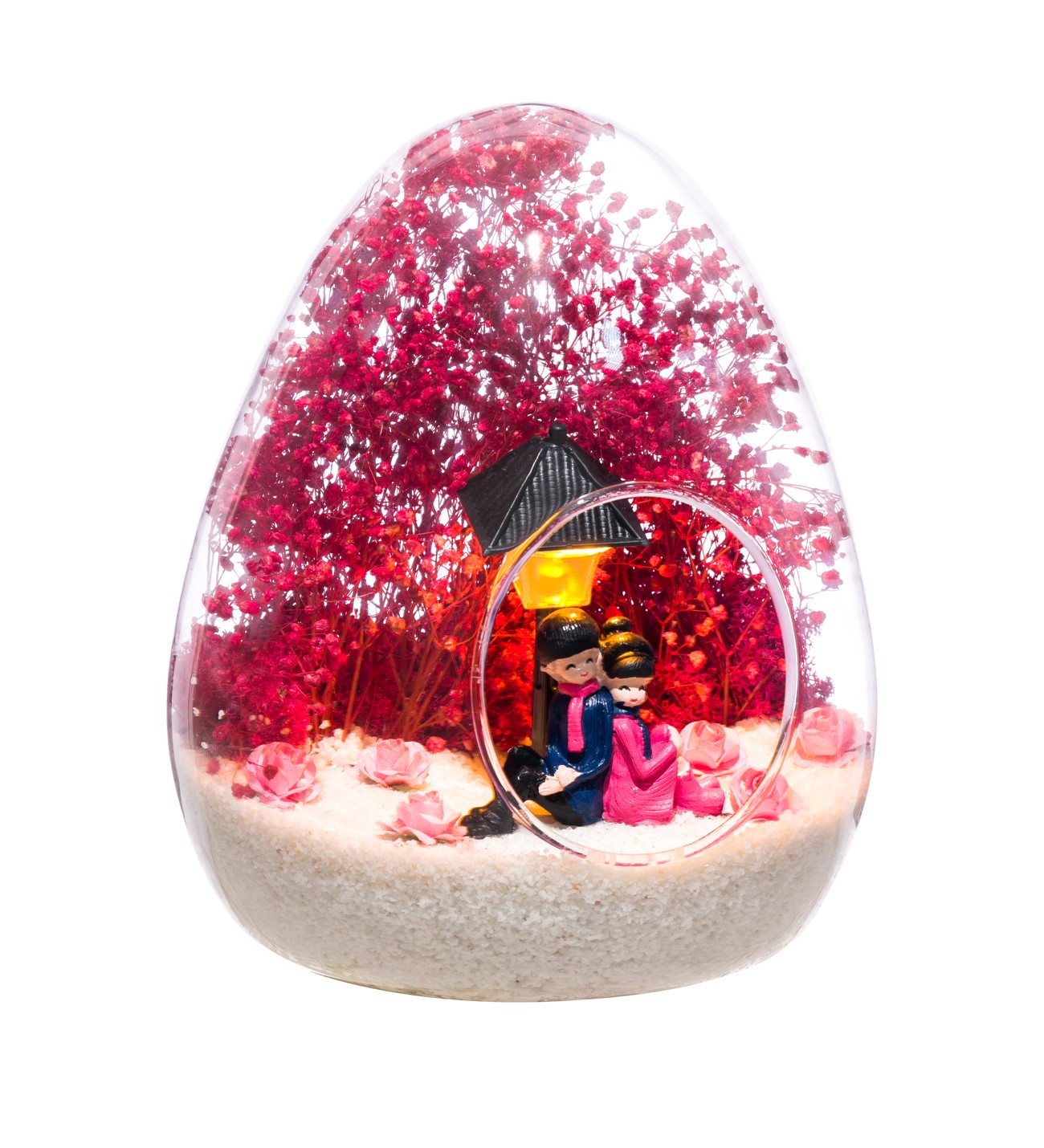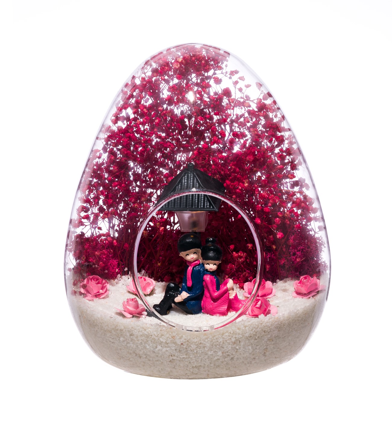 Küçük boy yumurta cam fanus içerisinde tasarladığımız bu güzel teraryum; beyaz kum, kurutulmuş bitkiler, şoklanmış yosunlar, yapay güller, bir adet ışığı iki farklı renkte yanan led sokak lambası görseli ve bir adet sırt sırta anın tadını çıkartan sevgilileri simgeleyen obje ile kurgulanmıştır. Ev ve ofis ortamlarının tamamında sergilenebilir teraryumun içinde, kurutulmuş ve şoklanmış bitkiler bulunduğundan hava alması önemlidir. Açık olan kısmının kapatılmaması veya büfe vb. kapalı alanlara konulmaması gereklidir. Özellikle her ortamda yıllarca, zevkle izlenebilecek özel bir teraryumdur. Yaklaşık Ölçüleri: 18x22cm NOT: Teraryumlarda kullanılan camlar, üfleme cam işçiliğiyle üretildiğinden bazı detaylarda farklılıklar gözlenebilir. Örneğin, yumurta şekli ve ağız bitiş noktalarının her biri kendine özgüdür.