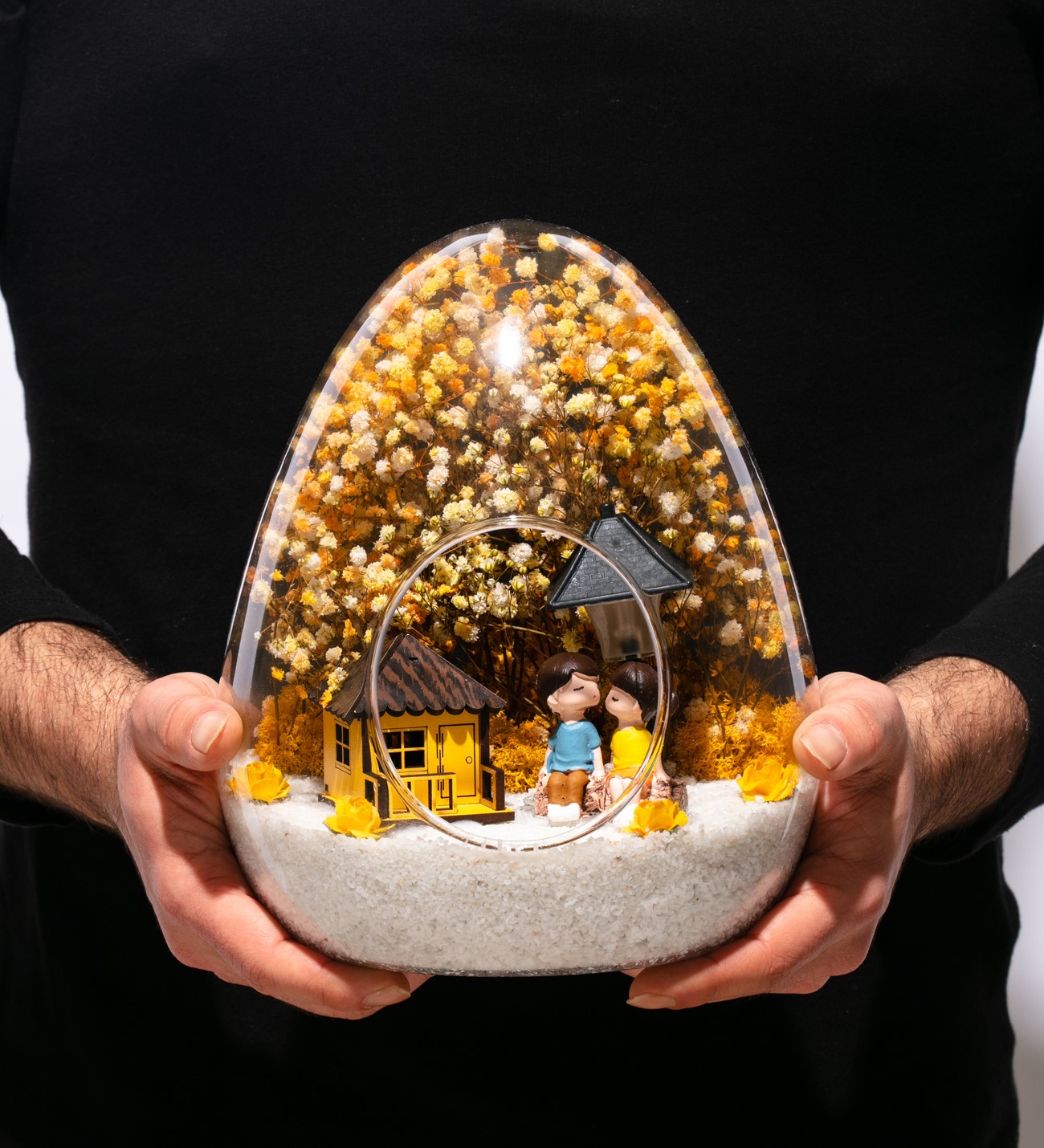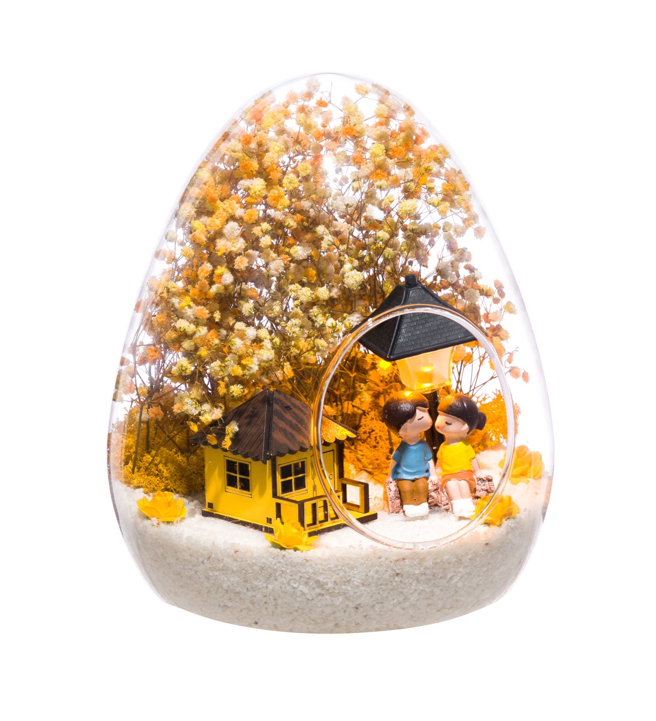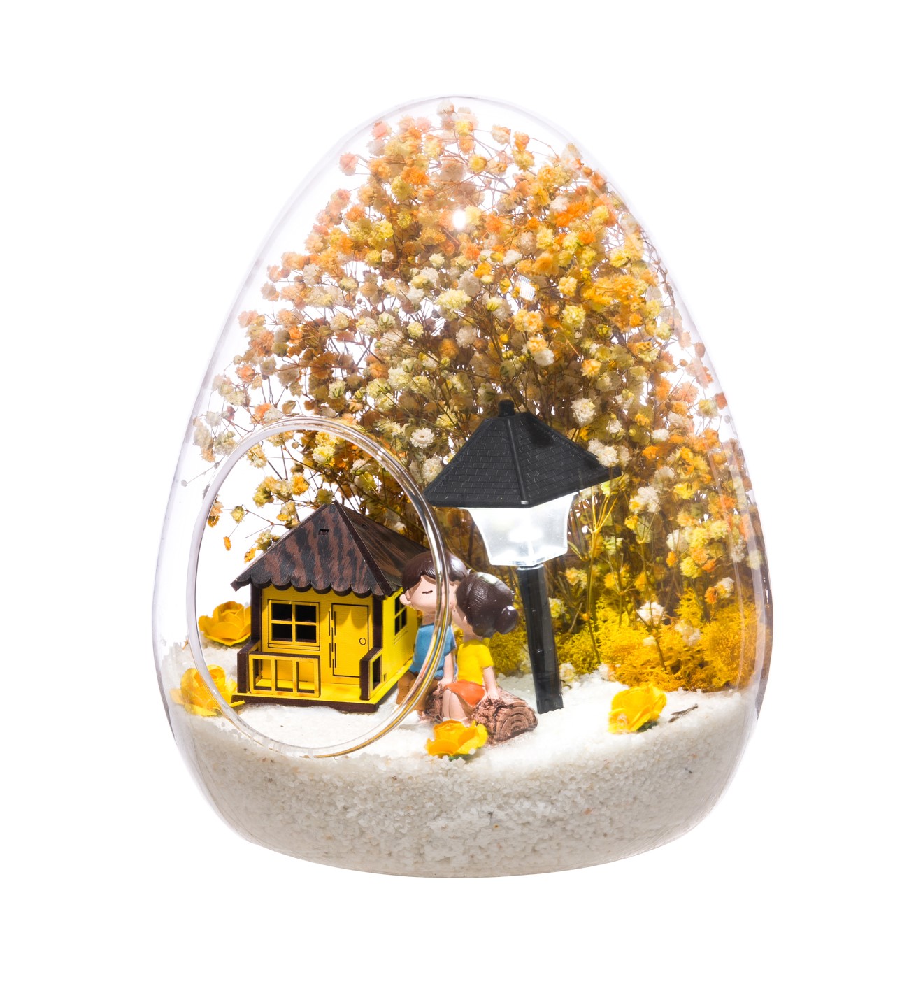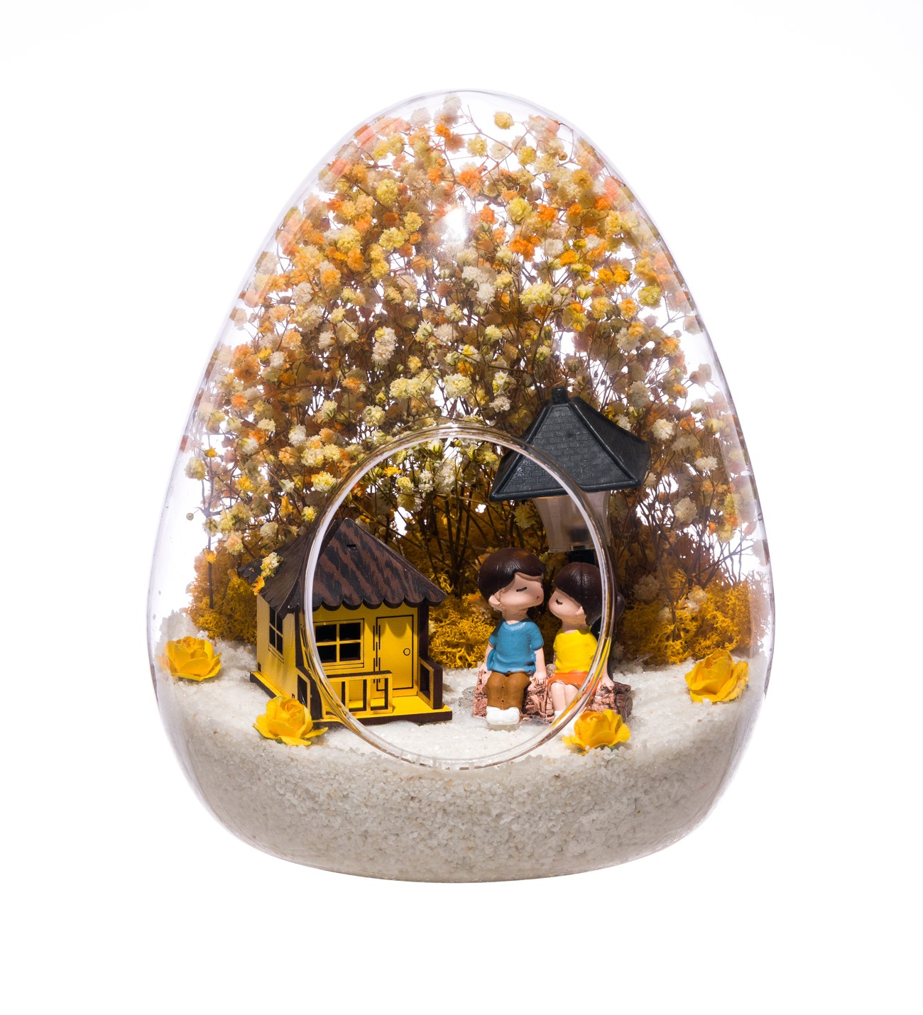Küçük boy yumurta cam fanus içerisinde tasarladığımız bu güzel teraryum; beyaz kum, kurutulmuş bitkiler, şoklanmış yosunlar, yapay güller, bir adet sarı ahşap ev görseli, bir adet ışığı iki farklı renkte yanan led sokak lambası görseli ve bir adet yan yana anın tadını çıkartan aşıkları simgeleyen obje kullanılarak tamamlanmıştır. Ev ve ofis ortamlarının tamamında sergilenebilir teraryumun içinde, kurutulmuş ve şoklanmış bitkiler bulunduğundan hava alması önemlidir. Açık olan kısmının kapatılmaması veya büfe vb. kapalı alanlara konulmaması gereklidir. Özellikle her ortamda yıllarca, zevkle izlenebilecek özel bir teraryumdur. Yaklaşık Ölçüleri: 18x22cm NOT: Teraryumlarda kullanılan camlar, üfleme cam işçiliğiyle üretildiğinden bazı detaylarda farklılıklar gözlenebilir. Örneğin, yumurta şekli ve ağız bitiş noktalarının her biri kendine özgüdür.