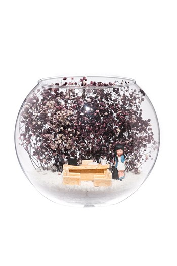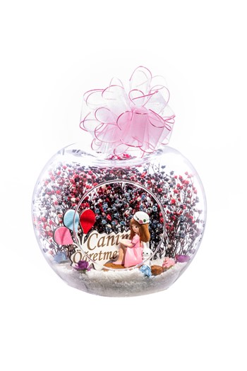 Kurdelesiyle şıklığı tamamlanmış, küçük boy elma cam fanus içerisinde tasarladığımız bu çok güzel teraryum; beyaz kum, kurutulmuş bitkiler, şoklanmış yosun, yapay güller, bir adet sırt sırta oturmuş mutlulukla bebeklerini seyreden anne-baba ve erkek bebek objelerle kurgulanmıştır. Ev ve ofis ortamlarının tamamında sergilenebilir teraryumun içinde, kurutulmuş ve şoklanmış bitkiler bulunduğundan hava alması önemlidir. Açık olan kısmının kapatılmaması veya büfe vb. kapalı alanlara konulmaması gereklidir. Özellikle her ortamda yıllarca, zevkle izlenebilecek özel bir teraryumdur. Yaklaşık Ölçüleri: 20x20cm NOT: Teraryumlarda kullanılan camlar, üfleme cam işçiliğiyle üretildiğinden bazı detaylarda farklılıklar gözlenebilir. Örneğin, sap kısmı ve ağız bitiş noktalarının her biri kendine özgüdür.
