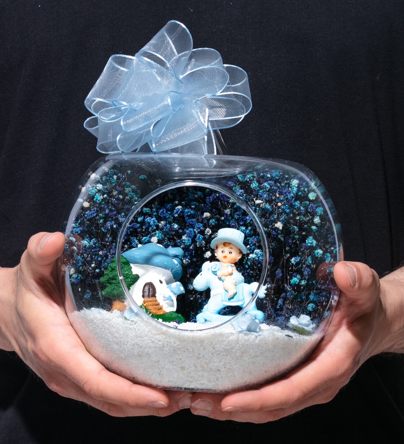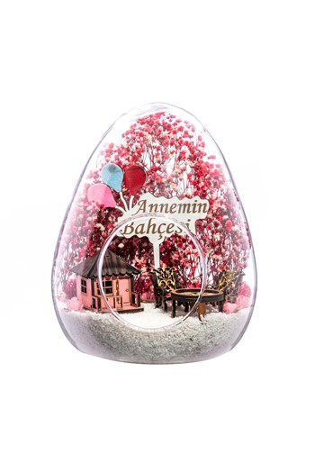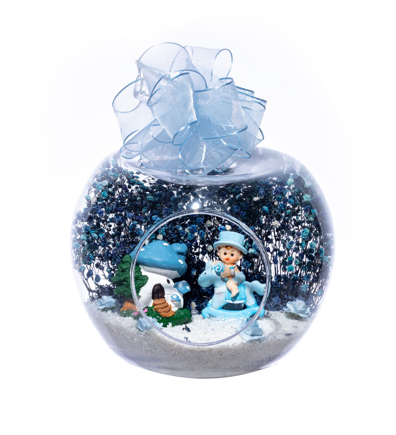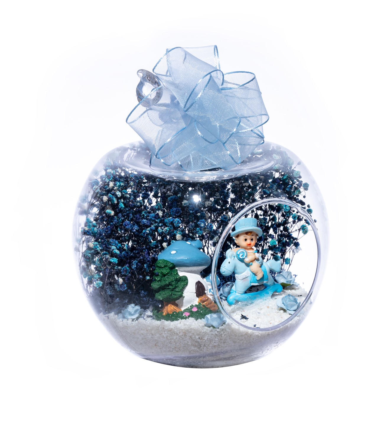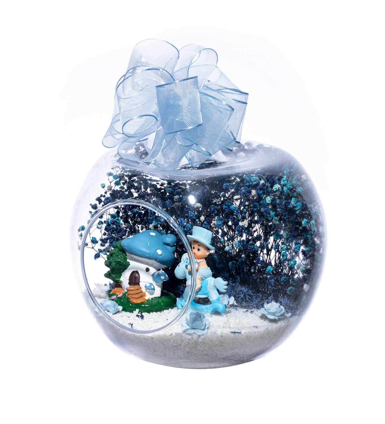 Üzerinde şık kurdelesiyle küçük boy elma cam fanus içerisinde tasarladığımız bu çok güzel teraryum; beyaz kum, şoklanmış yosunlar, kurutulmuş bitkiler, yapay güller, bir adet mantar ev ve bir adet atlı karınca oyuncağında oynayan şapkalı erkek bebek obje kullanılarak tamamlanmıştır. Ev ve ofis ortamlarının tamamında sergilenebilir teraryumun içinde, kurutulmuş ve şoklanmış bitkiler bulunduğundan hava alması önemlidir. Açık olan kısmının kapatılmaması veya büfe vb. kapalı alanlara konulmaması gereklidir. Özellikle her ortamda yıllarca, zevkle izlenebilecek özel bir teraryumdur. Yaklaşık Ölçüleri: 20x20cm NOT: Teraryumlarda kullanılan camlar, üfleme cam işçiliğiyle üretildiğinden bazı detaylarda farklılıklar gözlenebilir. Örneğin, sap kısmı ve ağız bitiş noktalarının her biri kendine özgüdür.