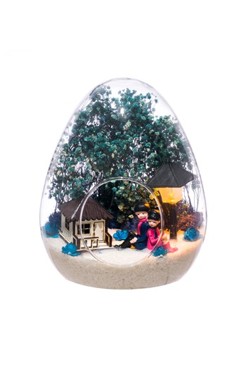 Üzerinde şık kurdelesiyle küçük boy elma cam fanus içerisinde tasarladığımız buçok güzelteraryum; beyaz kum, şoklanmış yosunlar, kurutulmuş bitkiler, yapay güller, bir adet mantar ev, bir adet ahşap beşikve bir adet uyuyanerkekbebek obje kullanılarak tamamlanmıştır. Ev ve ofis ortamlarının tamamında sergilenebilir teraryumun içinde,kurutulmuş ve şoklanmış bitkiler bulunduğundan hava alması önemlidir. Açık olan kısmının kapatılmaması veya büfe vb. kapalı alanlara konulmaması gereklidir. Özellikle her ortamda yıllarca, zevkle izlenebilecek özel bir teraryumdur. Yaklaşık Ölçüleri: 20x20cm NOT: Teraryumlarda kullanılan camlar, üfleme cam işçiliğiyle üretildiğinden bazı detaylarda farklılıklar gözlenebilir. Örneğin, sap kısmı ve ağız bitiş noktalarının her biri kendine özgüdür.