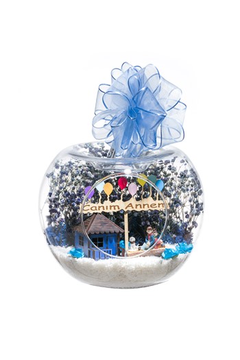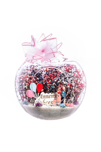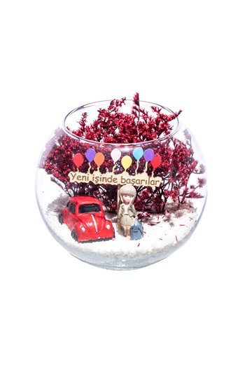 Üzerinde şık kurdelesiyle küçük boy elma cam fanus içerisinde tasarladığımız bu çok güzel teraryum; beyaz kum, şoklanmış yosunlar, kurutulmuş bitkiler, yapay güller, bir adet mantar ev ve bir adet bornozuyla oturan erkek bebek obje kullanılarak tamamlanmıştır. Ev ve ofis ortamlarının tamamında sergilenebilir teraryumun içinde, kurutulmuş ve şoklanmış bitkiler bulunduğundan hava alması önemlidir. Açık olan kısmının kapatılmaması veya büfe vb. kapalı alanlara konulmaması gereklidir. Özellikle her ortamda yıllarca, zevkle izlenebilecek özel bir teraryumdur. Yaklaşık Ölçüleri: 20x20cm NOT: Teraryumlarda kullanılan camlar, üfleme cam işçiliğiyle üretildiğinden bazı detaylarda farklılıklar gözlenebilir. Örneğin, sap kısmı ve ağız bitiş noktalarının her biri kendine özgüdür.