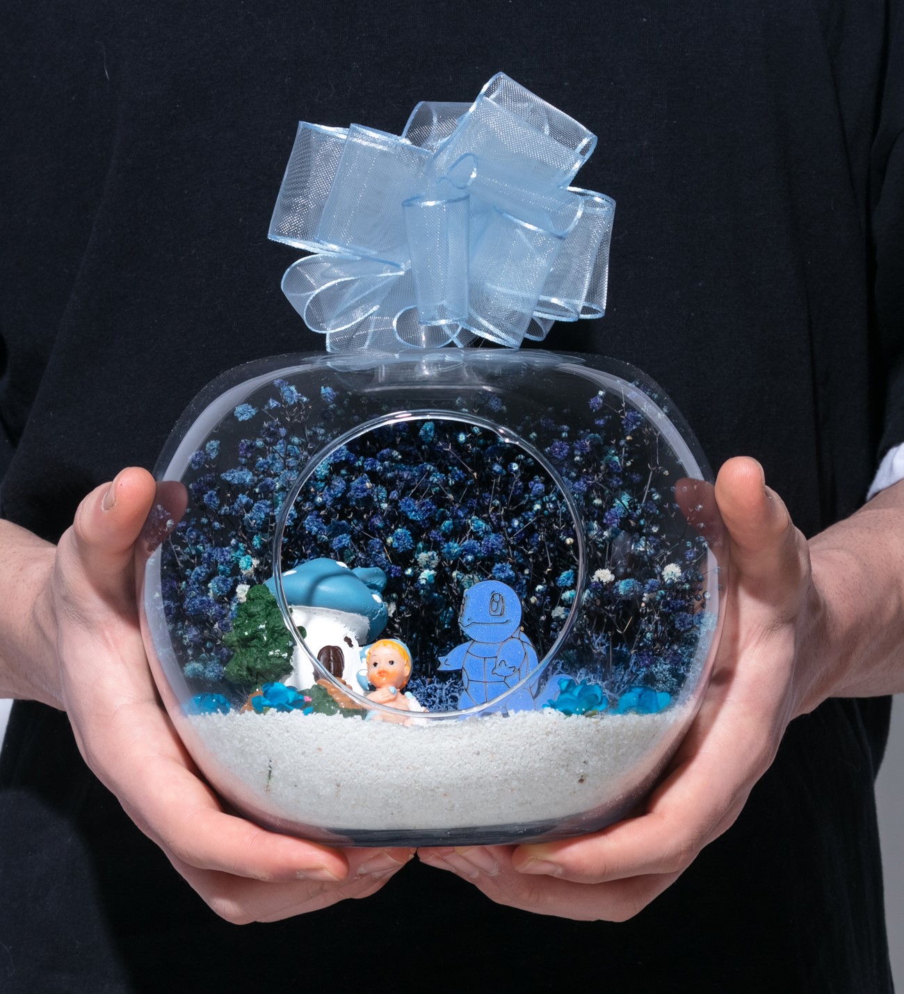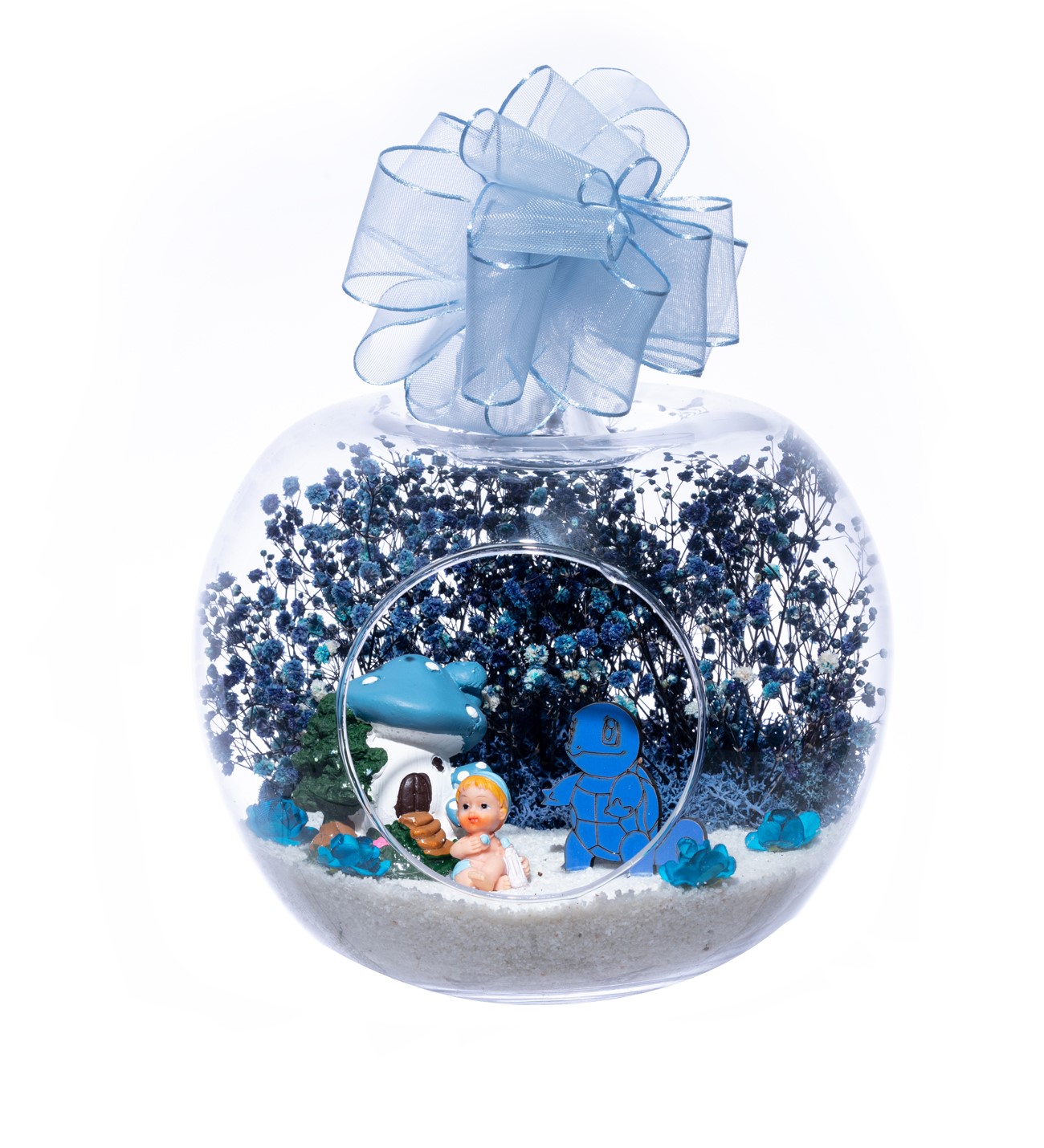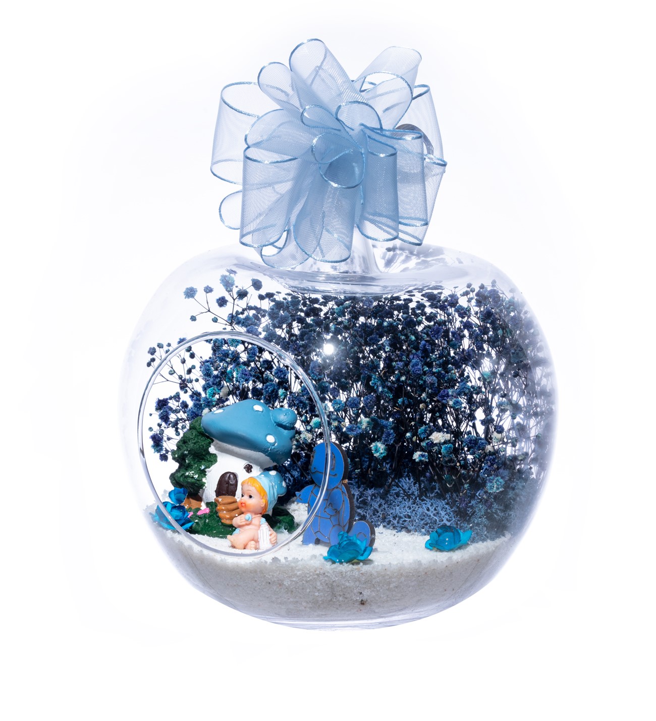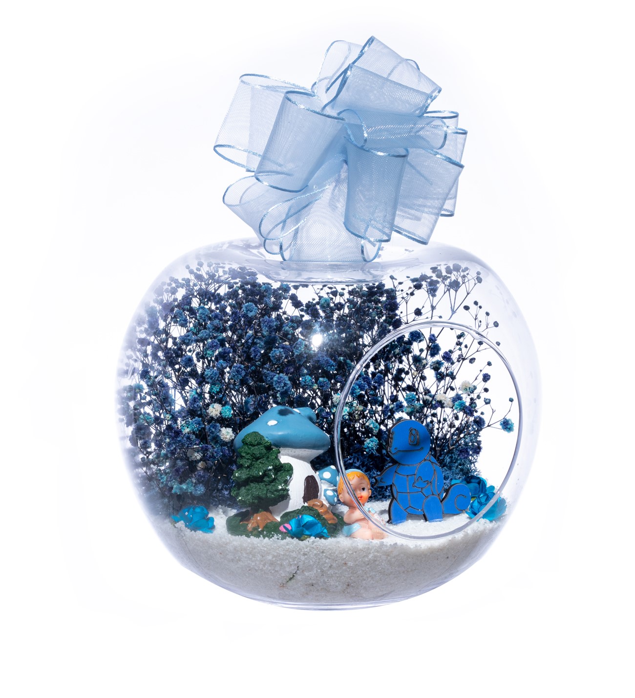 Üzerinde şık kurdelesiyle küçük boy elma cam fanus içerisinde tasarladığımız buçok güzelteraryum; beyaz kum, şoklanmış yosunlar, kurutulmuş bitkiler, yapay güller, bir adet mantar ev, bir adet pokemonsquirtle objeve bir adet erkekbebek obje kullanılarak tamamlanmıştır. Ev ve ofis ortamlarının tamamında sergilenebilir teraryumun içinde,kurutulmuş ve şoklanmış bitkiler bulunduğundan hava alması önemlidir. Açık olan kısmının kapatılmaması veya büfe vb. kapalı alanlara konulmaması gereklidir. Özellikle her ortamda yıllarca, zevkle izlenebilecek özel bir teraryumdur. Yaklaşık Ölçüleri: 20x20cm NOT: Teraryumlarda kullanılan camlar, üfleme cam işçiliğiyle üretildiğinden bazı detaylarda farklılıklar gözlenebilir. Örneğin, sap kısmı ve ağız bitiş noktalarının her biri kendine özgüdür.