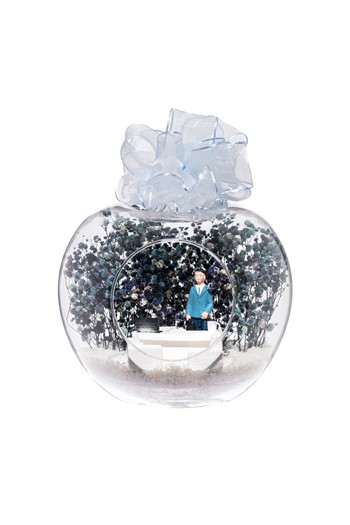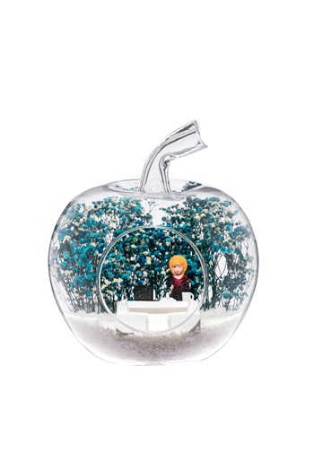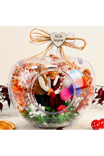 Üzerinde şık kurdelesiyle küçük boy elma cam fanus içerisinde tasarladığımız buçok güzelteraryum; beyaz kum, şoklanmış yosunlar, kurutulmuş bitkiler, yapay güller, bir adet mantar evve bir adet uçağında erkek bebek taşıyan ördekobje kullanılarak tamamlanmıştır. Ev ve ofis ortamlarının tamamında sergilenebilir teraryumun içinde,kurutulmuş ve şoklanmış bitkiler bulunduğundan hava alması önemlidir. Açık olan kısmının kapatılmaması veya büfe vb. kapalı alanlara konulmaması gereklidir. Özellikle her ortamda yıllarca, zevkle izlenebilecek özel bir teraryumdur. Yaklaşık Ölçüleri: 20x20cm NOT: Teraryumlarda kullanılan camlar, üfleme cam işçiliğiyle üretildiğinden bazı detaylarda farklılıklar gözlenebilir. Örneğin, sap kısmı ve ağız bitiş noktalarının her biri kendine özgüdür.