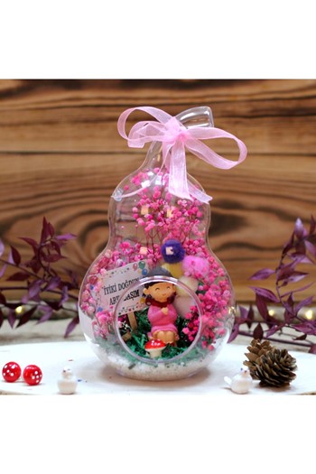 Kurdele ile tamamlanmış küçük boy elma cam fanus içerisinde tasarladığımız bu çok güzel teraryum; beyaz kum, şoklanmış yosunlar, kurutulmuş bitkiler, yapay güller, bir adet mantar ev ve bir atlı karıncada erkek bebeği simgeleyen objelerle tamamlanmıştır. Ev ve ofis ortamlarının tamamında sergilenebilir teraryumun içinde, kurutulmuş ve şoklanmış bitkiler bulunduğundan hava alması önemlidir. Açık olan kısmının kapatılmaması veya büfe vb. kapalı alanlara konulmaması gereklidir. Özellikle her ortamda yıllarca, zevkle izlenebilecek özel bir teraryumdur. Yaklaşık Ölçüleri: 20x20cm NOT: Teraryumlarda kullanılan camlar, üfleme cam işçiliğiyle üretildiğinden bazı detaylarda farklılıklar gözlenebilir. Örneğin, sap kısmı ve ağız bitiş noktalarının her biri kendine özgüdür.