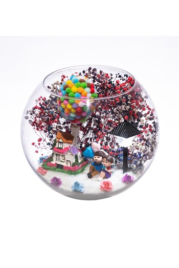 Kurdele ile tamamlanmış küçük boy elma cam fanus içerisinde tasarladığımız bu çok güzel teraryum; beyaz kum, şoklanmış yosunlar, kurutulmuş bitkiler, yapay güller, bir adet mantar ev ve bir atlı karıncadaerkek bebeği simgeleyen objelerle tamamlanmıştır. Ev ve ofis ortamlarının tamamında sergilenebilir teraryumun içinde,kurutulmuş ve şoklanmış bitkiler bulunduğundan hava alması önemlidir. Açık olan kısmının kapatılmaması veya büfe vb. kapalı alanlara konulmaması gereklidir. Özellikle her ortamda yıllarca, zevkle izlenebilecek özel bir teraryumdur. Yaklaşık Ölçüleri: 20x20cm NOT: Teraryumlarda kullanılan camlar, üfleme cam işçiliğiyle üretildiğinden bazı detaylarda farklılıklar gözlenebilir. Örneğin, sap kısmı ve ağız bitiş noktalarının her biri kendine özgüdür.