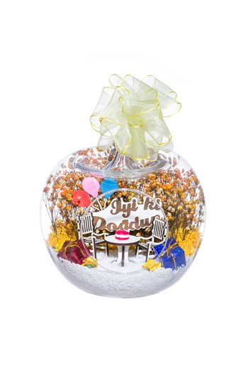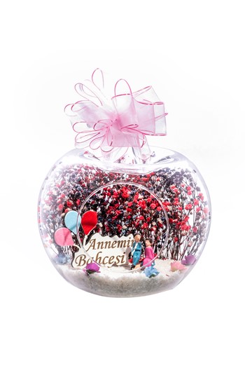 Üzerinde şık kurdelesiyle küçük boy elma cam fanus içerisinde tasarladığımız buçok güzelteraryum; beyaz kum, şoklanmış yosunlar, kurutulmuş bitkiler, yapay güller, bir adet mantar evve bir adet atlı karınca oyuncağında oynayan maskotşapkalı kızbebek obje kullanılarak tamamlanmıştır. Ev ve ofis ortamlarının tamamında sergilenebilir teraryumun içinde,kurutulmuş ve şoklanmış bitkiler bulunduğundan hava alması önemlidir. Açık olan kısmının kapatılmaması veya büfe vb. kapalı alanlara konulmaması gereklidir. Özellikle her ortamda yıllarca, zevkle izlenebilecek özel bir teraryumdur. Yaklaşık Ölçüleri: 20x20cm NOT: Teraryumlarda kullanılan camlar, üfleme cam işçiliğiyle üretildiğinden bazı detaylarda farklılıklar gözlenebilir. Örneğin, sap kısmı ve ağız bitiş noktalarının her biri kendine özgüdür.