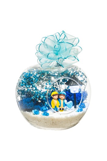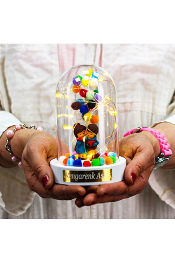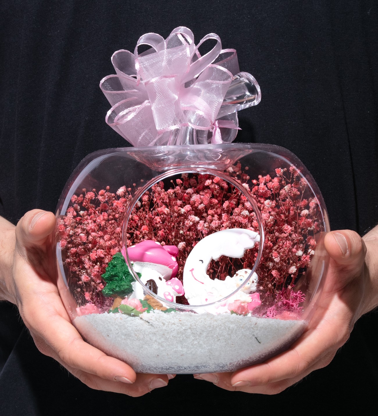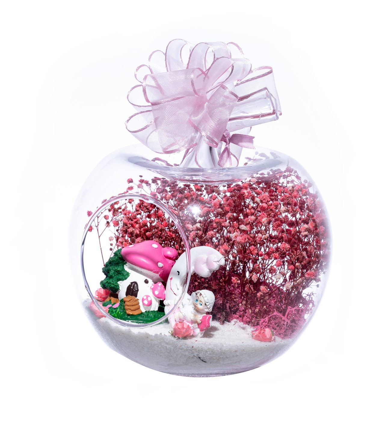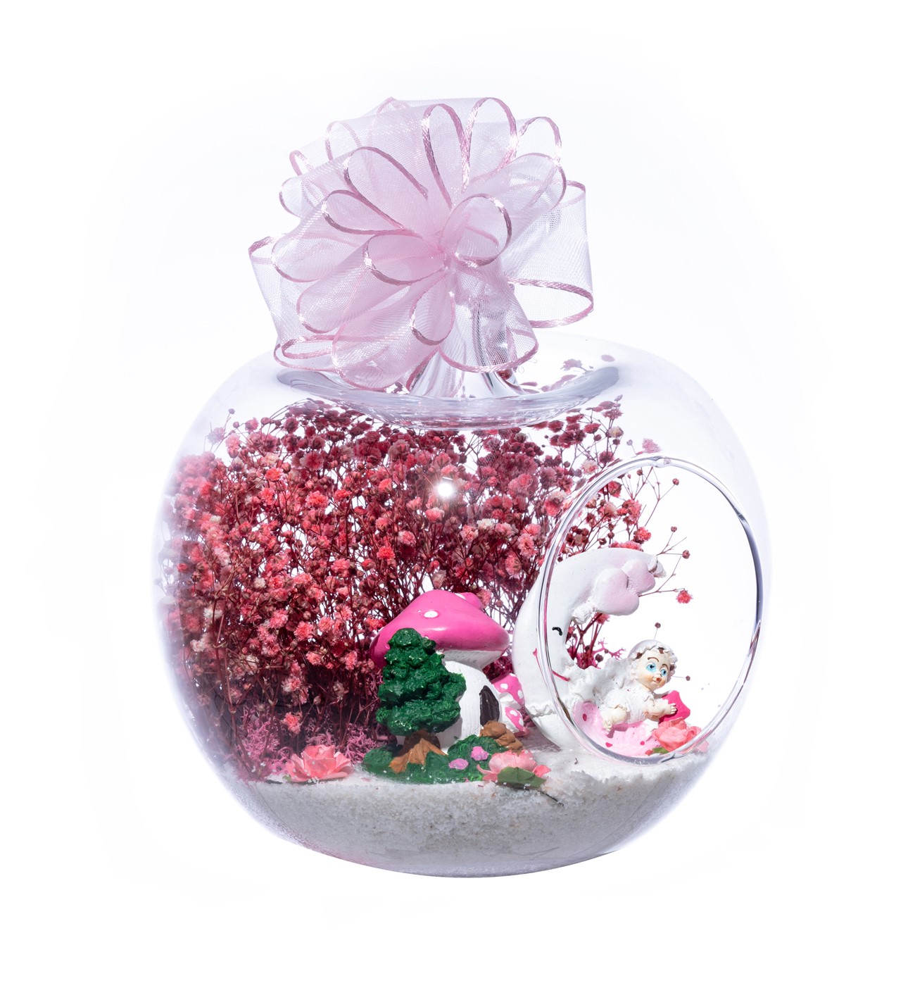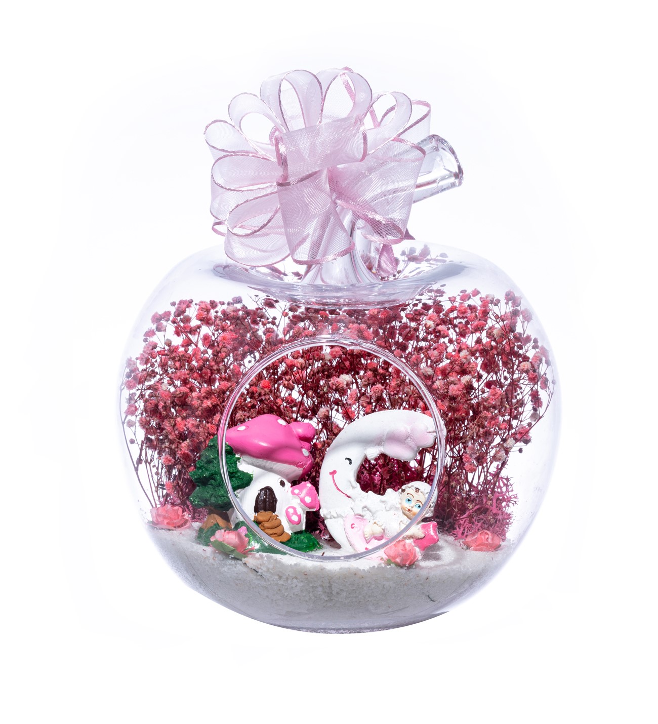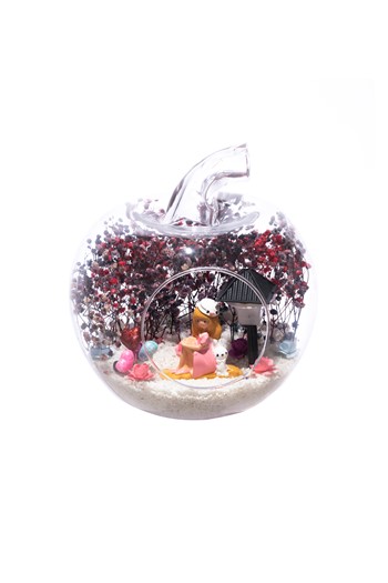 Üzerinde şık kurdelesiyle küçük boy elma cam fanus içerisinde tasarladığımız bu çok güzel teraryum; beyaz kum, şoklanmış yosunlar, kurutulmuş bitkiler, yapay güller, bir adet mantar ev ve bir adet aydede kucağında oturan kız bebek obje kullanılarak tamamlanmıştır. Ev ve ofis ortamlarının tamamında sergilenebilir teraryumun içinde, kurutulmuş ve şoklanmış bitkiler bulunduğundan hava alması önemlidir. Açık olan kısmının kapatılmaması veya büfe vb. kapalı alanlara konulmaması gereklidir. Özellikle her ortamda yıllarca, zevkle izlenebilecek özel bir teraryumdur. Yaklaşık Ölçüleri: 20x20cm NOT: Teraryumlarda kullanılan camlar, üfleme cam işçiliğiyle üretildiğinden bazı detaylarda farklılıklar gözlenebilir. Örneğin, sap kısmı ve ağız bitiş noktalarının her biri kendine özgüdür.