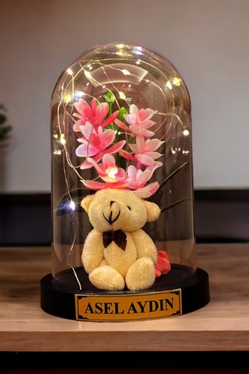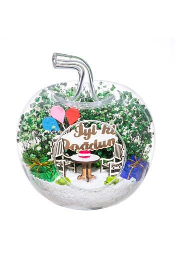 Üzerinde şık kurdelesiyle küçük boy elma cam fanus içerisinde tasarladığımız bu çok güzel teraryum; beyaz kum, şoklanmış yosunlar, kurutulmuş bitkiler, yapay güller, bir adet mantar ev, bir adet ahşap beşik ve bir adet uyuyan kız bebek obje kullanılarak tamamlanmıştır. Ev ve ofis ortamlarının tamamında sergilenebilir teraryumun içinde, kurutulmuş ve şoklanmış bitkiler bulunduğundan hava alması önemlidir. Açık olan kısmının kapatılmaması veya büfe vb. kapalı alanlara konulmaması gereklidir. Özellikle her ortamda yıllarca, zevkle izlenebilecek özel bir teraryumdur. Yaklaşık Ölçüleri: 20x20cm NOT: Teraryumlarda kullanılan camlar, üfleme cam işçiliğiyle üretildiğinden bazı detaylarda farklılıklar gözlenebilir. Örneğin, sap kısmı ve ağız bitiş noktalarının her biri kendine özgüdür.