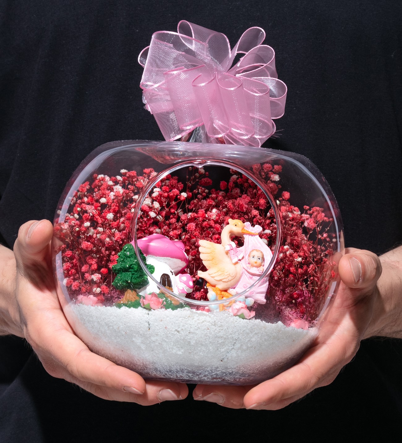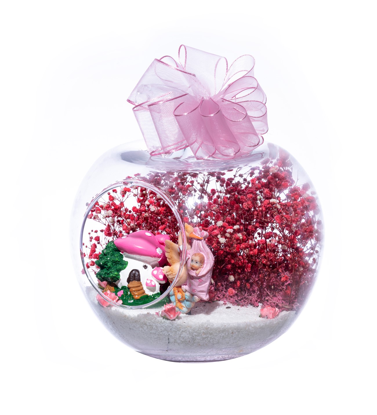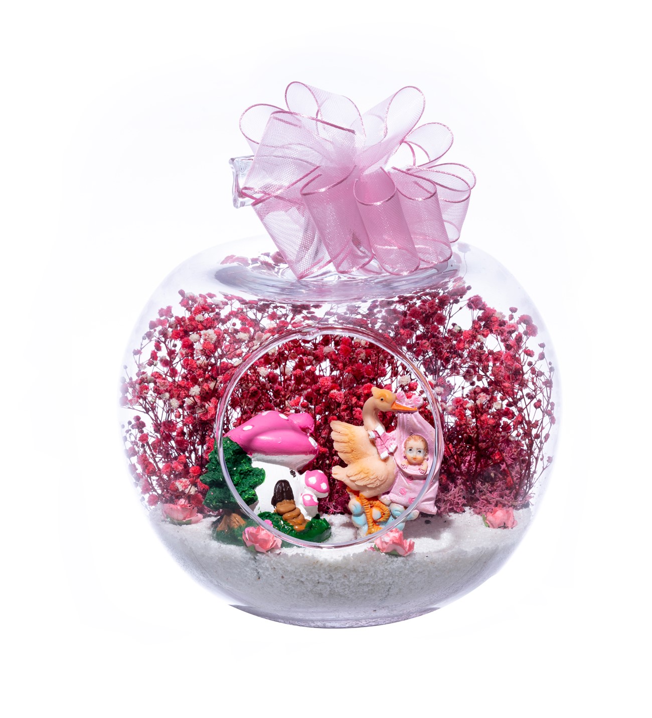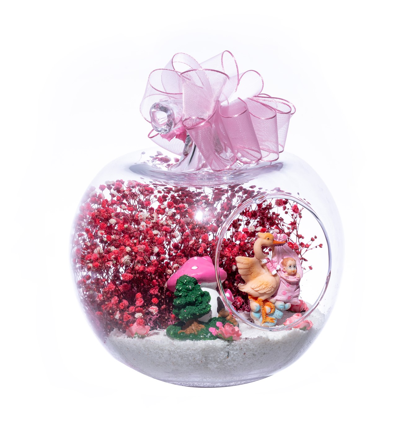 Üzerinde şık kurdelesiyle küçük boy elma cam fanus içerisinde tasarladığımız buçok güzelteraryum; beyaz kum, şoklanmış yosunlar, kurutulmuş bitkiler, yapay güller, bir adet mantar evve bir adet kundakta kız bebek taşıyan leylek obje kullanılarak tamamlanmıştır. Ev ve ofis ortamlarının tamamında sergilenebilir teraryumun içinde,kurutulmuş ve şoklanmış bitkiler bulunduğundan hava alması önemlidir. Açık olan kısmının kapatılmaması veya büfe vb. kapalı alanlara konulmaması gereklidir. Özellikle her ortamda yıllarca, zevkle izlenebilecek özel bir teraryumdur. Yaklaşık Ölçüleri: 20x20cm NOT: Teraryumlarda kullanılan camlar, üfleme cam işçiliğiyle üretildiğinden bazı detaylarda farklılıklar gözlenebilir. Örneğin, sap kısmı ve ağız bitiş noktalarının her biri kendine özgüdür.