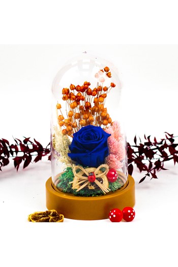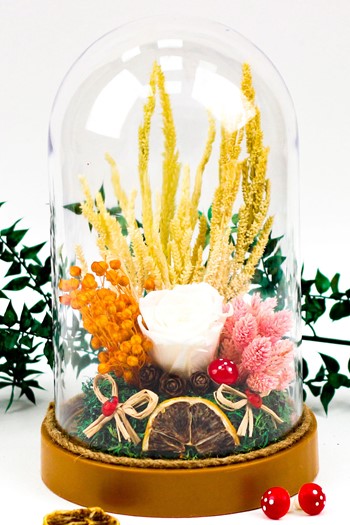 Kurdele ile tamamlanmış küçük boy elma cam fanus içerisinde tasarladığımız bu çok güzel teraryum; beyaz kum, şoklanmış yosunlar, kurutulmuş bitkiler, yapay güller, dört adet simli kalp ve leyleğin taşıdığı kundağında uyuyan kız bebeği simgeleyen objelerle tamamlanmıştır. Ev ve ofis ortamlarının tamamında sergilenebilir teraryumun içinde, kurutulmuş ve şoklanmış bitkiler bulunduğundan hava alması önemlidir. Açık olan kısmının kapatılmaması veya büfe vb. kapalı alanlara konulmaması gereklidir. Özellikle her ortamda yıllarca, zevkle izlenebilecek özel bir teraryumdur. Yaklaşık Ölçüleri: 20x20cm NOT: Teraryumlarda kullanılan camlar, üfleme cam işçiliğiyle üretildiğinden bazı detaylarda farklılıklar gözlenebilir. Örneğin, sap kısmı ve ağız bitiş noktalarının her biri kendine özgüdür.