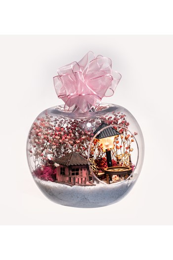 Kurdele ile tamamlanmış küçük boy elma cam fanus içerisinde tasarladığımız bu çok güzel teraryum; beyaz kum, şoklanmış yosunlar, kurutulmuş bitkiler, yapay güller, bir adet mantar ev ve bir leyleğin sürdüğü motorsiklette oturan kız bebeği simgeleyen objelerle tamamlanmıştır. Ev ve ofis ortamlarının tamamında sergilenebilir teraryumun içinde, kurutulmuş ve şoklanmış bitkiler bulunduğundan hava alması önemlidir. Açık olan kısmının kapatılmaması veya büfe vb. kapalı alanlara konulmaması gereklidir. Özellikle her ortamda yıllarca, zevkle izlenebilecek özel bir teraryumdur. Yaklaşık Ölçüleri: 20x20cm NOT: Teraryumlarda kullanılan camlar, üfleme cam işçiliğiyle üretildiğinden bazı detaylarda farklılıklar gözlenebilir. Örneğin, sap kısmı ve ağız bitiş noktalarının her biri kendine özgüdür.