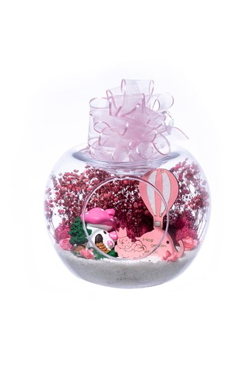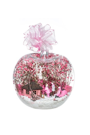 Üzerinde şık kurdelesiyle küçük boy elma cam fanus içerisinde tasarladığımız bu çok güzel teraryum; beyaz kum, şoklanmış yosunlar, kurutulmuş bitkiler, yapay güller, bir adet mantar ev, iki adet Şirinler karakteri obje ve bir adet kız bebek obje kullanılarak tamamlanmıştır. Ev ve ofis ortamlarının tamamında sergilenebilir teraryumun içinde, kurutulmuş ve şoklanmış bitkiler bulunduğundan hava alması önemlidir. Açık olan kısmının kapatılmaması veya büfe vb. kapalı alanlara konulmaması gereklidir. Özellikle her ortamda yıllarca, zevkle izlenebilecek özel bir teraryumdur. Yaklaşık Ölçüleri: 20x20cm NOT: Teraryumlarda kullanılan camlar, üfleme cam işçiliğiyle üretildiğinden bazı detaylarda farklılıklar gözlenebilir. Örneğin, sap kısmı ve ağız bitiş noktalarının her biri kendine özgüdür.