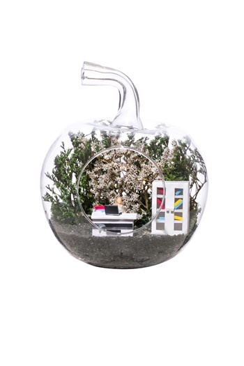 Üzerinde şık kurdelesiyle küçük boy elma cam fanus içerisinde tasarladığımız buçok güzelteraryum; beyaz kum, şoklanmış yosunlar, kurutulmuş bitkiler, yapay güller, bir adet mantar ev, bir adet Şirin karakteri objeve bir adet kız bebek obje kullanılarak tamamlanmıştır. Ev ve ofis ortamlarının tamamında sergilenebilir teraryumun içinde,kurutulmuş ve şoklanmış bitkiler bulunduğundan hava alması önemlidir. Açık olan kısmının kapatılmaması veya büfe vb. kapalı alanlara konulmaması gereklidir. Özellikle her ortamda yıllarca, zevkle izlenebilecek özel bir teraryumdur. Yaklaşık Ölçüleri: 20x20cm NOT: Teraryumlarda kullanılan camlar, üfleme cam işçiliğiyle üretildiğinden bazı detaylarda farklılıklar gözlenebilir. Örneğin, sap kısmı ve ağız bitiş noktalarının her biri kendine özgüdür.