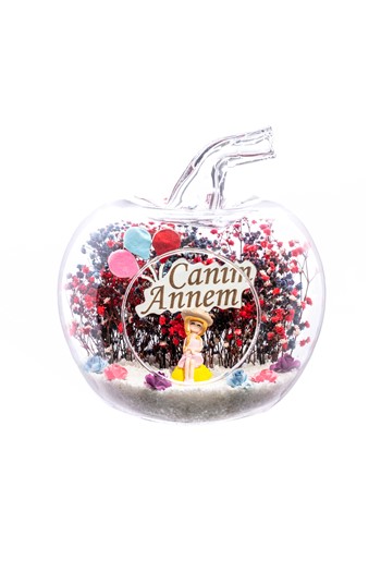 Kurdelesiyle şıklığı tamamlanmış, küçük boy elma cam fanus içerisinde tasarladığımız bu çok güzel teraryum; beyaz kum, kurutulmuş bitkiler, şoklanmış yosun, yapay güller, şeffaf kelebekler, ikili kalp ve annesinin kucağında kız bebek objeleriyle kurgulanmıştır. Ev ve ofis ortamlarının tamamında sergilenebilir teraryumun içinde, kurutulmuş ve şoklanmış bitkiler bulunduğundan hava alması önemlidir. Açık olan kısmının kapatılmaması veya büfe vb. kapalı alanlara konulmaması gereklidir. Özellikle her ortamda yıllarca, zevkle izlenebilecek özel bir teraryumdur. Yaklaşık Ölçüleri: 20x20cm NOT: Teraryumlarda kullanılan camlar, üfleme cam işçiliğiyle üretildiğinden bazı detaylarda farklılıklar gözlenebilir. Örneğin, sap kısmı ve ağız bitiş noktalarının her biri kendine özgüdür.