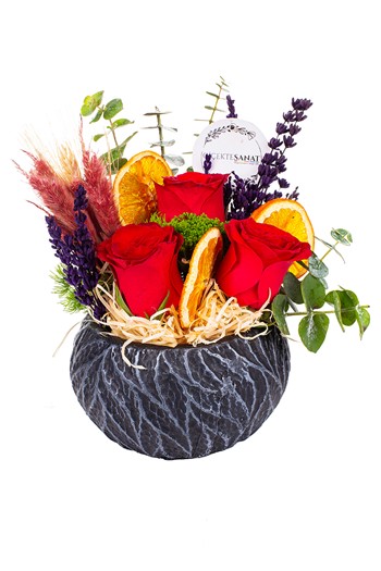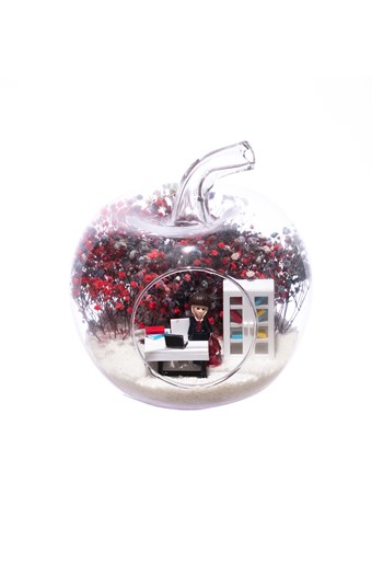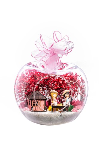 Üzerinde kurdelesiyle küçük boy elma cam fanus içerisinde tasarladığımız bu çok güzel teraryum; beyaz kum, şoklanmış yosunlar, kurutulmuş bitkiler, yapay güller, bir adet mavi mantar ev ve arabasının içinde gülümseyen bir adet erkek bebek kullanılarak tamamlanmıştır. Ev ve ofis ortamlarının tamamında sergilenebilir teraryumun içinde, kurutulmuş ve şoklanmış bitkiler bulunduğundan hava alması önemlidir. Açık olan kısmının kapatılmaması veya büfe vb. kapalı alanlara konulmaması gereklidir. Özellikle her ortamda yıllarca, zevkle izlenebilecek özel bir teraryumdur. Yaklaşık Ölçüleri: 20x20cm NOT: Teraryumlarda kullanılan camlar, üfleme cam işçiliğiyle üretildiğinden bazı detaylarda farklılıklar gözlenebilir. Örneğin, sap kısmı ve ağız bitiş noktalarının her biri kendine özgüdür.
