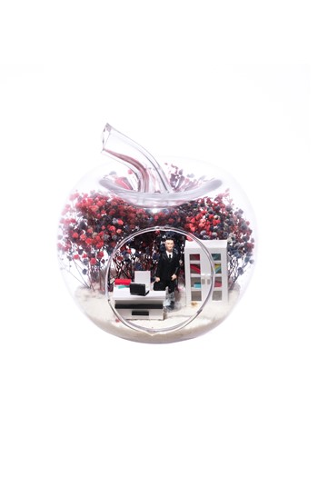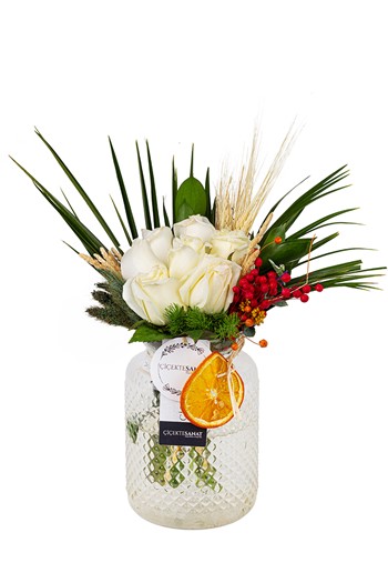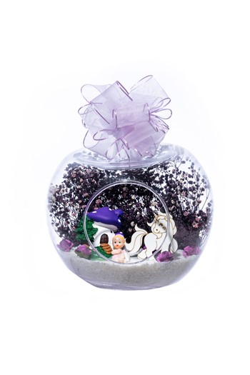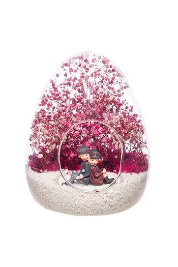 Üzerinde şık kurdelesiyle küçük boy elma cam fanus içerisinde tasarladığımız bu çok güzel teraryum; beyaz kum, şoklanmış yosunlar, kurutulmuş bitkiler, yapay güller, bir adet mantar ev, bir adet ahşap balonlu ayıcık ve bir adet uyuyan erkek bebek obje kullanılarak tamamlanmıştır. Ev ve ofis ortamlarının tamamında sergilenebilir teraryumun içinde, kurutulmuş ve şoklanmış bitkiler bulunduğundan hava alması önemlidir. Açık olan kısmının kapatılmaması veya büfe vb. kapalı alanlara konulmaması gereklidir. Özellikle her ortamda yıllarca, zevkle izlenebilecek özel bir teraryumdur. Yaklaşık Ölçüleri: 20x20cm NOT: Teraryumlarda kullanılan camlar, üfleme cam işçiliğiyle üretildiğinden bazı detaylarda farklılıklar gözlenebilir. Örneğin, sap kısmı ve ağız bitiş noktalarının her biri kendine özgüdür.