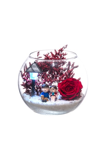 Üzerinde şık kurdelesiyle küçük boy elma cam fanus içerisinde tasarladığımız bu çok güzel teraryum; beyaz kum, şoklanmış yosunlar, kurutulmuş bitkiler, yapay güller, bir adet mantar ev, bir adet ahşap balonlu ayıcık ve bir adet uyuyan kız bebek obje kullanılarak tamamlanmıştır. Ev ve ofis ortamlarının tamamında sergilenebilir teraryumun içinde, kurutulmuş ve şoklanmış bitkiler bulunduğundan hava alması önemlidir. Açık olan kısmının kapatılmaması veya büfe vb. kapalı alanlara konulmaması gereklidir. Özellikle her ortamda yıllarca, zevkle izlenebilecek özel bir teraryumdur. Yaklaşık Ölçüleri: 20x20cm NOT: Teraryumlarda kullanılan camlar, üfleme cam işçiliğiyle üretildiğinden bazı detaylarda farklılıklar gözlenebilir. Örneğin, sap kısmı ve ağız bitiş noktalarının her biri kendine özgüdür.