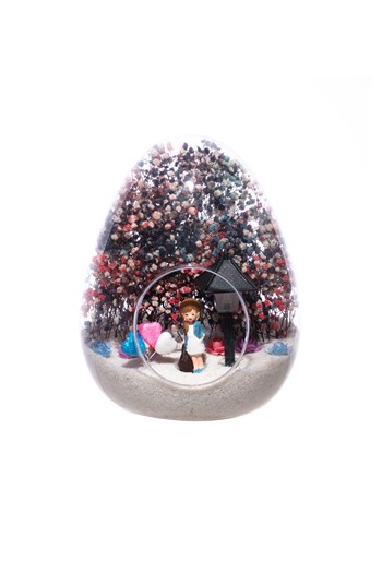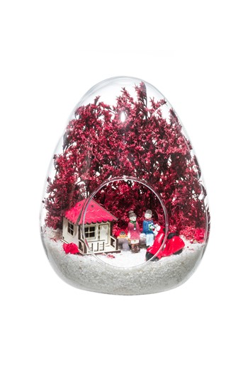 Üzerinde kurdelesiyle küçük boy elma cam fanus içerisinde tasarladığımız bu çok güzel teraryum; beyaz kum, şoklanmış yosunlar, kurutulmuş bitkiler, yapay güller, bir adet mavi mantar ev, annesinin kucağında bir adet erkek bebek kullanılarak tamamlanmıştır. Ev ve ofis ortamlarının tamamında sergilenebilir teraryumun içinde, kurutulmuş ve şoklanmış bitkiler bulunduğundan hava alması önemlidir. Açık olan kısmının kapatılmaması veya büfe vb. kapalı alanlara konulmaması gereklidir. Özellikle her ortamda yıllarca, zevkle izlenebilecek özel bir teraryumdur. Yaklaşık Ölçüleri: 20x20cm NOT: Teraryumlarda kullanılan camlar, üfleme cam işçiliğiyle üretildiğinden bazı detaylarda farklılıklar gözlenebilir. Örneğin, sap kısmı ve ağız bitiş noktalarının her biri kendine özgüdür.
