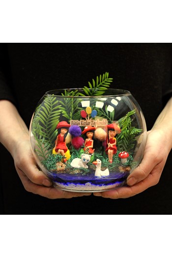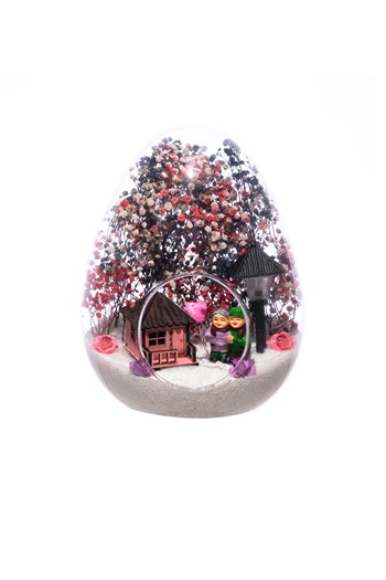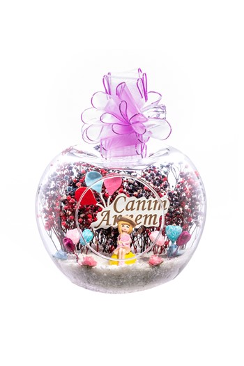 Üzerinde kurdelesiyle küçük boy elma cam fanus içerisinde tasarladığımız bu çok güzel teraryum; beyaz kum, şoklanmış yosunlar, kurutulmuş bitkiler, yapay güller, bir adet pembe mantar ev ve leyleğin taşıdığı bir adet şirin kız bebek kullanılarak tamamlanmıştır. Ev ve ofis ortamlarının tamamında sergilenebilir teraryumun içinde, kurutulmuş ve şoklanmış bitkiler bulunduğundan hava alması önemlidir. Açık olan kısmının kapatılmaması veya büfe vb. kapalı alanlara konulmaması gereklidir. Özellikle her ortamda yıllarca, zevkle izlenebilecek özel bir teraryumdur. Yaklaşık Ölçüleri: 20x20cm NOT: Teraryumlarda kullanılan camlar, üfleme cam işçiliğiyle üretildiğinden bazı detaylarda farklılıklar gözlenebilir. Örneğin, sap kısmı ve ağız bitiş noktalarının her biri kendine özgüdür.
