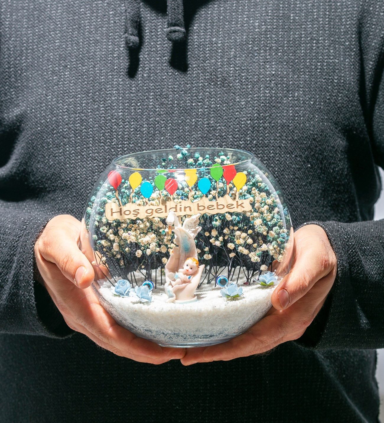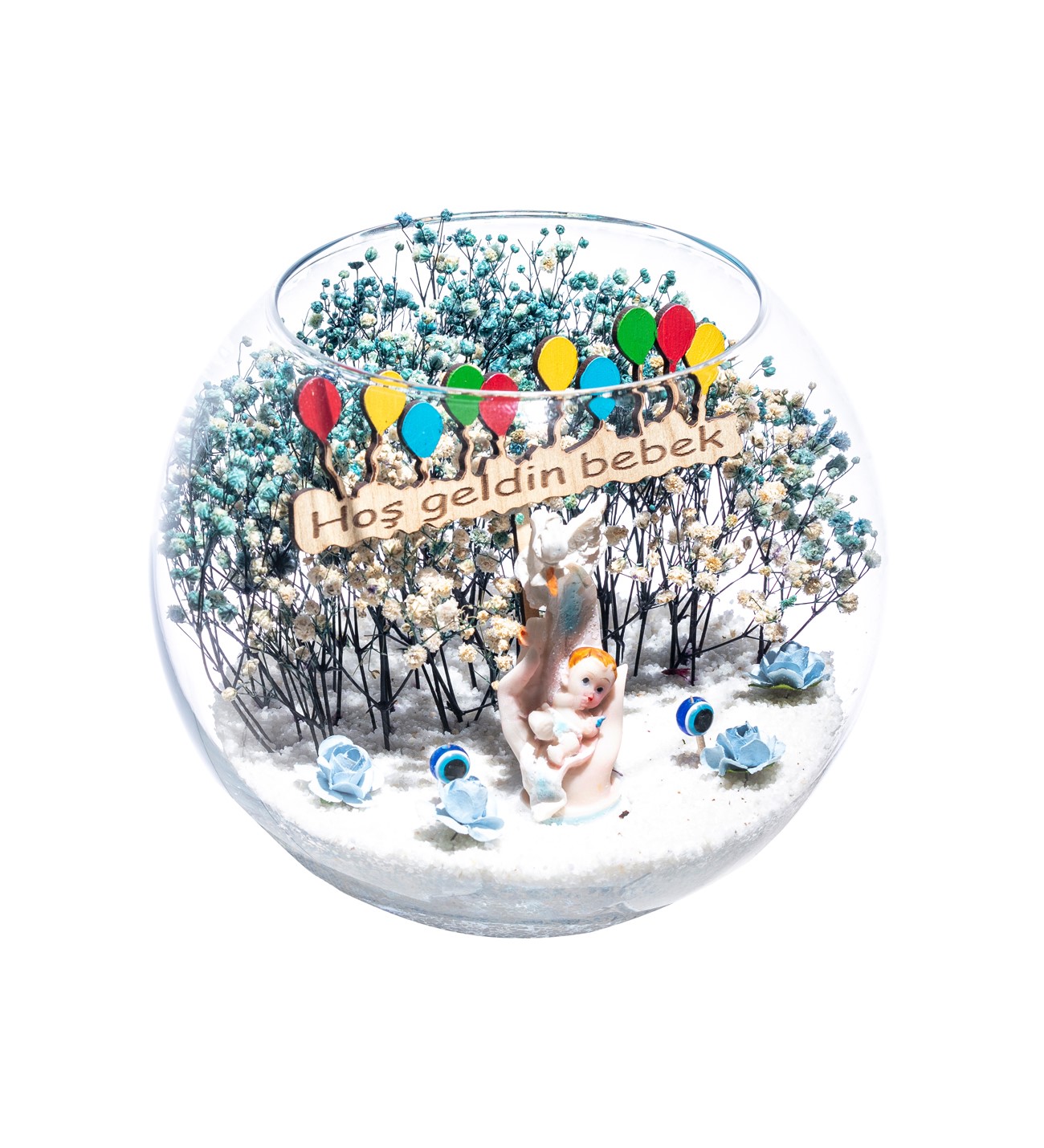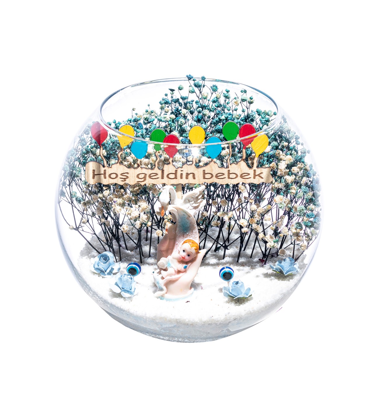 Küçük boy, cam fanus içerisinde tasarladığımız bu anlamlı teraryum; beyaz kum, kurutulmuş bitkiler, bir adet ahşap-balonlu HOŞGELDİN BEBEK tabelası, dört adet mavi gül görseli, iki adet nazar boncuğu ve bir adet yeni doğmuş erkek bebeği kuğu kanadında simgeleyen objeyle tamamlanmıştır. Ev ve ofis ortamlarının tamamında sergilenebilir teraryumun içinde kurutulmuş bitkiler bulunduğundan hava alması önemlidir. Açık olan kısmının kapatılmaması veya büfe vb. kapalı alanlara konulmaması gereklidir. Özellikle her ortamda yıllarca, zevkle izlenebilecek özel bir teraryumdur. Yaklaşık Ölçüleri: 16x18 cm