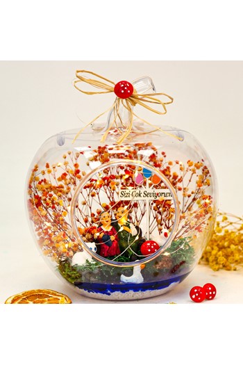 Küçük boy, Paşabahçe cam fanus içerisinde tasarladığımız bu güzel teraryum; beyaz kum, kurutulmuş bitkiler, yapay güller, bir adet kız bebek, bir adet pembe simli kalp, bir adet sırt sırta oturan ebeveyni simgeleyen objeler kullanılarak tamamlanmıştır. Ev ve ofis ortamlarının tamamında sergilenebilir teraryumun içinde kurutulmuş bitkiler bulunduğundan hava alması önemlidir. Açık olan kısmının kapatılmaması veya büfe vb. kapalı alanlara konulmaması gereklidir. Özellikle her ortamda yıllarca, zevkle izlenebilecek özel bir teraryumdur. Yaklaşık Ölçüleri: 16x18 cm
