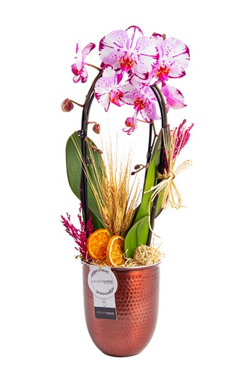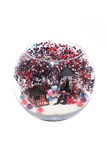 Küçük boy, Paşabahçe cam fanus içerisinde tasarladığımız bu güzel teraryum; beyaz kum, kurutulmuş bitkiler, üç adet kalp, bir adet erkek bebek ve yanında bir çift neşeli ebeveyni simgeleyen obje kullanılarak tamamlanmıştır. Ev ve ofis ortamlarının tamamında sergilenebilir teraryumun içinde kurutulmuş bitkiler bulunduğundan hava alması önemlidir. Açık olan kısmının kapatılmaması veya büfe vb. kapalı alanlara konulmaması gereklidir. Özellikle her ortamda yıllarca, zevkle izlenebilecek özel bir teraryumdur. Yaklaşık Ölçüleri: 16x18 cm