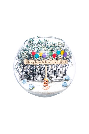 Küçük boy, Paşabahçe cam fanus içerisinde tasarladığımız bu güzel teraryum; beyaz kum, kurutulmuş bitkiler, bir adet bebek arabasında erkek bebek, bir adet mavi ahşap karyola, bir adet mavi balon ahşap fil objeler kullanılarak tamamlanmıştır. Ev ve ofis ortamlarının tamamında sergilenebilir teraryumun içinde kurutulmuş bitkiler bulunduğundan hava alması önemlidir. Açık olan kısmının kapatılmaması veya büfe vb. kapalı alanlara konulmaması gereklidir. Özellikle her ortamda yıllarca, zevkle izlenebilecek özel bir teraryumdur. Yaklaşık Ölçüleri: 16x18 cm