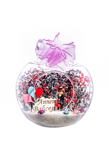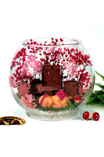 Küçük boy yumurta cam fanus içerisinde tasarladığımız bu güzel teraryum; beyaz kum, karışık renkli kurutulmuş bitkiler, renkli mini yapay güller, bir adet ahşap ev, bir adet ışığı iki farklı renkte yanan led sokak lambası görseli ve bir adet bahçelerinde sohbet eden aşıkları simgeleyen obje ile kurgulanmıştır. Ev ve ofis ortamlarının tamamında sergilenebilir teraryumun içinde, kurutulmuş bitkiler bulunduğundan hava alması önemlidir. Açık olan kısmının kapatılmaması veya büfe vb. kapalı alanlara konulmaması gereklidir. Özellikle her ortamda yıllarca, zevkle izlenebilecek özel bir teraryumdur. Yaklaşık Ölçüleri: 18x22cm NOT: Teraryumlarda kullanılan camlar, üfleme cam işçiliğiyle üretildiğinden bazı detaylarda farklılıklar gözlenebilir. Örneğin, yumurta şekli ve ağız bitiş noktalarının her biri kendine özgüdür.