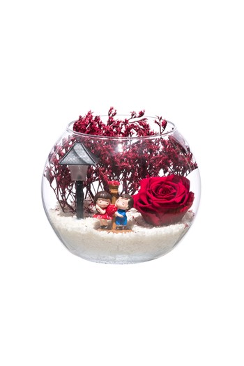 Küçük boy yumurta cam fanus içerisinde tasarladığımız bu güzel teraryum; beyaz kum, karışık renkli kurutulmuş bitkiler, renkli mini yapay güller, simli kalp, bir adet ahşap ev, bir adet ışığı iki farklı renkte yanan led sokak lambası görseli ve bir adet bahçelerinde birbirlerine sarılmış sevgilileri simgeleyen obje ile kurgulanmıştır. Ev ve ofis ortamlarının tamamında sergilenebilir teraryumun içinde, kurutulmuş bitkiler bulunduğundan hava alması önemlidir. Açık olan kısmının kapatılmaması veya büfe vb. kapalı alanlara konulmaması gereklidir. Özellikle her ortamda yıllarca, zevkle izlenebilecek özel bir teraryumdur. Yaklaşık Ölçüleri: 18x22cm NOT: Teraryumlarda kullanılan camlar, üfleme cam işçiliğiyle üretildiğinden bazı detaylarda farklılıklar gözlenebilir. Örneğin, yumurta şekli ve ağız bitiş noktalarının her biri kendine özgüdür.
