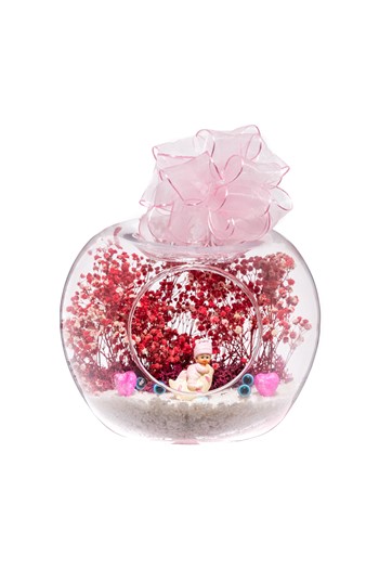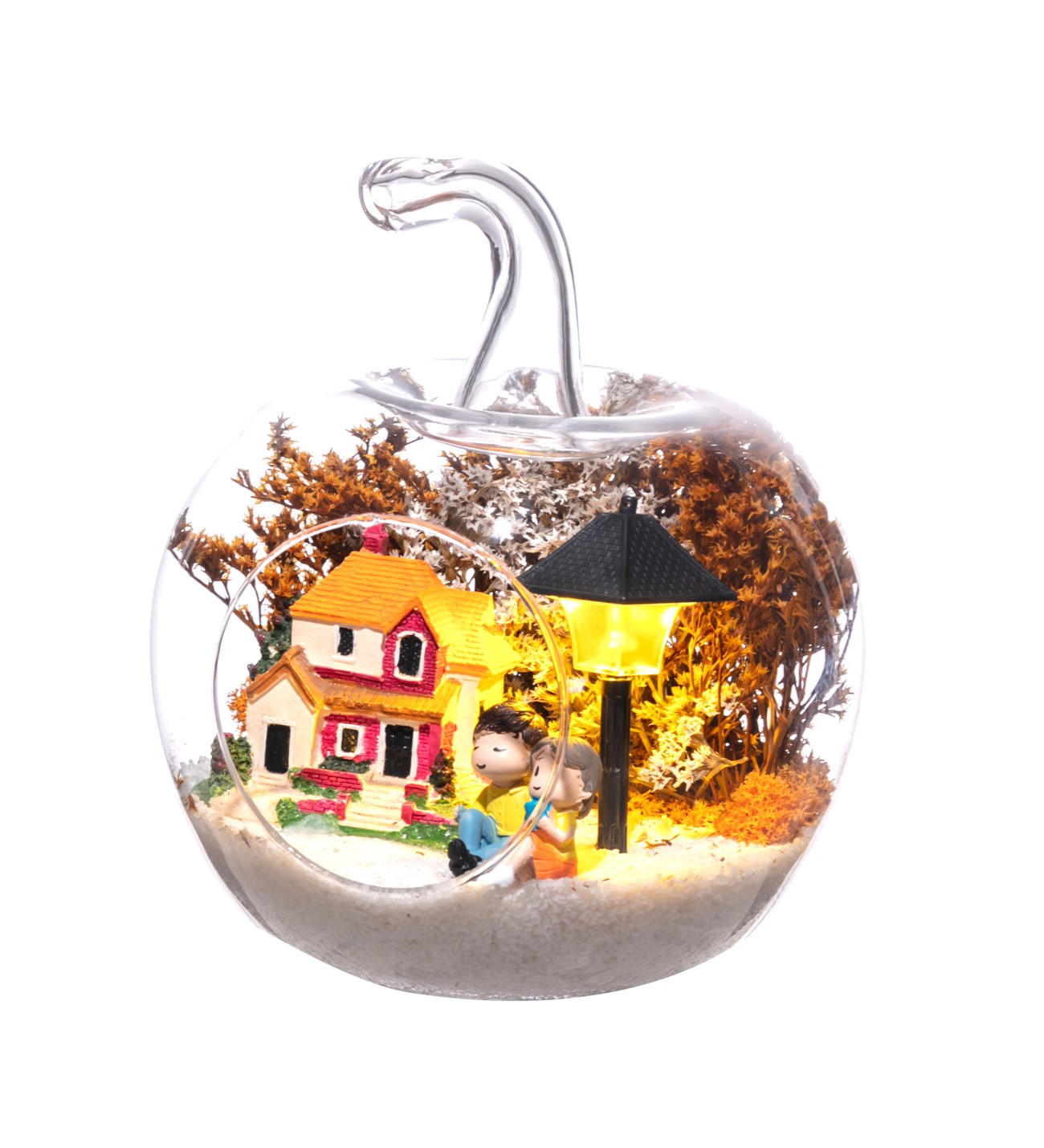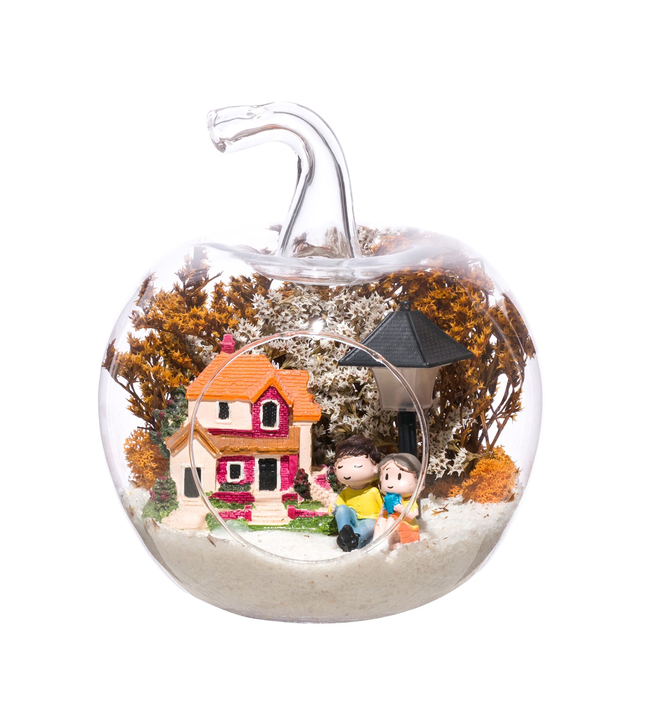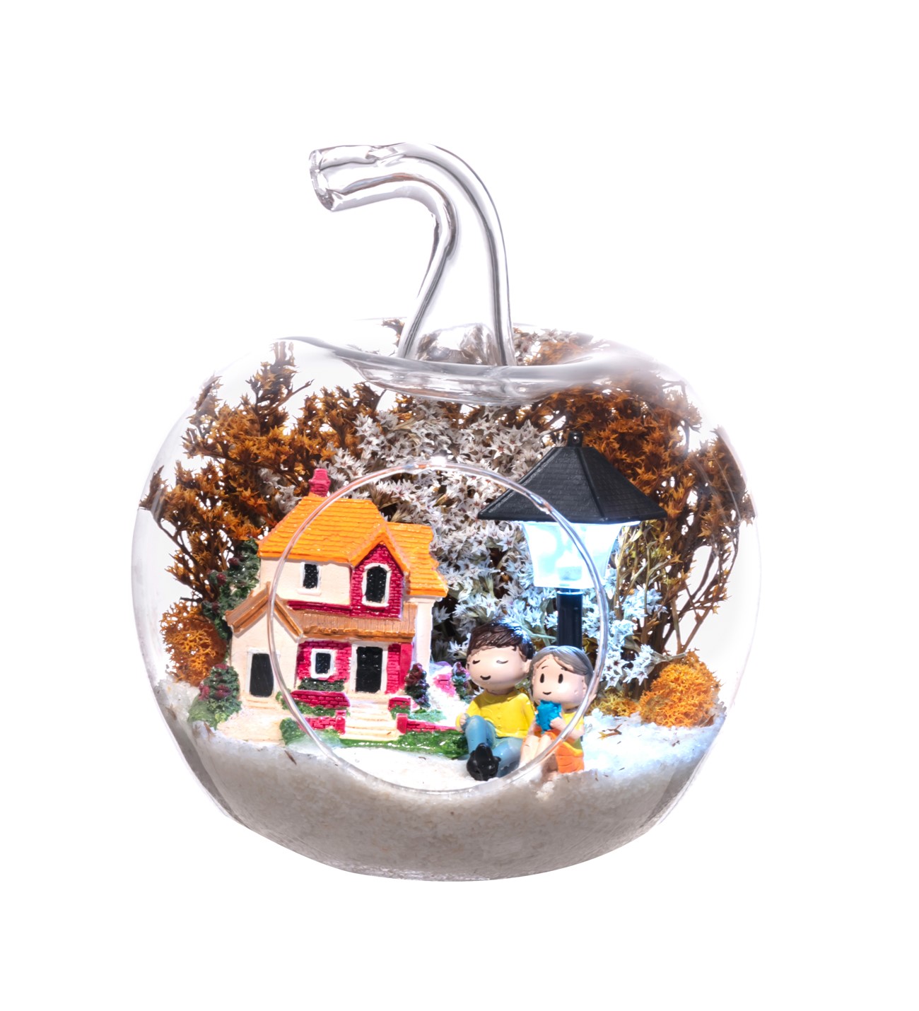 Küçük boy elma cam fanus içerisinde tasarladığımız bu çok güzel teraryum; beyaz kum, şoklanmış yosunlar, kurutulmuş bitkiler, bir adet ışığı iki farklı renkte yanan led sokak lambası görseli, bir adet kır evi ve yan yana sohbet eden sevgililer görseli kullanılarak tamamlanmıştır. Ev ve ofis ortamlarının tamamında sergilenebilir teraryumun içinde, kurutulmuş ve şoklanmış bitkiler bulunduğundan hava alması önemlidir. Açık olan kısmının kapatılmaması veya büfe vb. kapalı alanlara konulmaması gereklidir. Özellikle her ortamda yıllarca, zevkle izlenebilecek özel bir teraryumdur. Yaklaşık Ölçüleri: 20x20cm NOT: Teraryumlarda kullanılan camlar, üfleme cam işçiliğiyle üretildiğinden bazı detaylarda farklılıklar gözlenebilir. Örneğin, sap kısmı ve ağız bitiş noktalarının her biri kendine özgüdür.