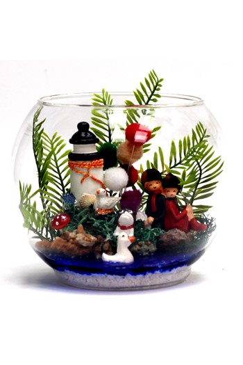 Küçük boy yumurta cam fanus içerisinde tasarladığımız, bu özgün teraryum; beyaz kum, karışık renkli kurutulmuş bitkiler, bir adet ahşap ev, bir adet ışığı iki farklı renkte yanan lamba ve yan yana sohbet eden genç kızları simgeleyen objeler kullanılarak tamamlanmıştır. Ev ve ofis ortamlarının tamamında sergilenebilir teraryumun içinde, kurutulmuş ve şoklanmış bitkiler olduğundan hava alması önemlidir. Açık olan kısmının kapatılmaması veya büfe vb. kapalı alanlara konulmaması gereklidir. Özellikle her ortamda yıllarca, zevkle izlenebilecek özel bir teraryumdur. Yaklaşık Ölçüleri: 18x22cm NOT: Teraryumlarda kullanılan camlar, üfleme cam işçiliğiyle üretildiğinden bazı detaylarda farklılıklar gözlenebilir. Örneğin, ağız bitiş noktalarının her biri kendine özgüdür.