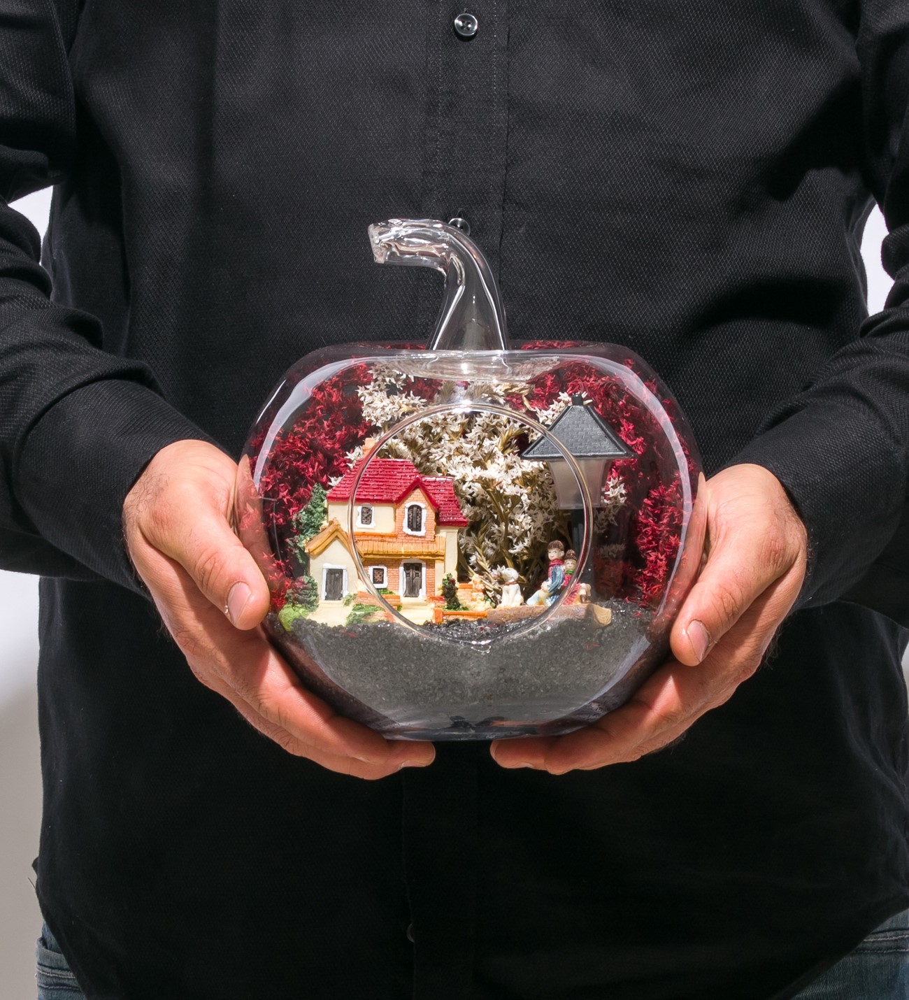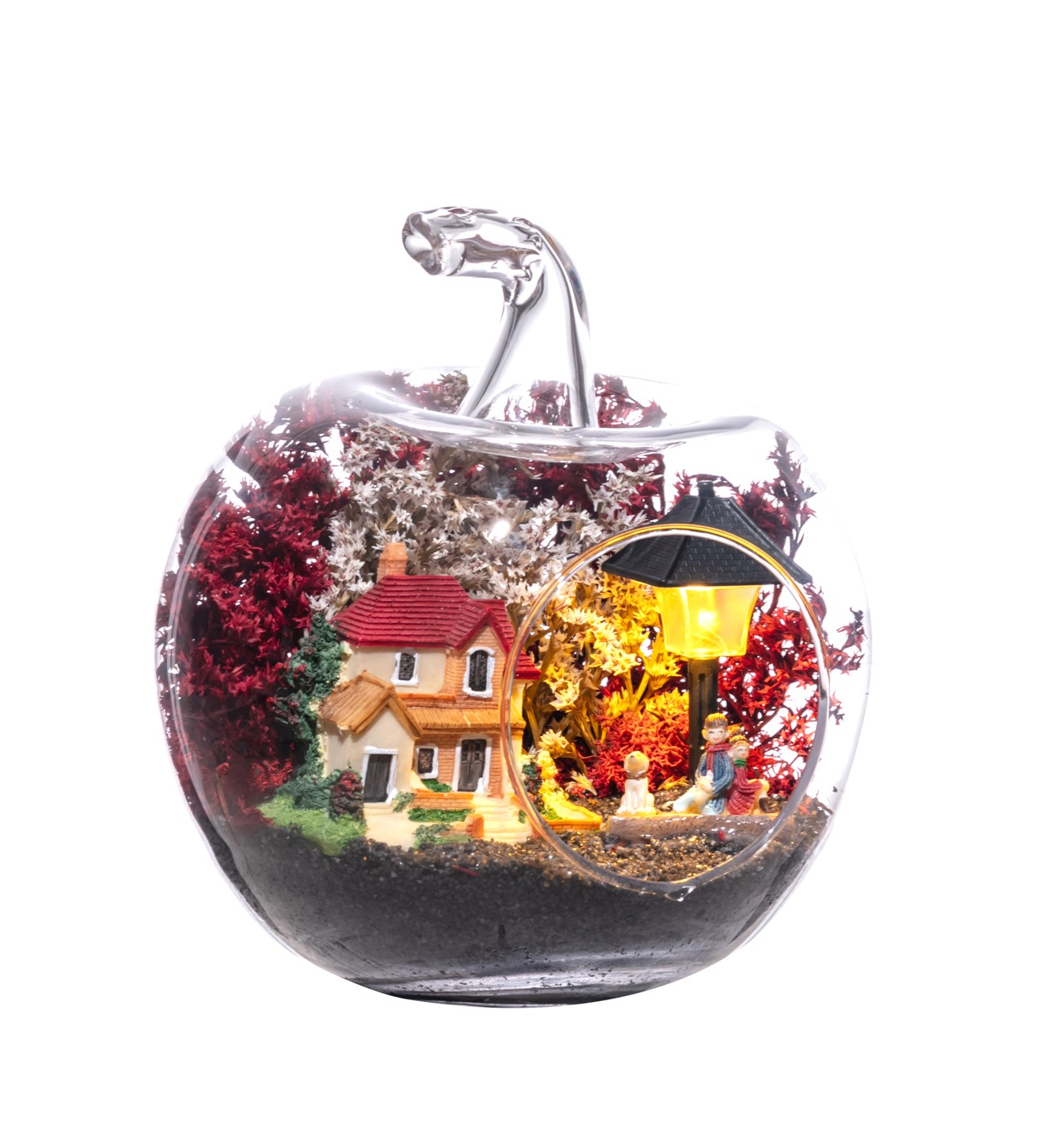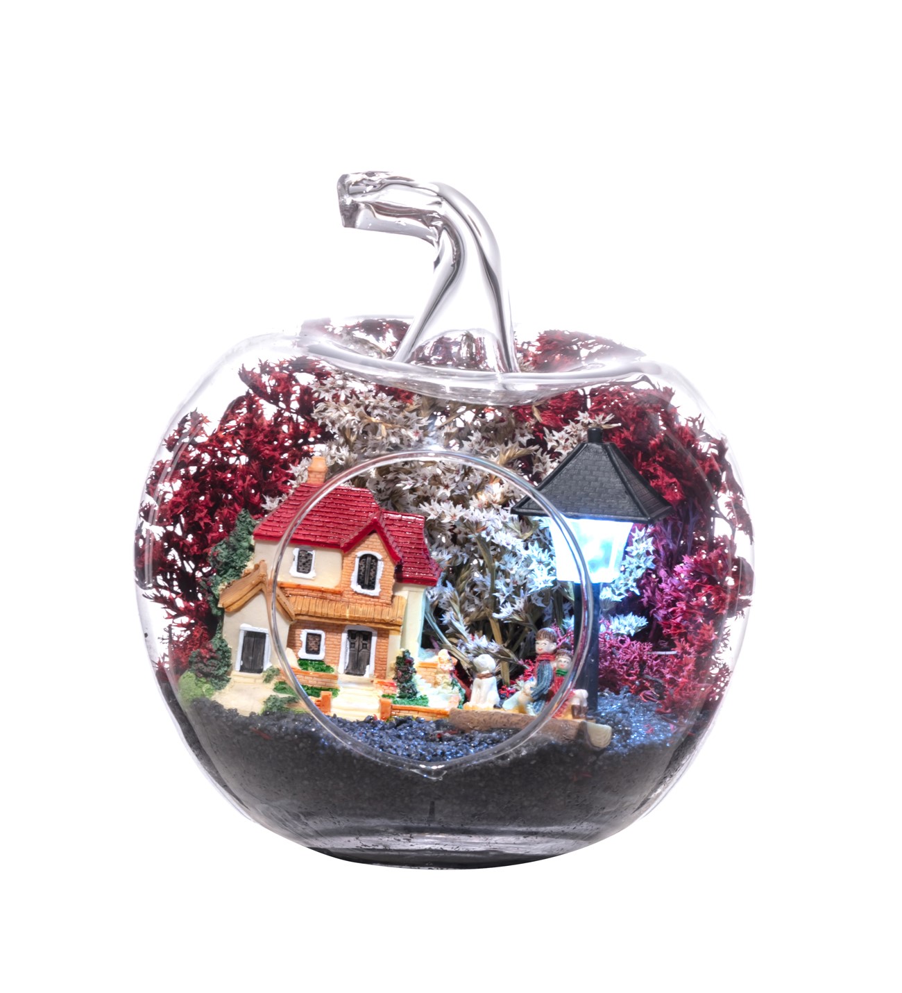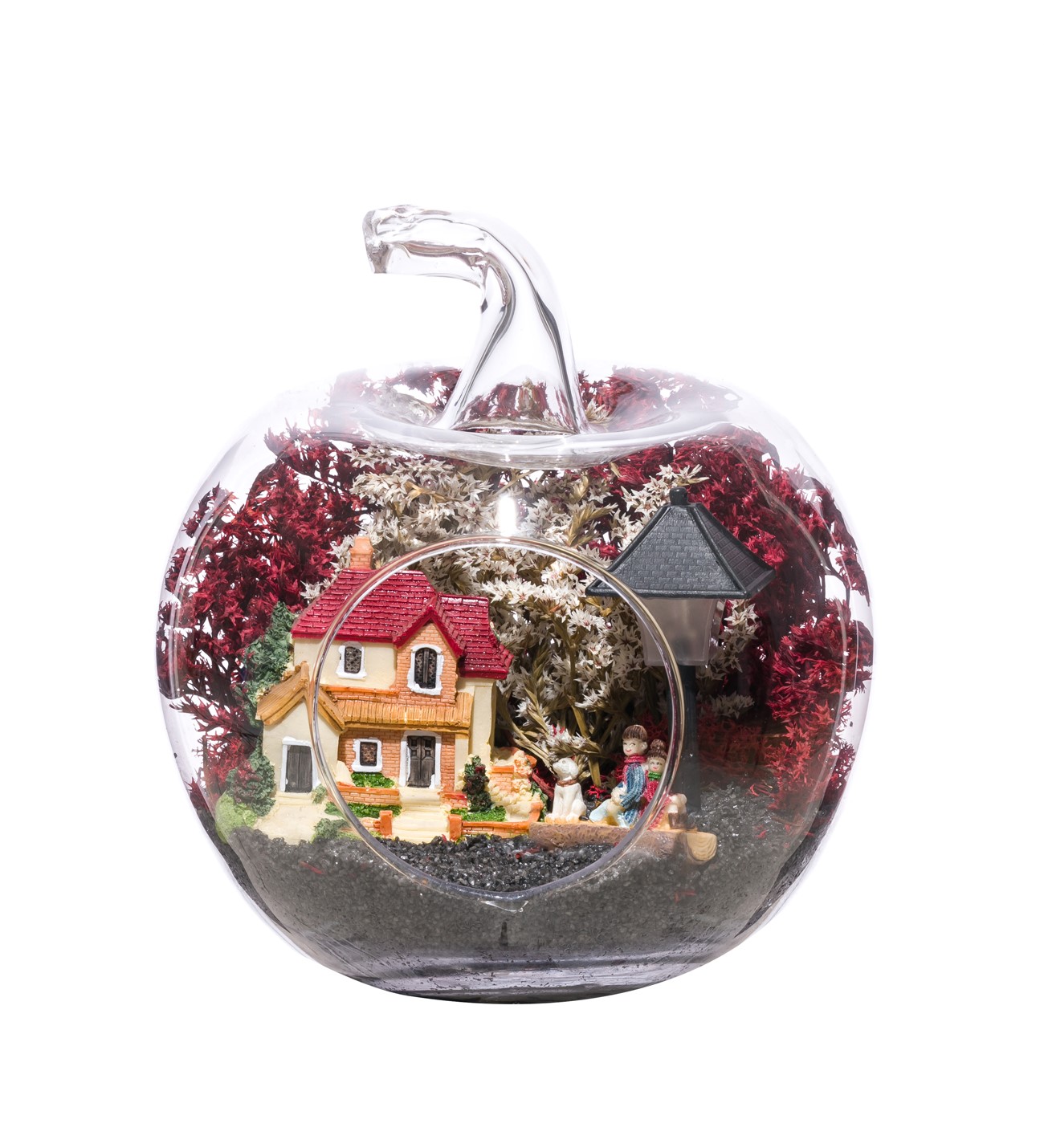 Küçük boy elma cam fanus içerisinde tasarladığımız bu çok güzel teraryum; siyah kum, şoklanmış yosunlar, kurutulmuş bitkiler, bir adet ışığı iki farklı renkte yanan led sokak lambası görseli, bir adet kır evi ve sırt sırta bankta sohbet eden aşıklar görseli kullanılarak tamamlanmıştır. Ev ve ofis ortamlarının tamamında sergilenebilir teraryumun içinde, kurutulmuş ve şoklanmış bitkiler bulunduğundan hava alması önemlidir. Açık olan kısmının kapatılmaması veya büfe vb. kapalı alanlara konulmaması gereklidir. Özellikle her ortamda yıllarca, zevkle izlenebilecek özel bir teraryumdur. Yaklaşık Ölçüleri: 20x20cm NOT: Teraryumlarda kullanılan camlar, üfleme cam işçiliğiyle üretildiğinden bazı detaylarda farklılıklar gözlenebilir. Örneğin, sap kısmı ve ağız bitiş noktalarının her biri kendine özgüdür.
