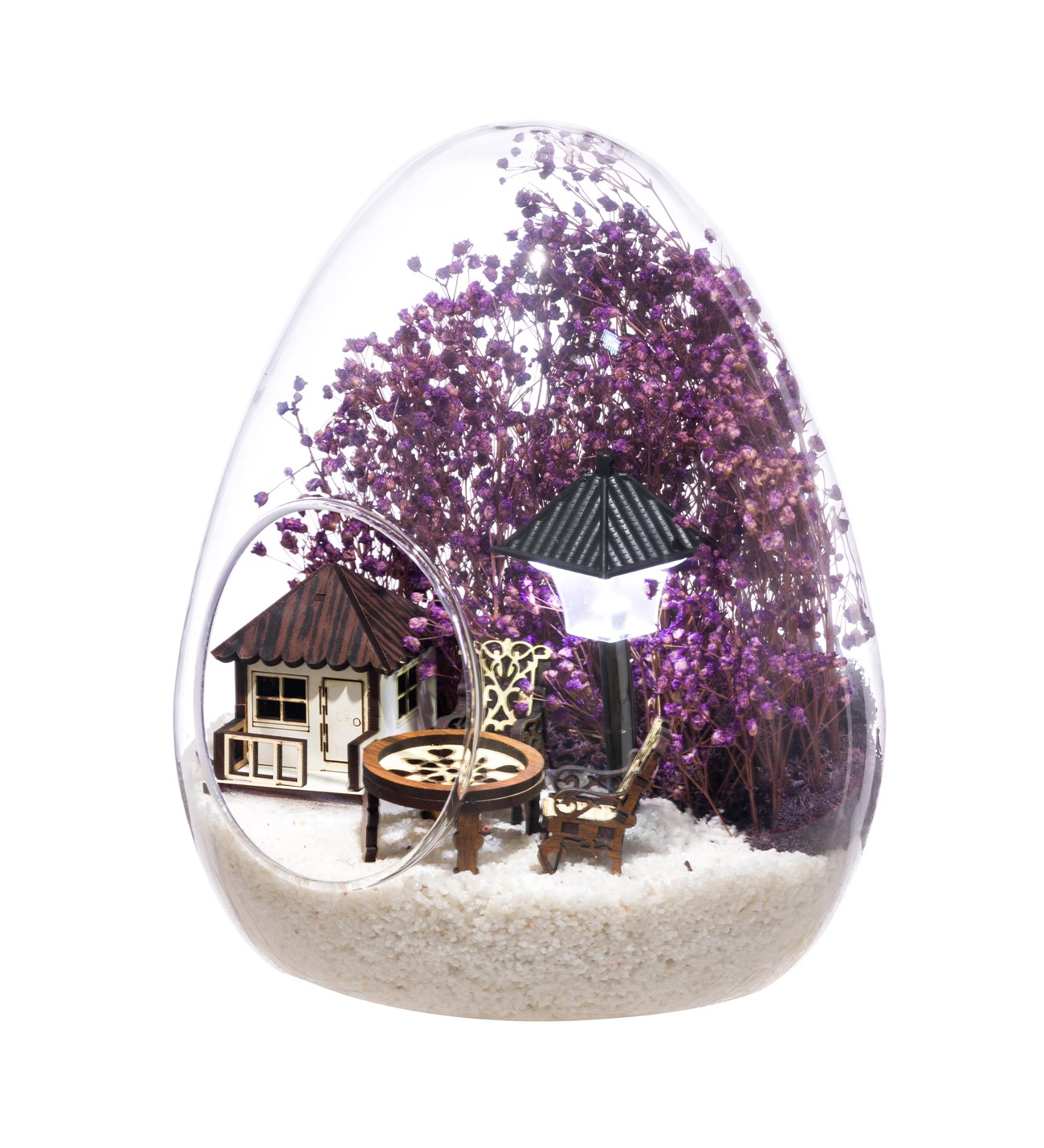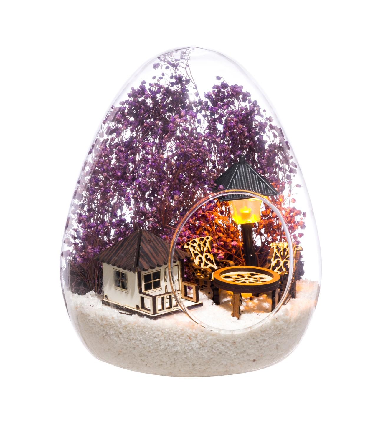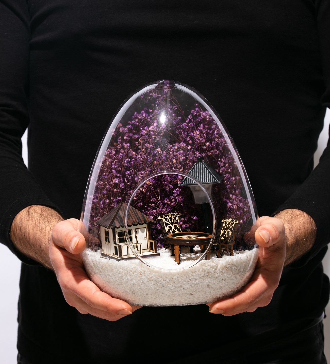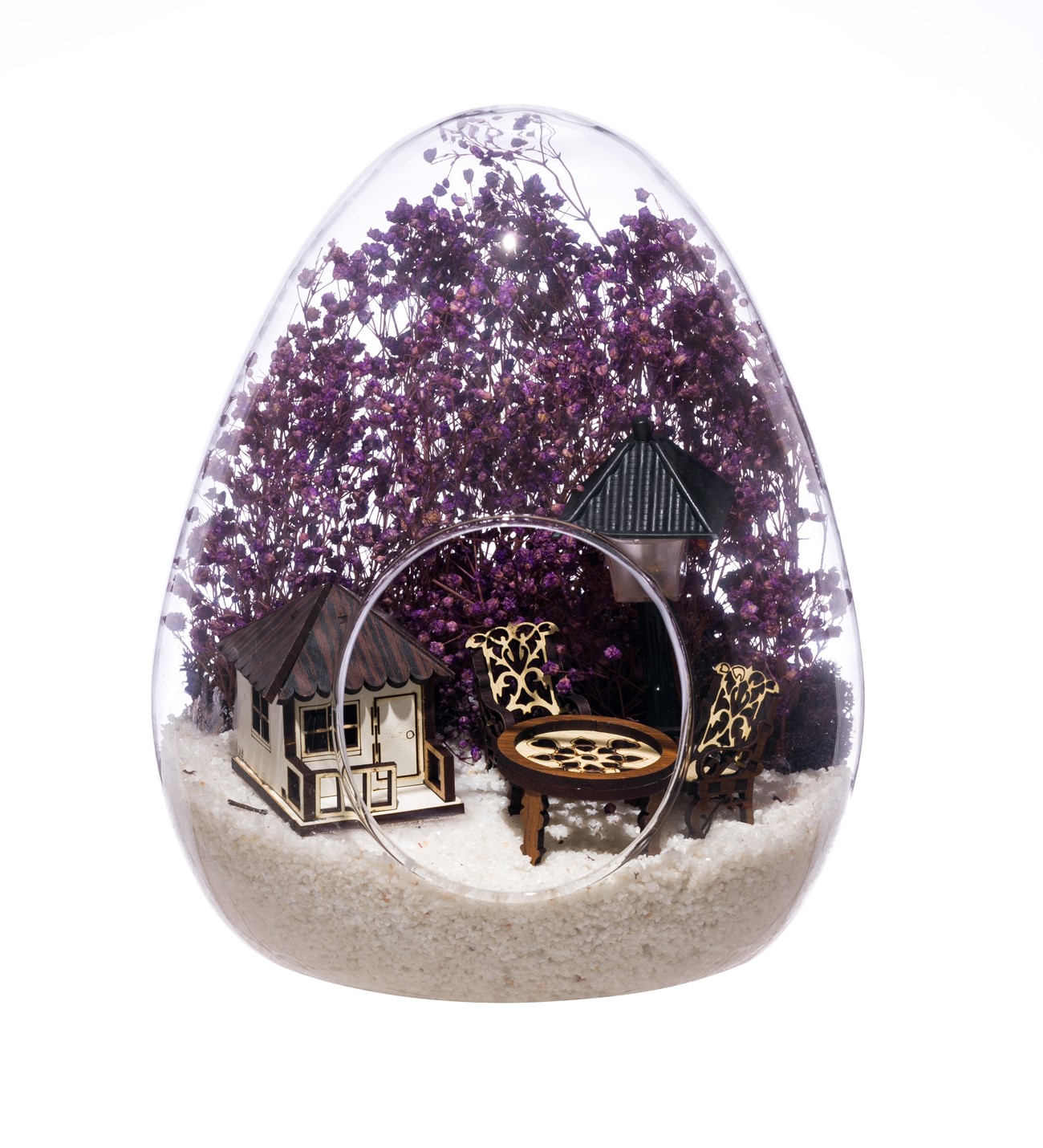 Küçük boy yumurta cam fanus içerisinde tasarladığımız bu güzel teraryum; beyaz kum, kurutulmuş bitkiler, şoklanmış yosunlar, bir adet ışığı iki farklı renkte yanan led sokak lambası görseli, bir adet ahşap beyaz ev görseli, iki adet ahşap bahçe sandalyesi ve bir ahşap bahçe masası kullanılarak tamamlanmıştır. Ev ve ofis ortamlarının tamamında sergilenebilir teraryumun içinde, kurutulmuş ve şoklanmış bitkiler bulunduğundan hava alması önemlidir. Açık olan kısmının kapatılmaması veya büfe vb. kapalı alanlara konulmaması gereklidir. Özellikle her ortamda yıllarca, zevkle izlenebilecek özel bir teraryumdur. Yaklaşık Ölçüleri: 18x22cm NOT: Teraryumlarda kullanılan camlar, üfleme cam işçiliğiyle üretildiğinden bazı detaylarda farklılıklar gözlenebilir. Örneğin, yumurta şekli ve ağız bitiş noktalarının her biri kendine özgüdür.