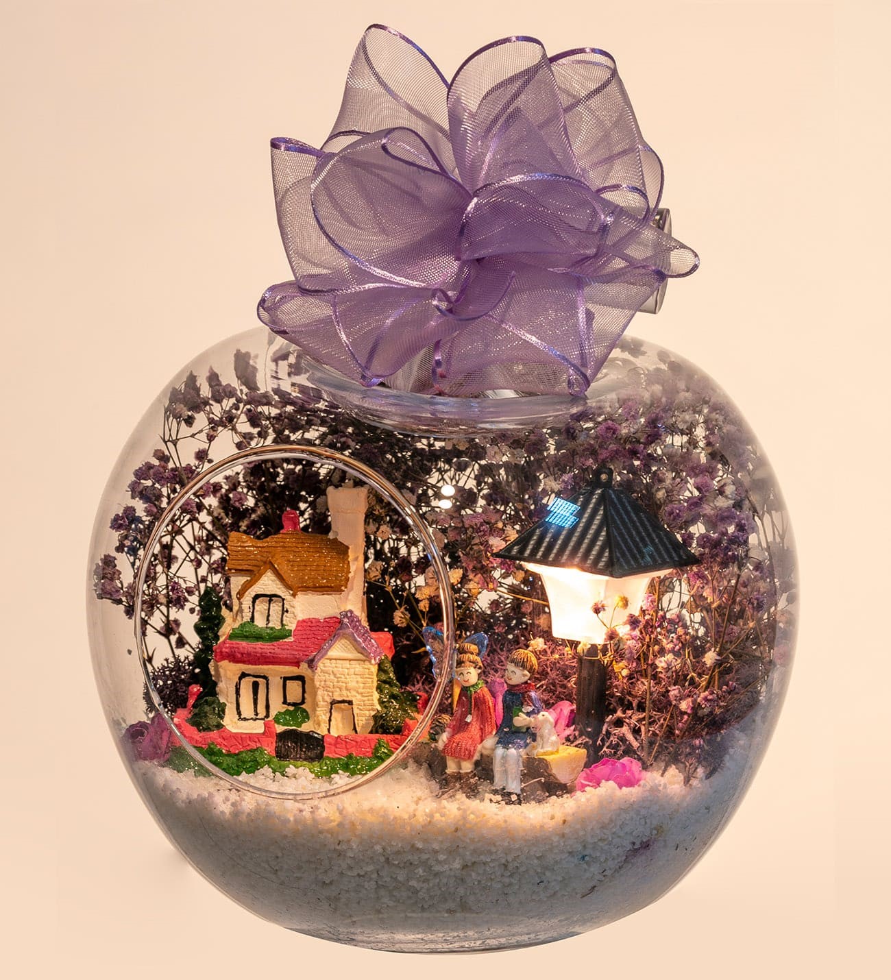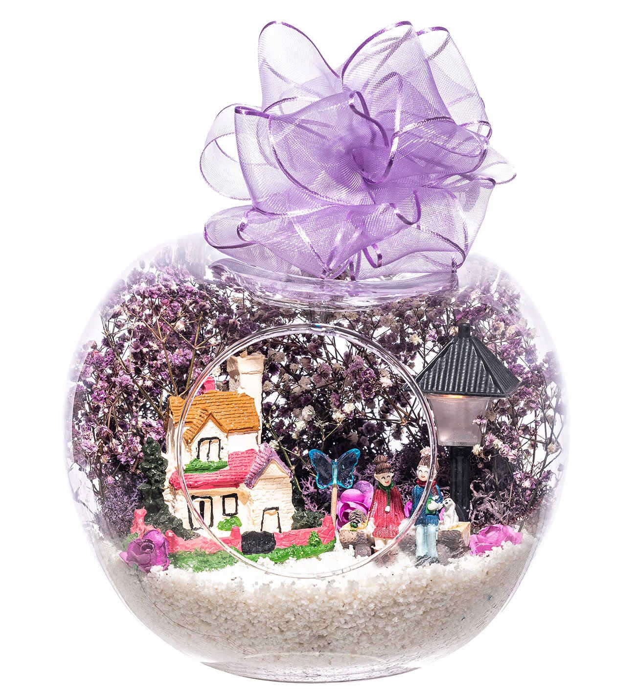 Küçük boy elma cam fanus içerisinde tasarladığımız bu güzel teraryum; beyaz kum, şoklanmış yosunlar, kurutulmuş bitkiler, yapay çiçekler, bir adet kır evi, bir adet köpekleriyle yan yana oturan mutlu çift, bir adet kelebek, bir adet ışığı 2 farklı renkte yanan lamba ve üzerinde kurdelesiyle sizler için tasarlanmıştır. Ev ve ofis ortamlarının tamamında sergilenebilir teraryumun içinde, kurutulmuş bitkiler olduğundan hava alması önemlidir. Açık olan kısmının kapatılmaması veya büfe vb. kapalı alanlara konulmaması gereklidir. Özellikle her ortamda yıllarca, zevkle izlenebilecek özel bir teraryumdur. Yaklaşık Ölçüleri: 20x20cm NOT: Teraryumlarda kullanılan camlar, üfleme cam işçiliğiyle üretildiğinden bazı detaylarda farklılıklar gözlenebilir. Örneğin, sap kısmı ve ağız bitiş noktalarının her biri kendine özgüdür.