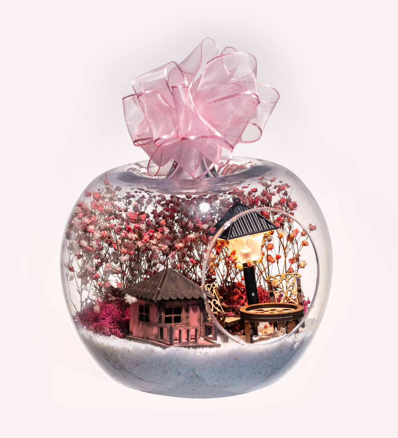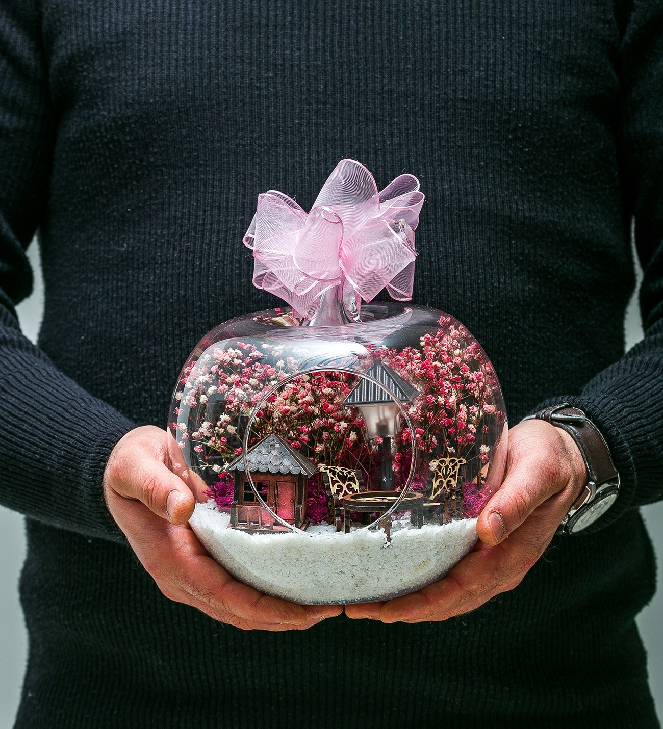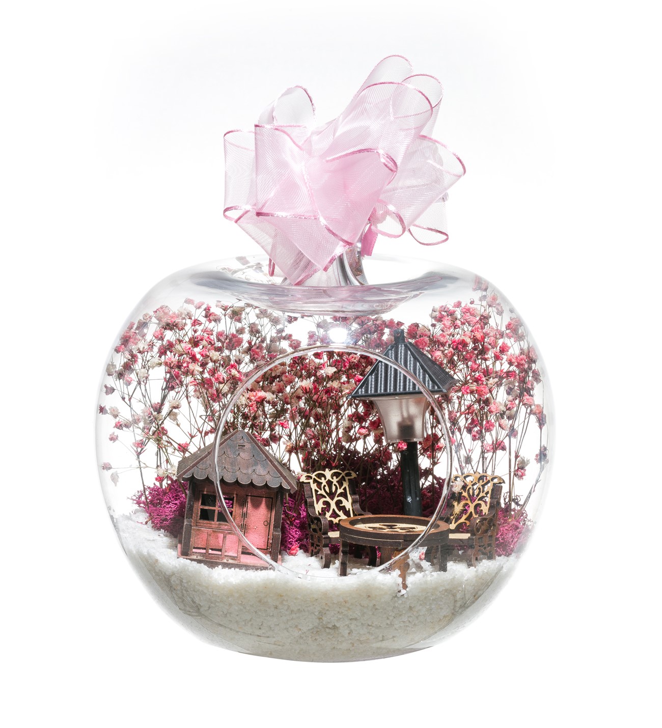 Kurdele takılmış küçük boy elma cam fanus içerisinde tasarladığımız bu çok anlamlı teraryum; beyaz kum, kurutulmuş bitkiler, şoklanmış yosunlar, bir adet ışığı 2 farklı renkte yanan led lamba, bir adet ahşap pembe ev, bir adet ahşap oymalı bahçe masası ve iki adet ahşap oymalı bahçe sandalyeleri objeler kullanılarak tamamlanmıştır. Ev ve ofis ortamlarının tamamında sergilenebilir teraryumun içinde, kurutulmuş ve şoklanmış bitkiler bulunduğundan hava alması önemlidir. Açık olan kısmının kapatılmaması veya büfe vb. kapalı alanlara konulmaması gereklidir. Özellikle her ortamda yıllarca, zevkle izlenebilecek özel bir teraryumdur. Yaklaşık Ölçüleri: 20x20cm NOT: Teraryumlarda kullanılan camlar, üfleme cam işçiliğiyle üretildiğinden bazı detaylarda farklılıklar gözlenebilir. Örneğin, sap kısmı ve ağız bitiş noktalarının her biri kendine özgüdür.