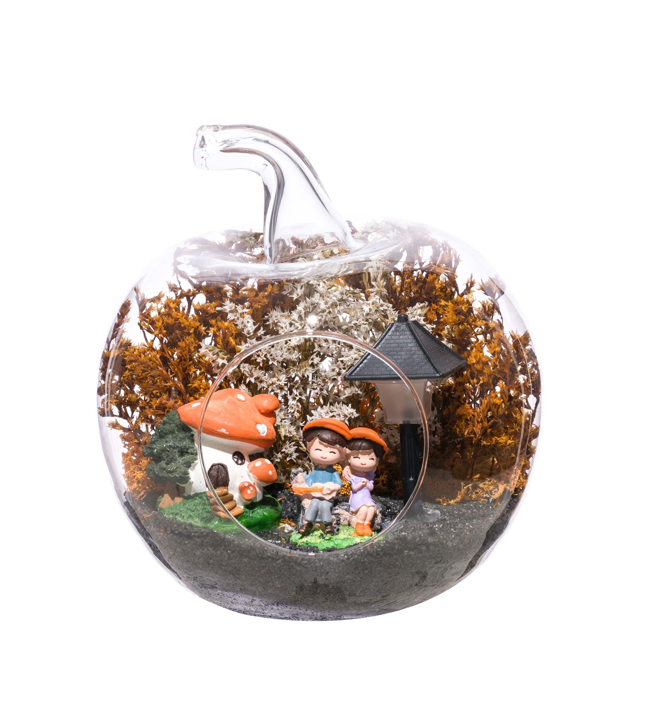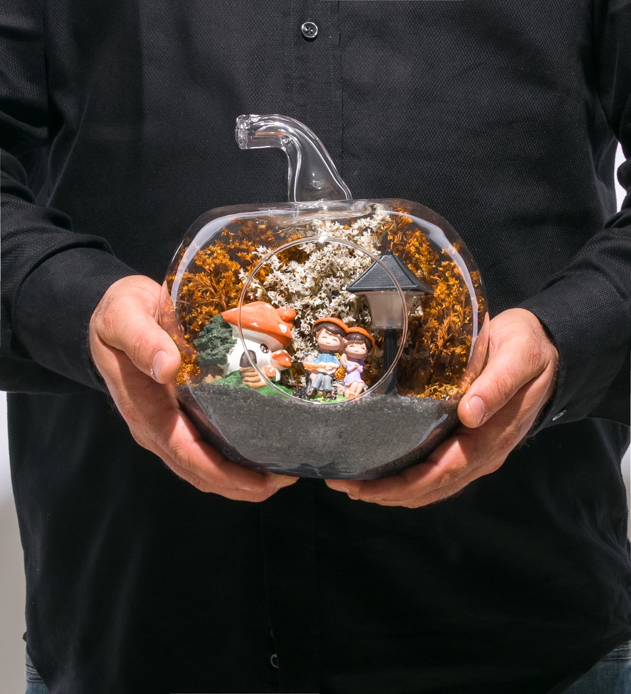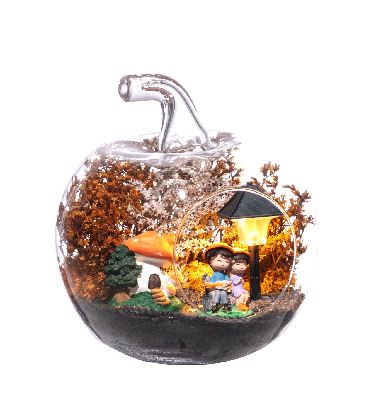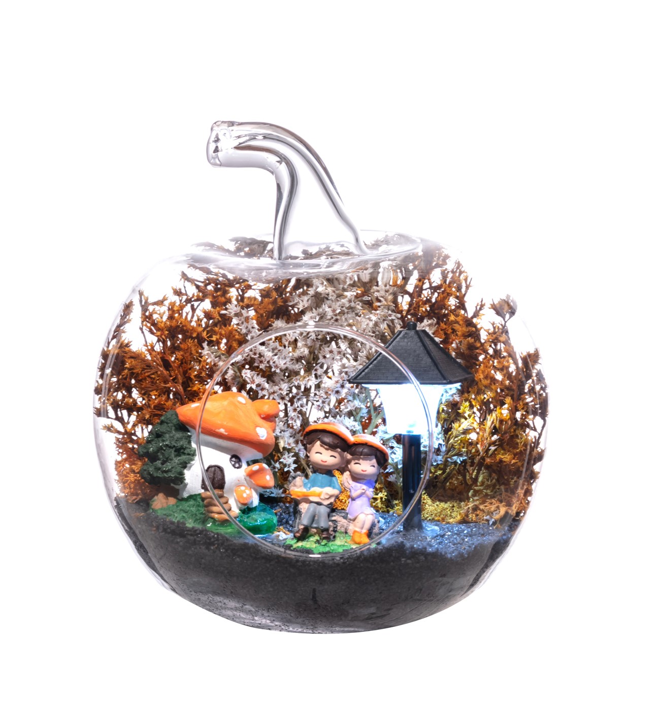 Küçük boy elma cam fanus içerisinde tasarladığımız bu çok güzel teraryum; siyah kum, şoklanmış yosunlar, kurutulmuş bitkiler, bir adet ışığı iki farklı renkte yanan led sokak lambası görseli, bir adet mantar ev ve yan yana sohbet eden sevgililer görseli kullanılarak tamamlanmıştır. Ev ve ofis ortamlarının tamamında sergilenebilir teraryumun içinde, kurutulmuş ve şoklanmış bitkiler bulunduğundan hava alması önemlidir. Açık olan kısmının kapatılmaması veya büfe vb. kapalı alanlara konulmaması gereklidir. Özellikle her ortamda yıllarca, zevkle izlenebilecek özel bir teraryumdur. Yaklaşık Ölçüleri: 20x20cm NOT: Teraryumlarda kullanılan camlar, üfleme cam işçiliğiyle üretildiğinden bazı detaylarda farklılıklar gözlenebilir. Örneğin, sap kısmı ve ağız bitiş noktalarının her biri kendine özgüdür.