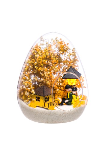 Küçük boy elma cam fanus içerisinde tasarladığımız bu çok güzel teraryum; beyaz kum, şoklanmış yosunlar, kurutulmuş bitkiler, bir adet ışığı iki farklı renkte yanan led sokak lambası görseli, bir adet kır evi ve yan yana bahçelerinde sohbet eden aşıklar görseli kullanılarak tamamlanmıştır. Ev ve ofis ortamlarının tamamında sergilenebilir teraryumun içinde, kurutulmuş ve şoklanmış bitkiler bulunduğundan hava alması önemlidir. Açık olan kısmının kapatılmaması veya büfe vb. kapalı alanlara konulmaması gereklidir. Özellikle her ortamda yıllarca, zevkle izlenebilecek özel bir teraryumdur. Yaklaşık Ölçüleri: 20x20cm NOT: Teraryumlarda kullanılan camlar, üfleme cam işçiliğiyle üretildiğinden bazı detaylarda farklılıklar gözlenebilir. Örneğin, sap kısmı ve ağız bitiş noktalarının her biri kendine özgüdür.