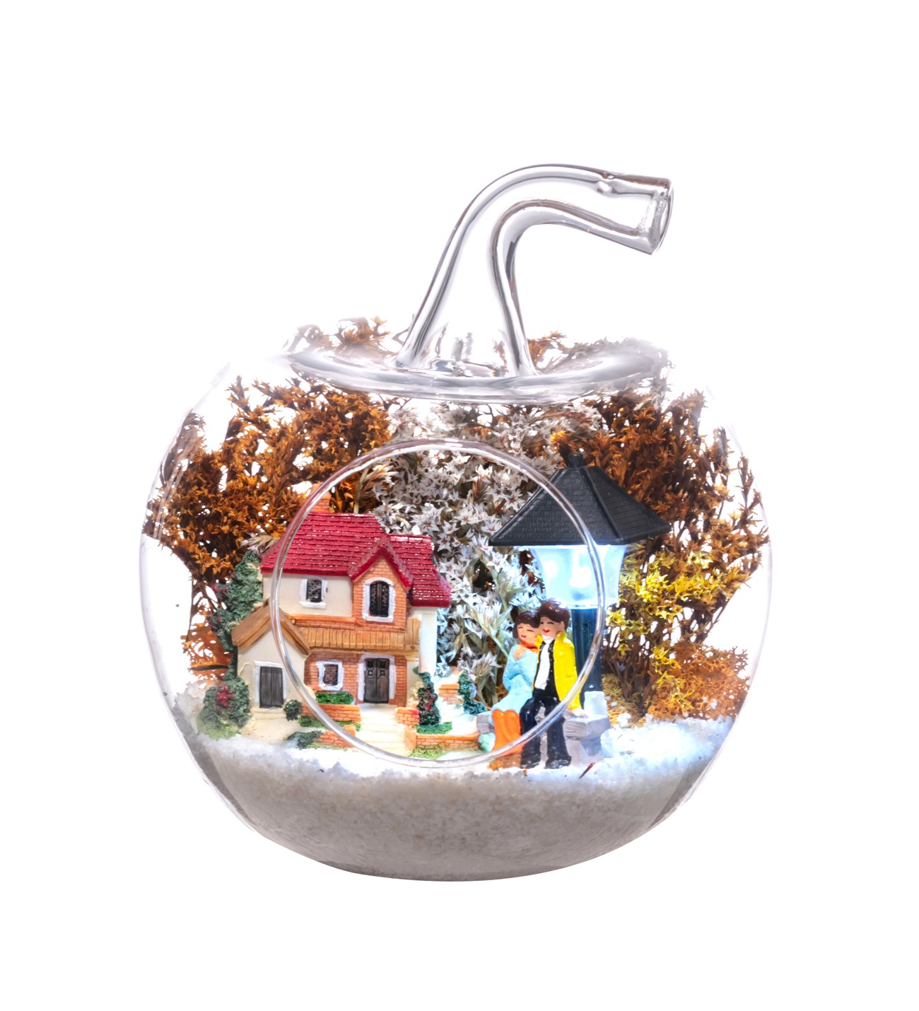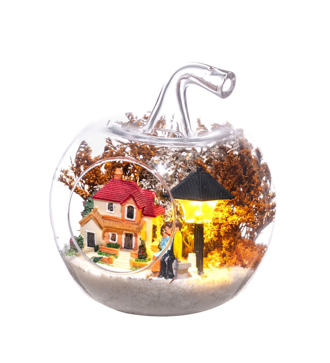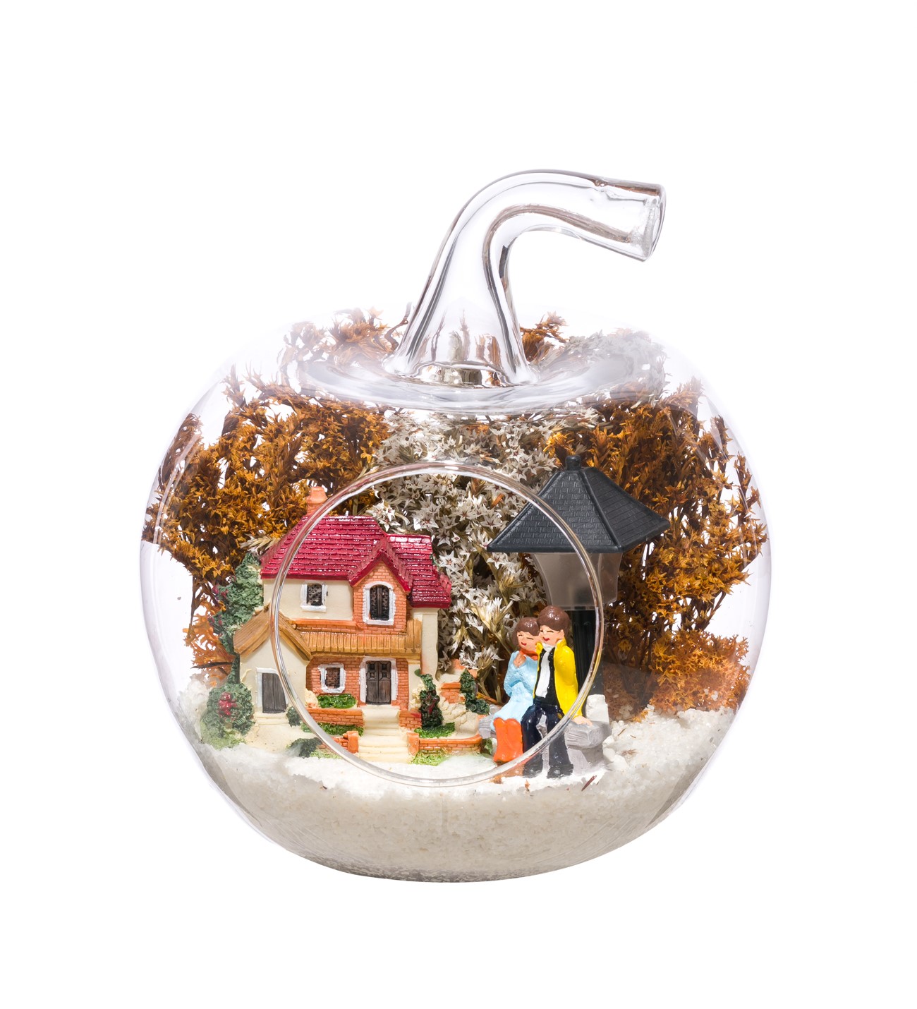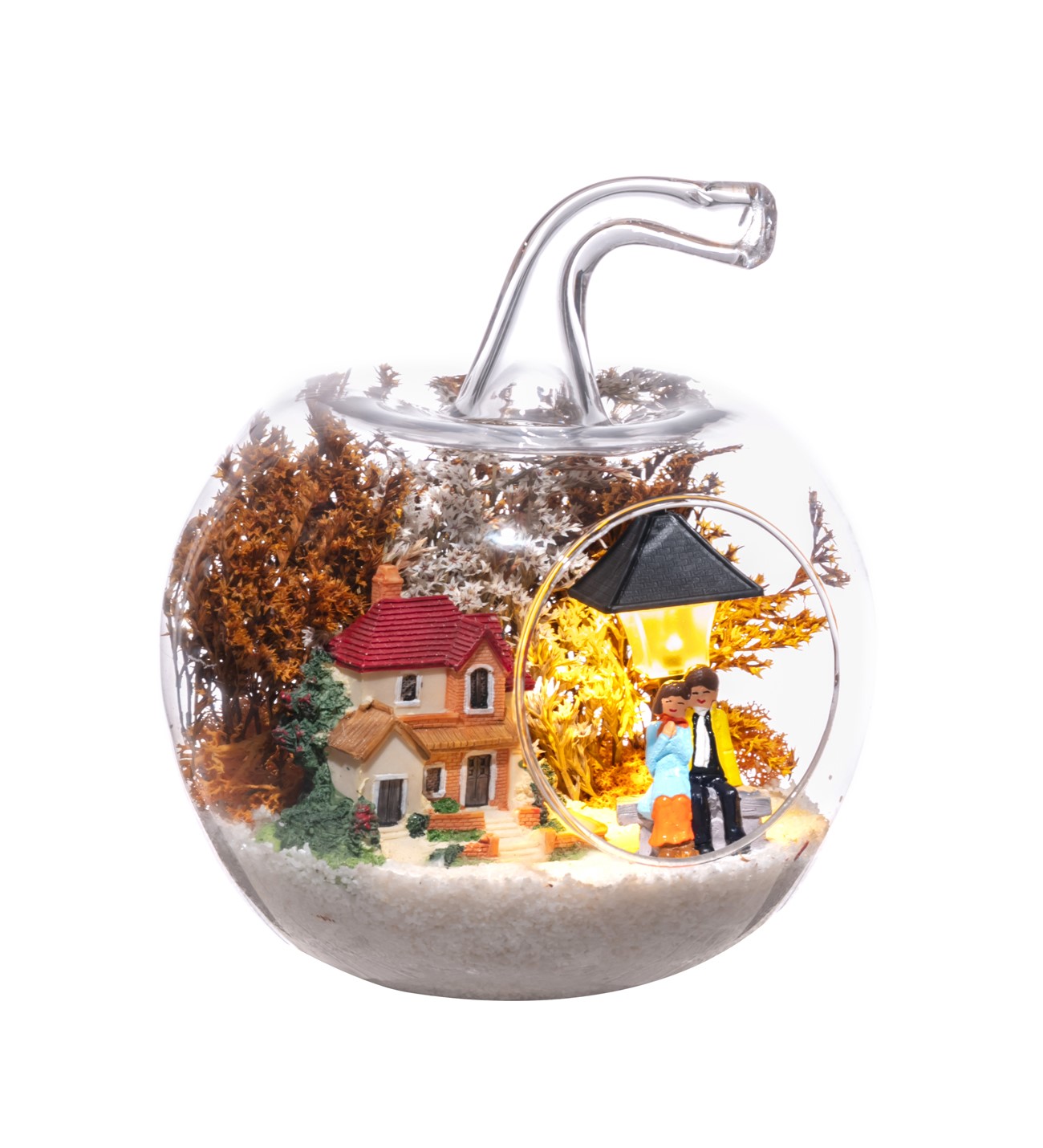 Küçük boy elma cam fanus içerisinde tasarladığımız bu çok güzel teraryum; beyaz kum, şoklanmış yosunlar, kurutulmuş bitkiler, bir adet ışığı iki farklı renkte yanan led sokak lambası görseli, bir adet kır evi ve yan yana bahçelerinde sohbet eden aşıklar görseli kullanılarak tamamlanmıştır. Ev ve ofis ortamlarının tamamında sergilenebilir teraryumun içinde, kurutulmuş ve şoklanmış bitkiler bulunduğundan hava alması önemlidir. Açık olan kısmının kapatılmaması veya büfe vb. kapalı alanlara konulmaması gereklidir. Özellikle her ortamda yıllarca, zevkle izlenebilecek özel bir teraryumdur. Yaklaşık Ölçüleri: 20x20cm NOT: Teraryumlarda kullanılan camlar, üfleme cam işçiliğiyle üretildiğinden bazı detaylarda farklılıklar gözlenebilir. Örneğin, sap kısmı ve ağız bitiş noktalarının her biri kendine özgüdür.