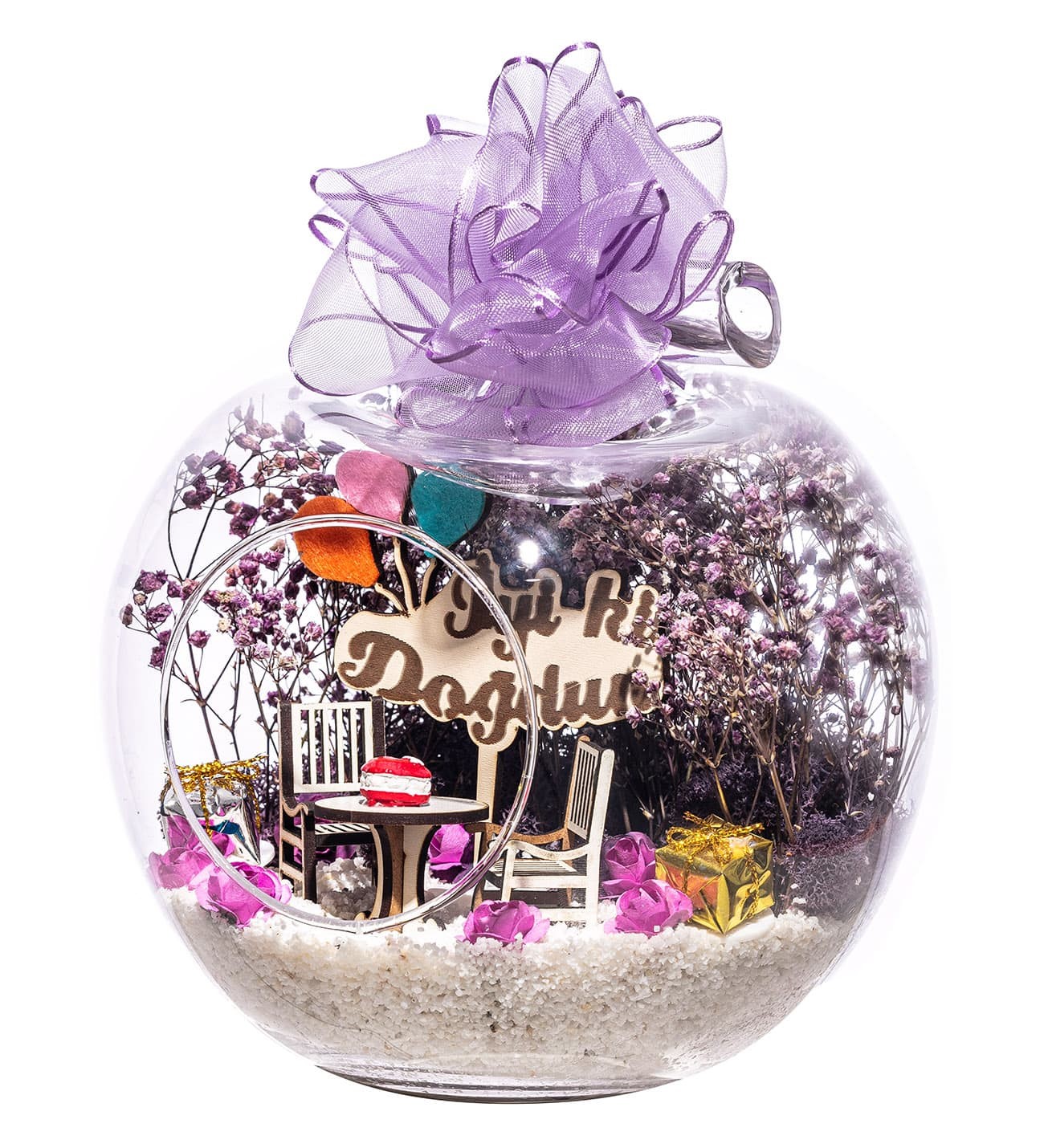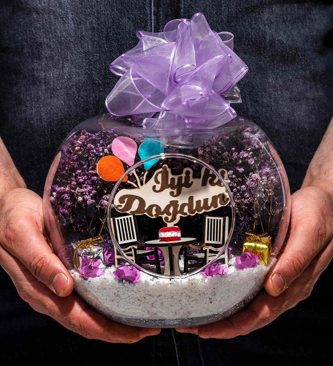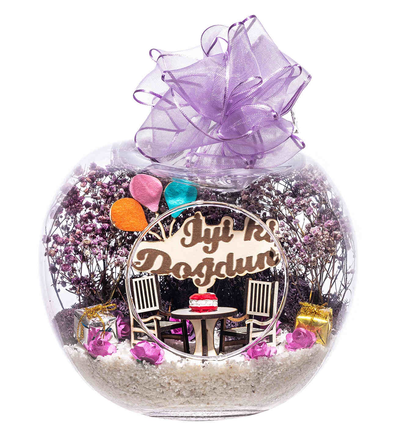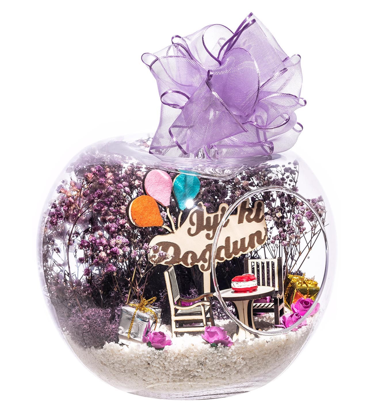 Küçük boy elma cam fanus içerisinde tasarladığımız bu en özel gün için düşünülen teraryum; beyaz kum, şoklanmış yosunlar, kurutulmuş bitkiler, yapay çiçekler, bir adet ahşap sehpa, iki adet ahşap sandalye, bir adet ahşap; balonlarıyla “İYİ Kİ DOĞDUN” yazısı ve iki adet sembolik hediye paketi, üzerinde kurdelesiyle sizler için tasarlanmıştır. Ev ve ofis ortamlarının tamamında sergilenebilir teraryumun içinde, kurutulmuş bitkiler olduğundan hava alması önemlidir. Açık olan kısmının kapatılmaması veya büfe vb. kapalı alanlara konulmaması gereklidir. Özellikle her ortamda yıllarca, zevkle izlenebilecek özel bir teraryumdur. Yaklaşık Ölçüleri: 20x20cm NOT: Teraryumlarda kullanılan camlar, üfleme cam işçiliğiyle üretildiğinden bazı detaylarda farklılıklar gözlenebilir. Örneğin, sap kısmı ve ağız bitiş noktalarının her biri kendine özgüdür.