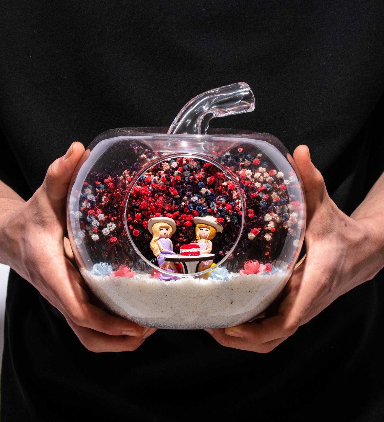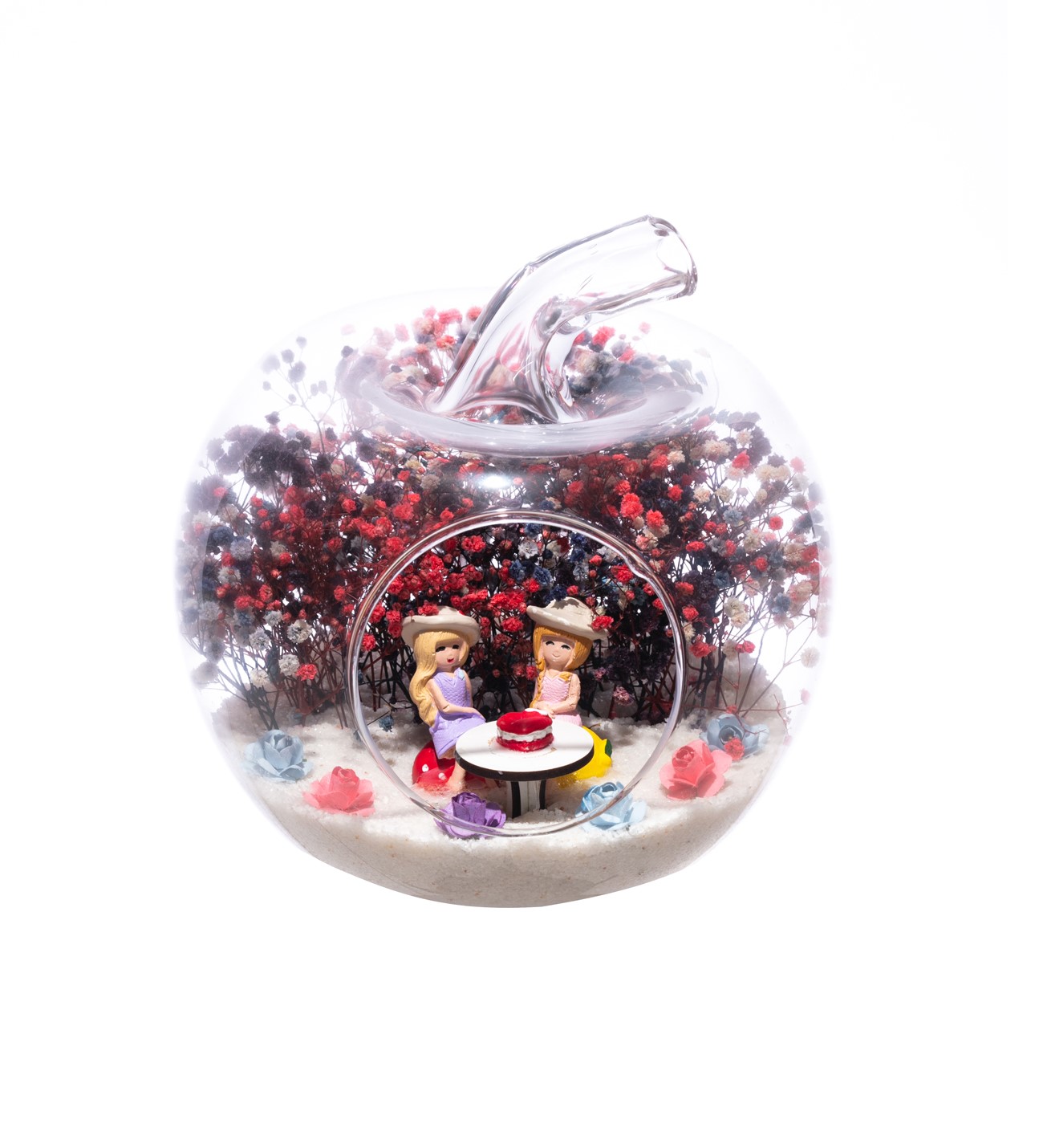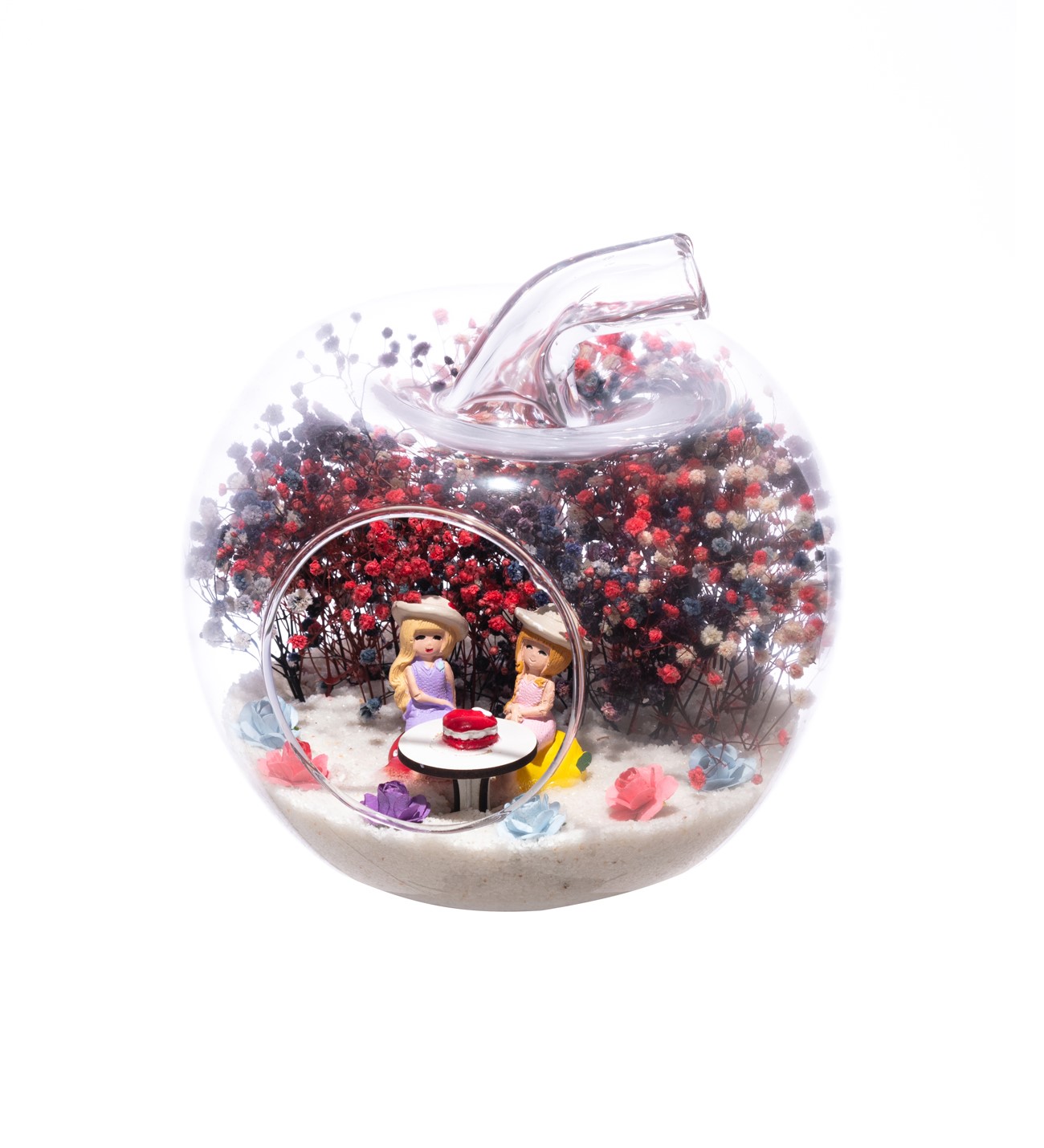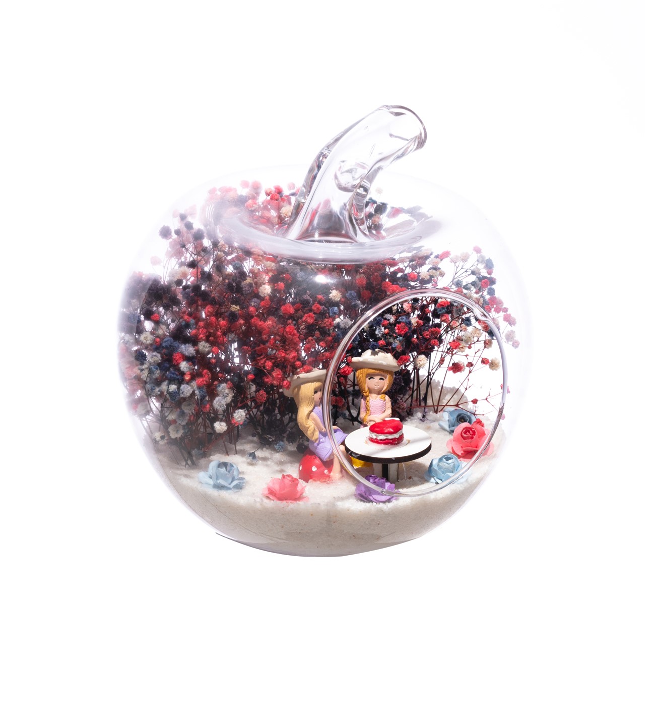 Küçük boy elma cam fanus içerisinde tasarladığımız bu çok güzel teraryum; beyaz kum, karışık renkli kurutulmuş bitkiler, renkli yapay mini güller, bir adet ahşap üzerinde pastasıyla doğum günü masası ve iki adet genç kadını simgeleyen objeler kullanılarak tamamlanmıştır. Ev ve ofis ortamlarının tamamında sergilenebilir teraryumun içinde, kurutulmuş bitkiler bulunduğundan hava alması önemlidir. Açık olan kısmının kapatılmaması veya büfe vb. kapalı alanlara konulmaması gereklidir. Özellikle her ortamda yıllarca, zevkle izlenebilecek özel bir teraryumdur. Yaklaşık Ölçüleri: 20x20cm NOT: Teraryumlarda kullanılan camlar, üfleme cam işçiliğiyle üretildiğinden bazı detaylarda farklılıklar gözlenebilir. Örneğin, sap kısmı ve ağız bitiş noktalarının her biri kendine özgüdür.