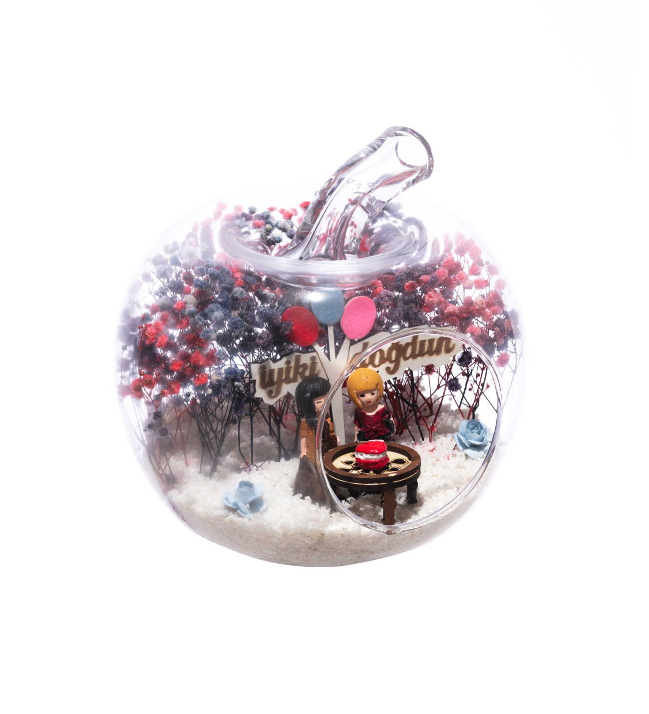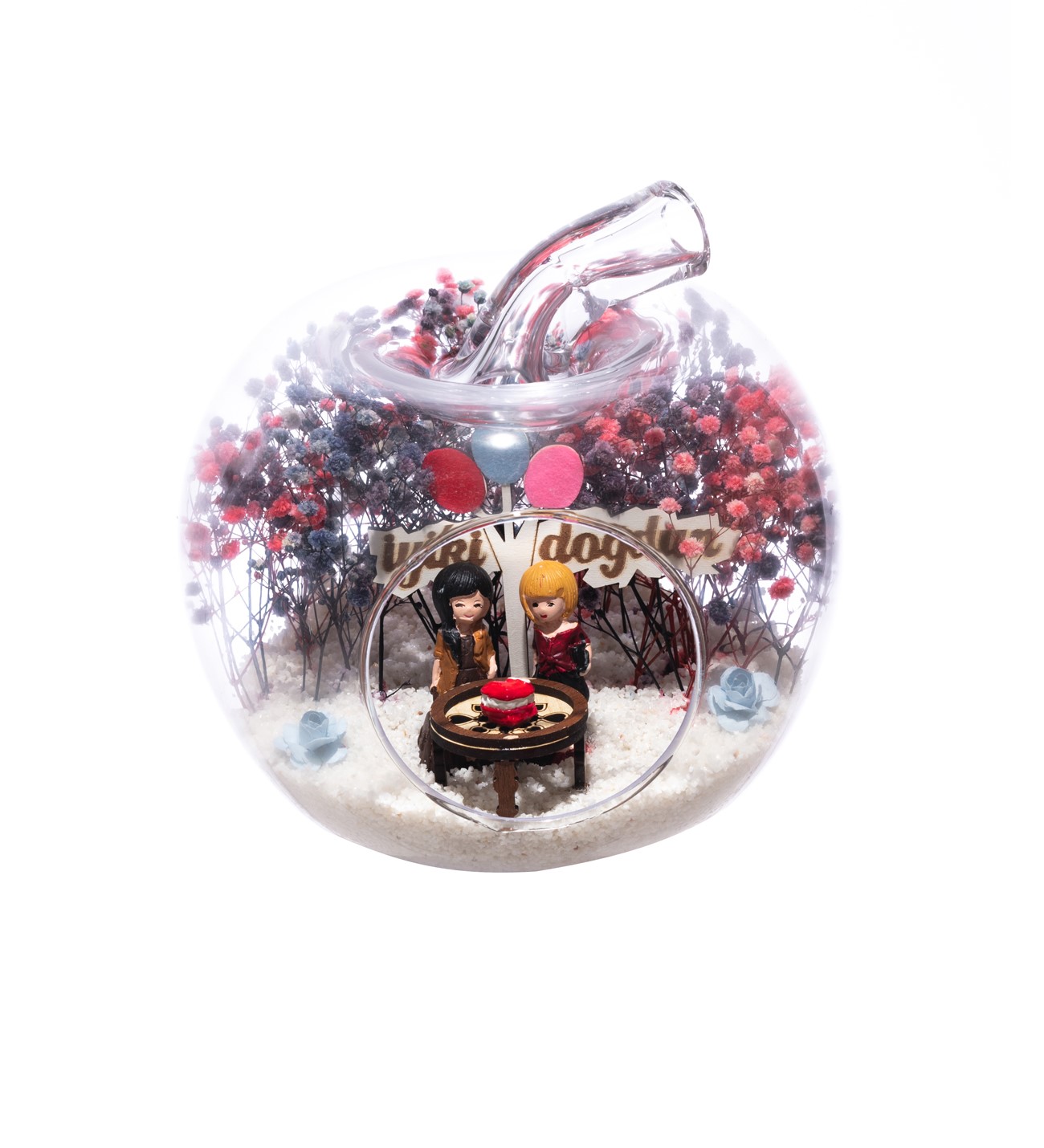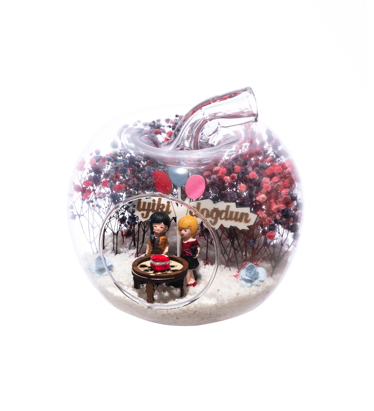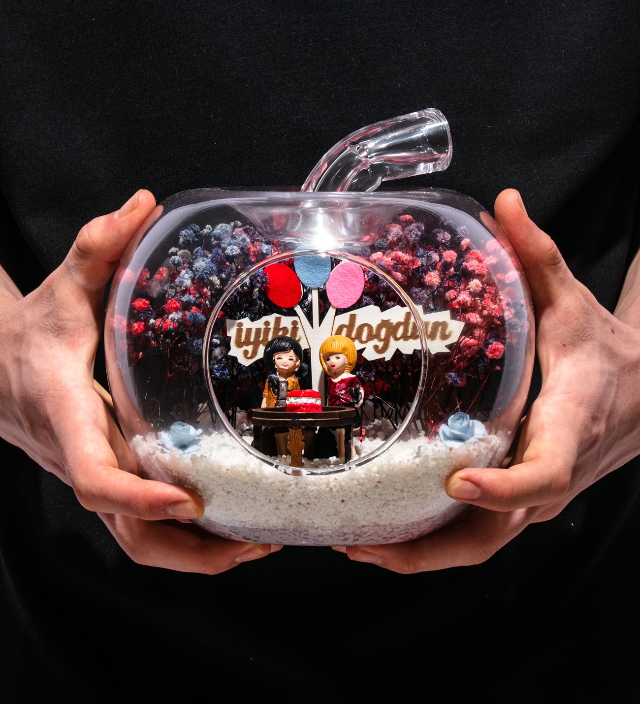 Küçük boy elma cam fanus içerisinde tasarladığımız bu çok güzel teraryum; beyaz kum, karışık renkli kurutulmuş bitkiler, yapay mini güller, bir adet otantik ahşap, üzerinde pastasıyla doğum günü masası, bira adet ahşap iyi ki doğdun yazılı balonlu tabela ve iki adet genç kadını simgeleyen objeler kullanılarak tamamlanmıştır. Ev ve ofis ortamlarının tamamında sergilenebilir teraryumun içinde, kurutulmuş bitkiler bulunduğundan hava alması önemlidir. Açık olan kısmının kapatılmaması veya büfe vb. kapalı alanlara konulmaması gereklidir. Özellikle her ortamda yıllarca, zevkle izlenebilecek özel bir teraryumdur. Yaklaşık Ölçüleri: 20x20cm NOT: Teraryumlarda kullanılan camlar, üfleme cam işçiliğiyle üretildiğinden bazı detaylarda farklılıklar gözlenebilir. Örneğin, sap kısmı ve ağız bitiş noktalarının her biri kendine özgüdür.