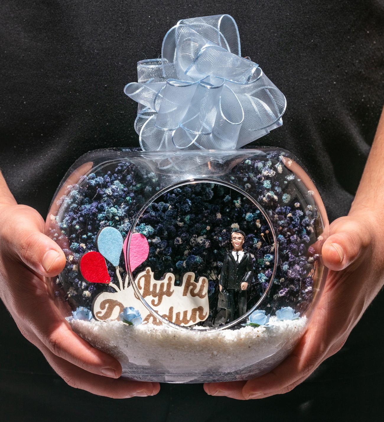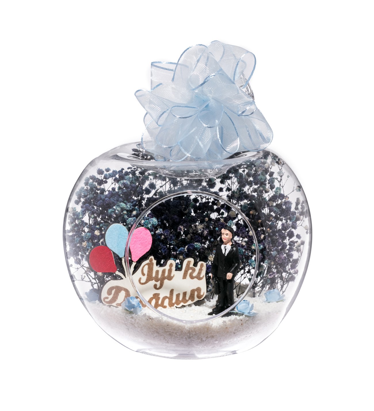 Küçük boy elma cam fanus içerisinde tasarladığımız bu kurdeleli teraryum; beyaz kum, yapay mini güller, kurutulmuş bitkilerle beraber bir adet İYİ Kİ DOĞDUN yazılı ahşap balonlu tabela ve bir adet erkek objeyle tamamlanmıştır. Ev ve ofis ortamlarının tamamında sergilenebilir teraryumun içinde, kurutulmuş bitkiler bulunduğundan hava alması önemlidir. Açık olan kısmının kapatılmaması veya büfe vb. kapalı alanlara konulmaması gereklidir. Özellikle her ortamda, zevkle izlenebilecek çok özel bir teraryumdur. Yaklaşık Ölçüleri: 20x20cm NOT: Teraryumlarda kullanılan camlar, üfleme cam işçiliğiyle üretildiğinden bazı detaylarda farklılıklar gözlenebilir. Örneğin, sap kısmı ve ağız bitiş noktalarının her biri kendine özgüdür.