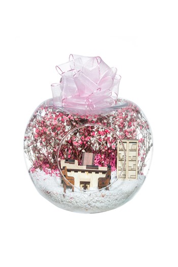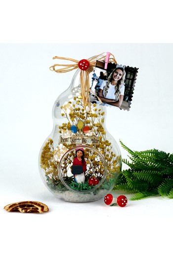 Küçük boy elma cam fanus içerisinde tasarladığımız bu teraryum; beyaz kum, yapay mini güller, kurutulmuş bitkilerle beraber bir adet İYİ Kİ DOĞDUN yazılı ahşap balonlu tabela ve bir adet erkek objeyle tamamlanmıştır. Ev ve ofis ortamlarının tamamında sergilenebilir teraryumun içinde, kurutulmuş bitkiler bulunduğundan hava alması önemlidir. Açık olan kısmının kapatılmaması veya büfe vb. kapalı alanlara konulmaması gereklidir. Özellikle her ortamda, zevkle izlenebilecek çok özel bir teraryumdur. Yaklaşık Ölçüleri: 20x20cm NOT: Teraryumlarda kullanılan camlar, üfleme cam işçiliğiyle üretildiğinden bazı detaylarda farklılıklar gözlenebilir. Örneğin, sap kısmı ve ağız bitiş noktalarının her biri kendine özgüdür.