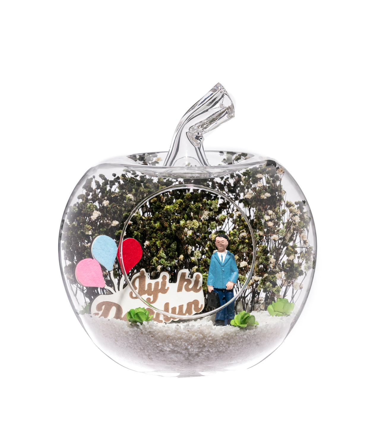 Küçük boy elma cam fanus içerisinde tasarladığımız bu teraryum; beyaz kum, yapay mini güller, kurutulmuş bitkilerle beraber bir adet İYİ Kİ DOĞDUN yazılı ahşap balonlu tabela ve bir adet erkek objeyle tamamlanmıştır. Ev ve ofis ortamlarının tamamında sergilenebilir teraryumun içinde, kurutulmuş bitkiler bulunduğundan hava alması önemlidir. Açık olan kısmının kapatılmaması veya büfe vb. kapalı alanlara konulmaması gereklidir. Özellikle her ortamda, zevkle izlenebilecek çok özel bir teraryumdur. Yaklaşık Ölçüleri: 20x20cm NOT: Teraryumlarda kullanılan camlar, üfleme cam işçiliğiyle üretildiğinden bazı detaylarda farklılıklar gözlenebilir. Örneğin, sap kısmı ve ağız bitiş noktalarının her biri kendine özgüdür.