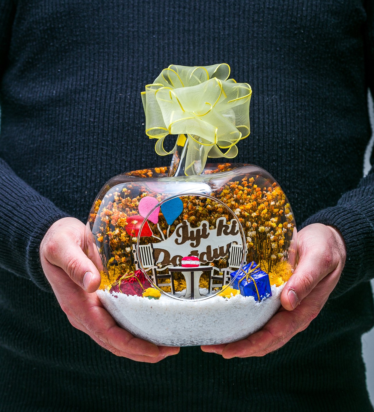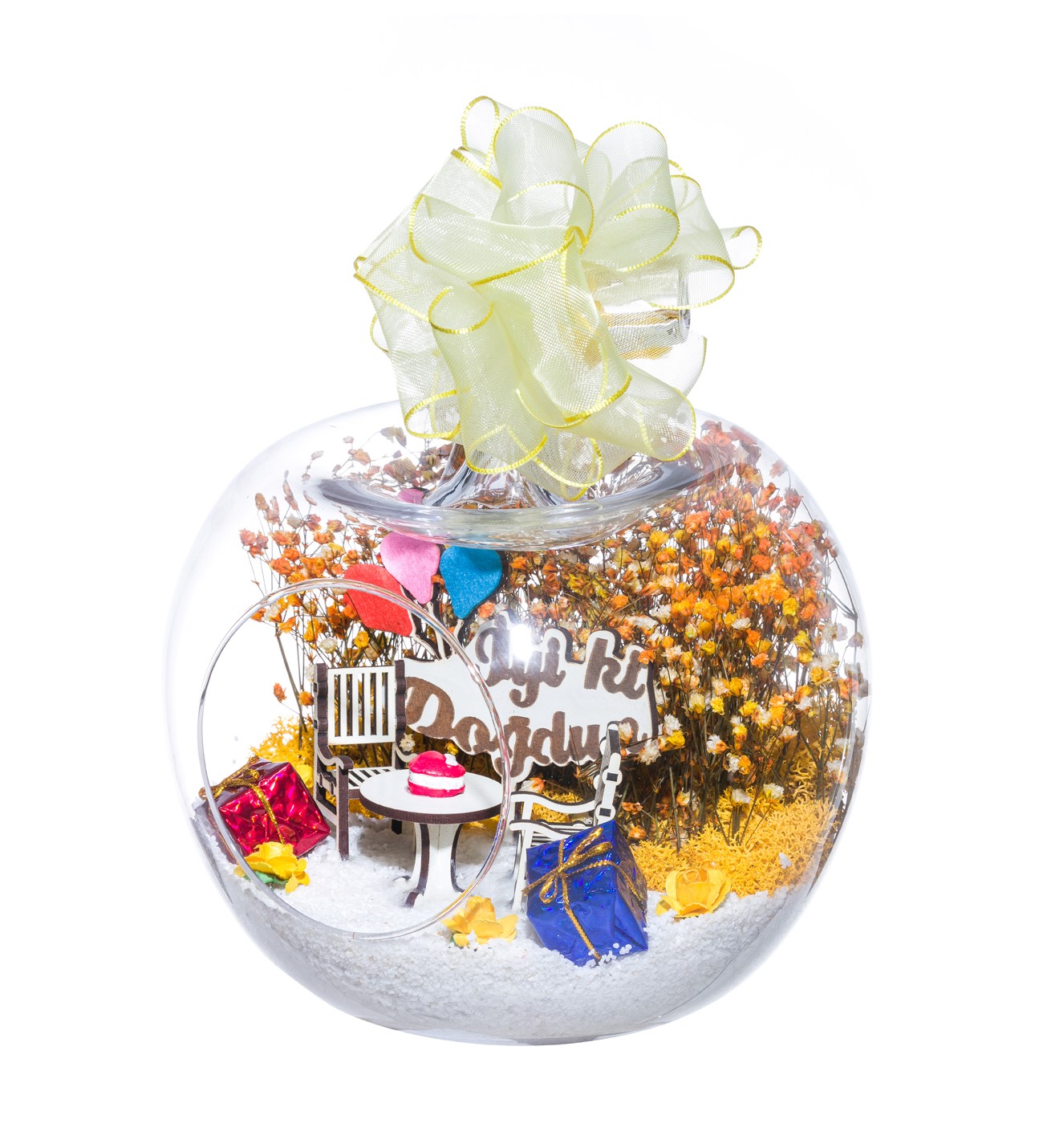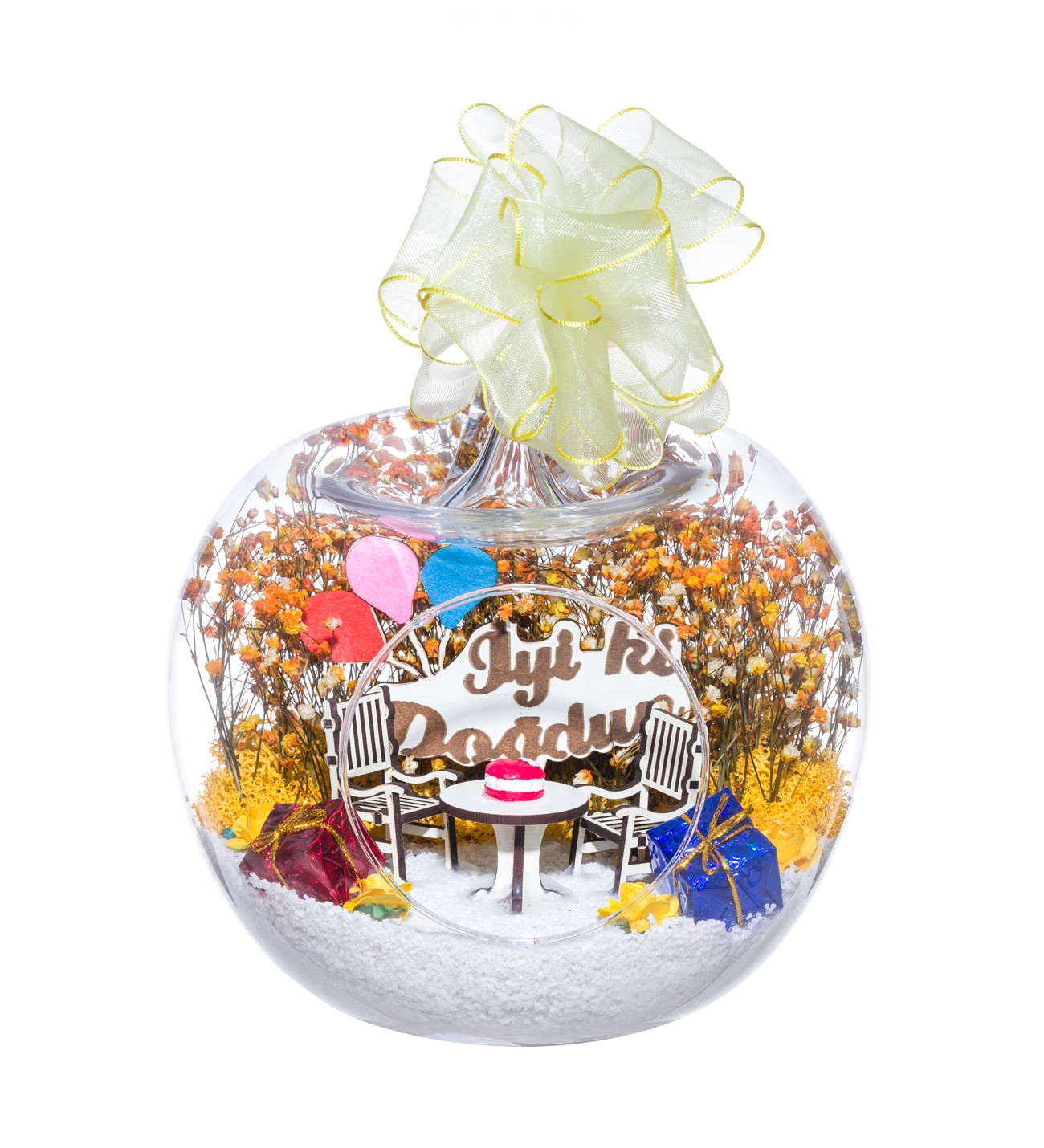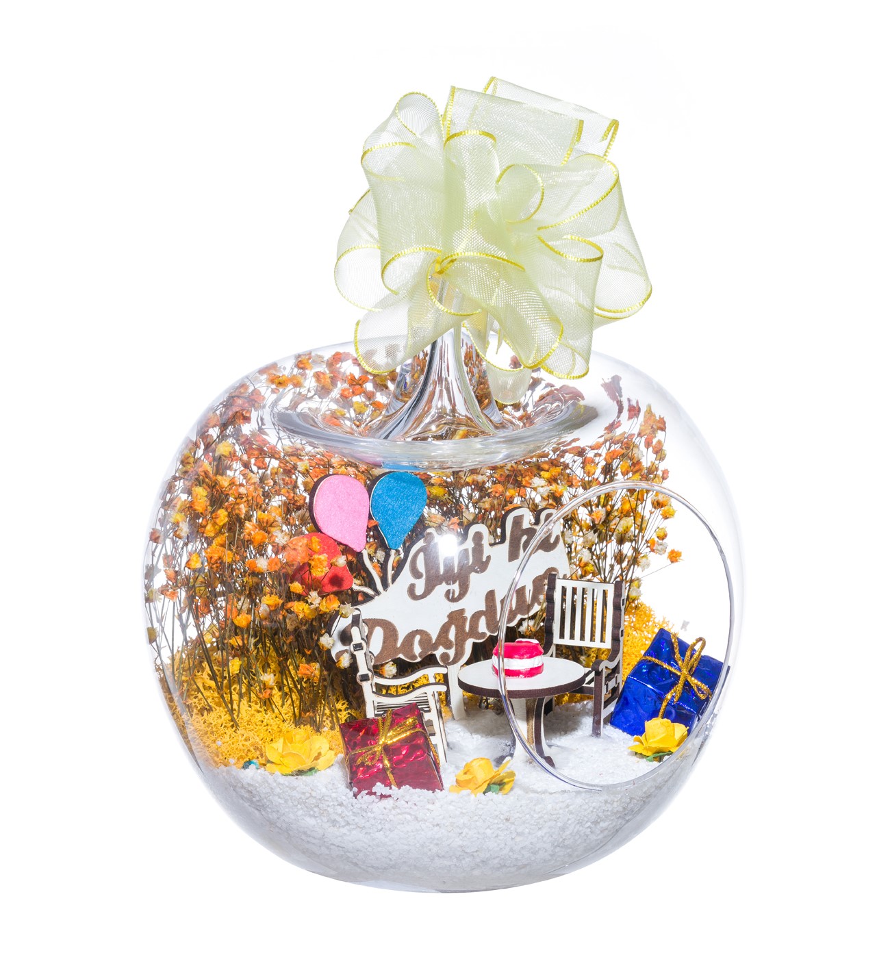 Kurdele takılı küçük boy elma cam fanus içerisinde tasarladığımız bu özel teraryum; beyaz kum, şoklanmış yosunlar, kurutulmuş bitkiler, mini yapay güller, bir adet üzerinde doğum günü pastası bulunan ahşap bahçe sehpa, iki adet ahşap oymalı bahçe sandalyesi, bir adet üzerinde İYİ Kİ DOĞDUN yazılı ahşap balonlu tabela ve hediye paketlerini simgeleyen objelerle tamamlanmıştır. Ev ve ofis ortamlarının tamamında sergilenebilir teraryumun içinde, kurutulmuş ve şoklanmış bitkiler bulunduğundan hava alması önemlidir. Açık olan kısmının kapatılmaması veya büfe vb. kapalı alanlara konulmaması gereklidir. Özellikle her ortamda yıllarca, zevkle izlenebilecek özel bir teraryumdur. Yaklaşık Ölçüleri: 20x20cm NOT: Teraryumlarda kullanılan camlar, üfleme cam işçiliğiyle üretildiğinden bazı detaylarda farklılıklar gözlenebilir. Örneğin, sap kısmı ve ağız bitiş noktalarının her biri kendine özgüdür.